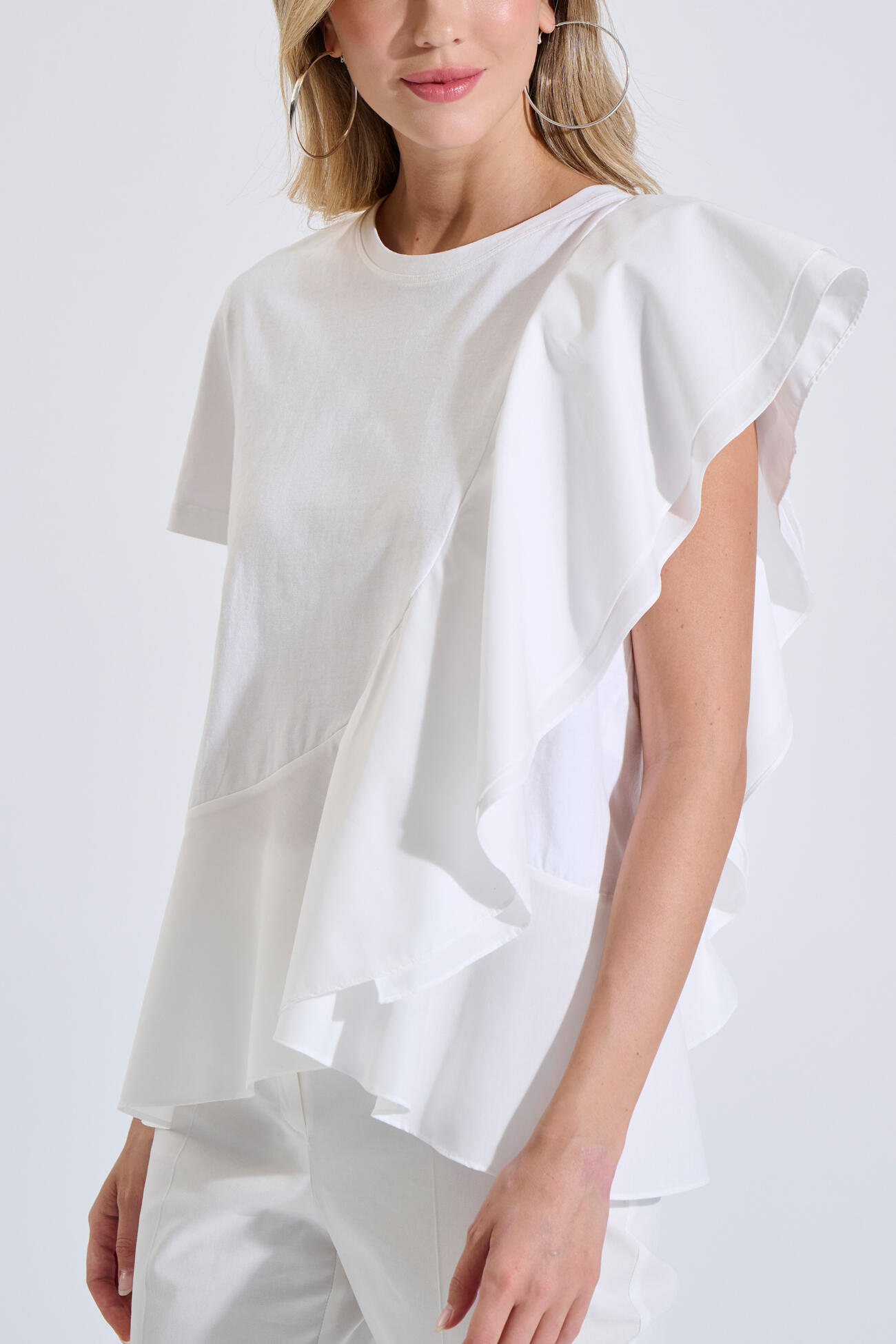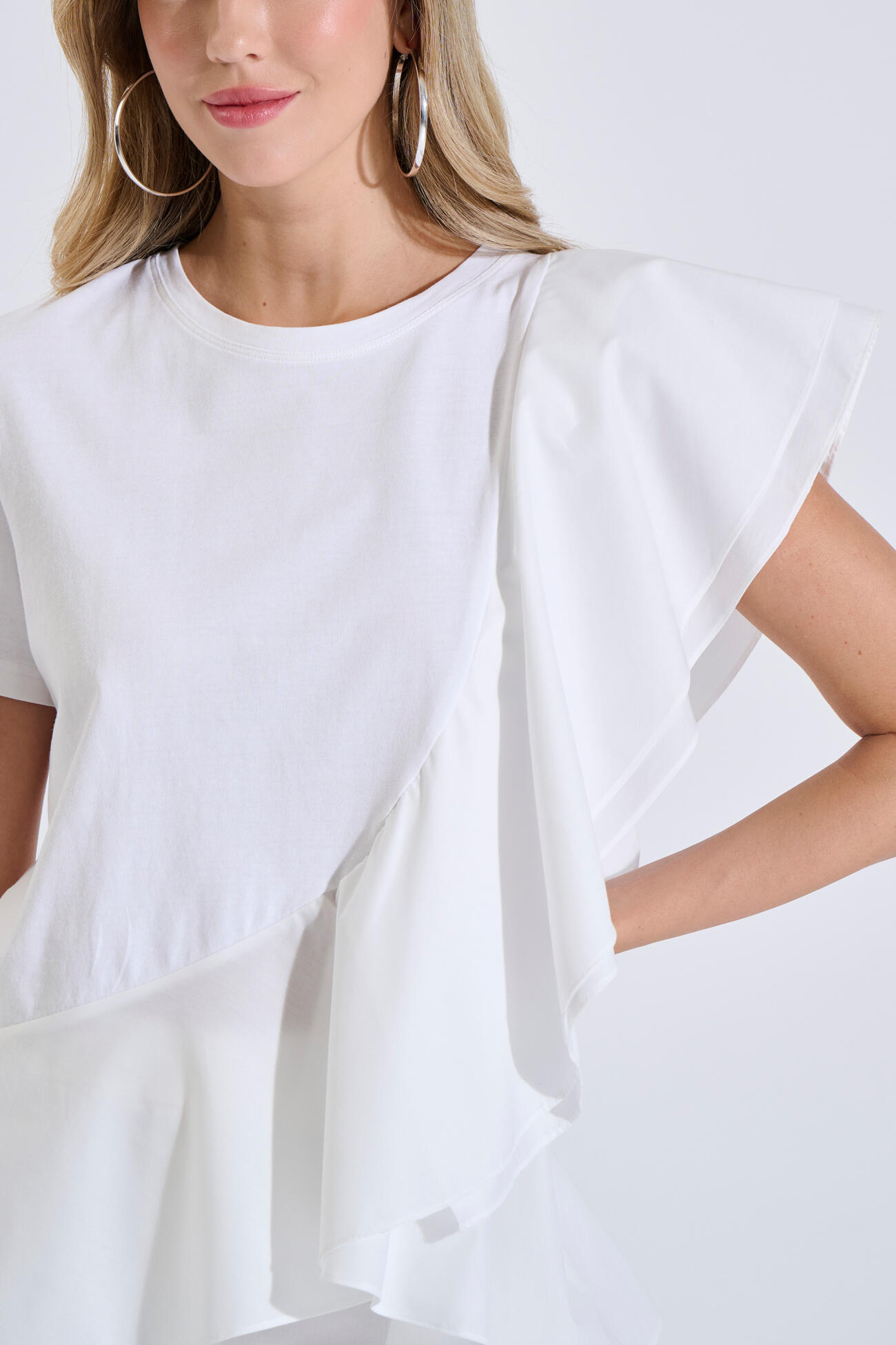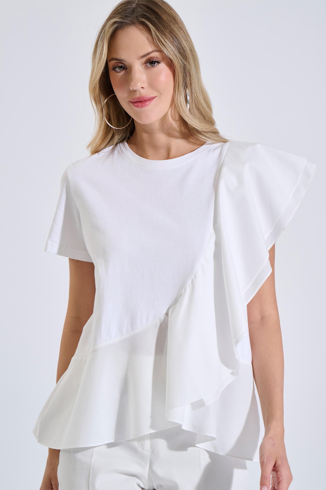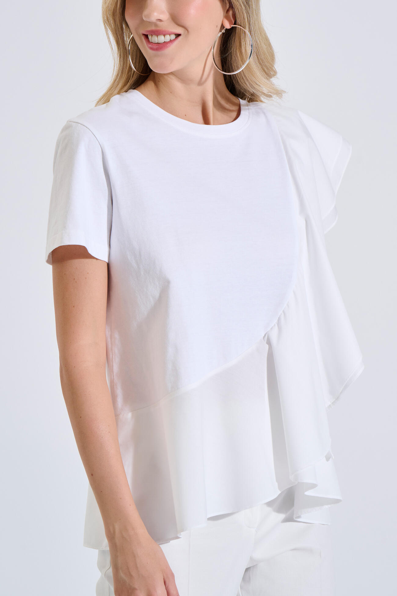Μπλούζα βαμβακερή σε άνετη γραμμή με στρογγυλή λαιμόκοψη και κοντό μανίκι. Διαθέτει συνδυασμό δύο υφασμάτων και ασύμμετρο βολάν που χαρίζει κίνηση και ιδιαίτερο χαρακτήρα.