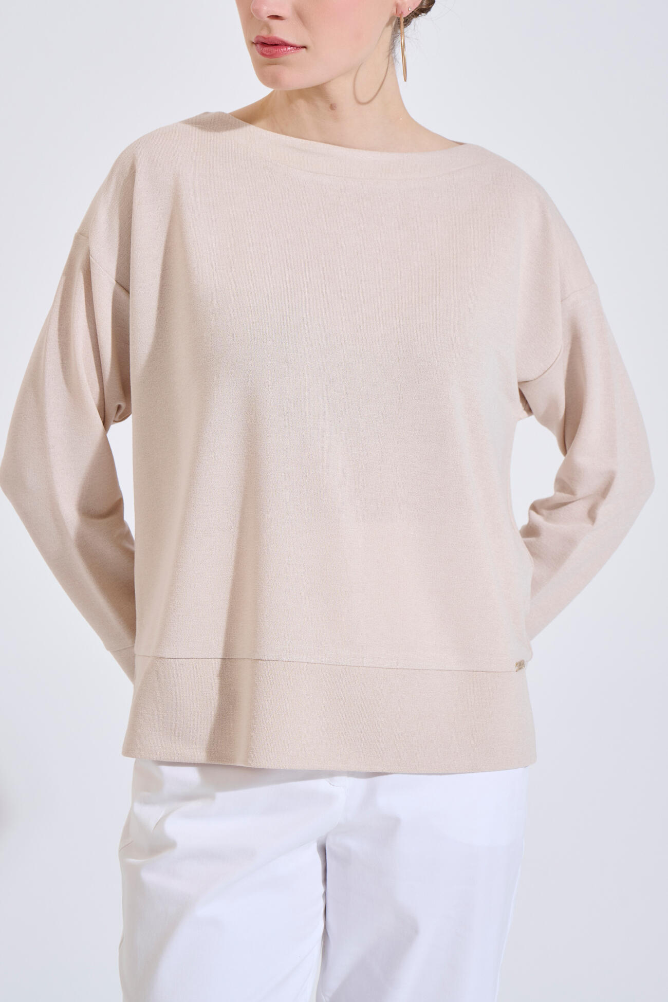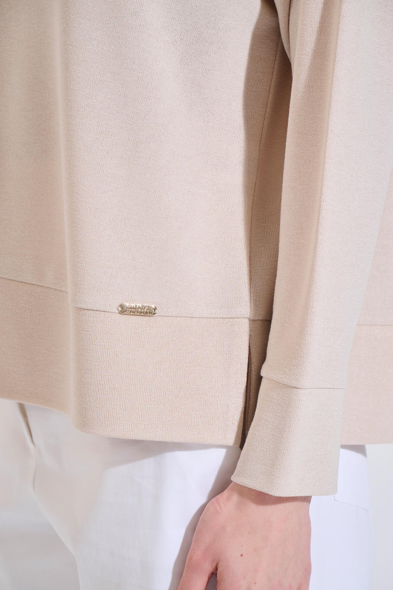 Πλεκτή μπλούζα σε άνετη γραμμή, στρογγυλή λαιμόκοψη και μακρύ μανίκι. Διαθέτει ανοίγματα στο πλάι και διακριτικό μεταλλικό στοιχείο BILL COST.