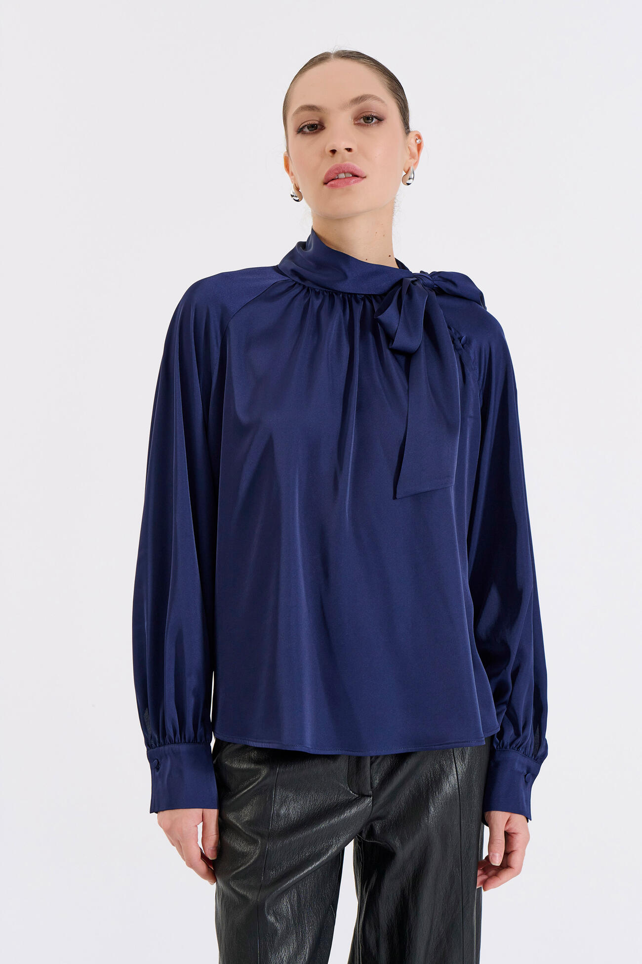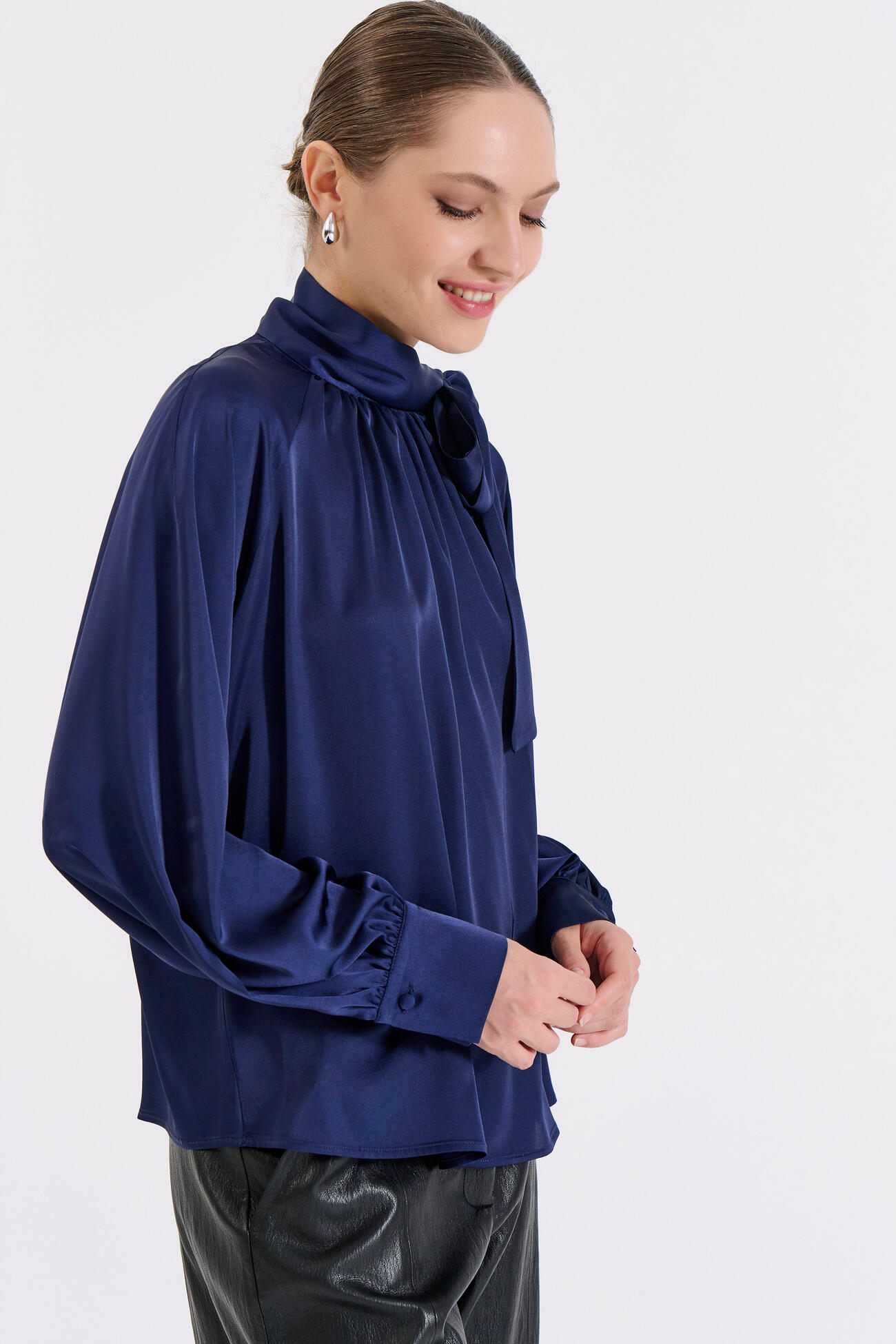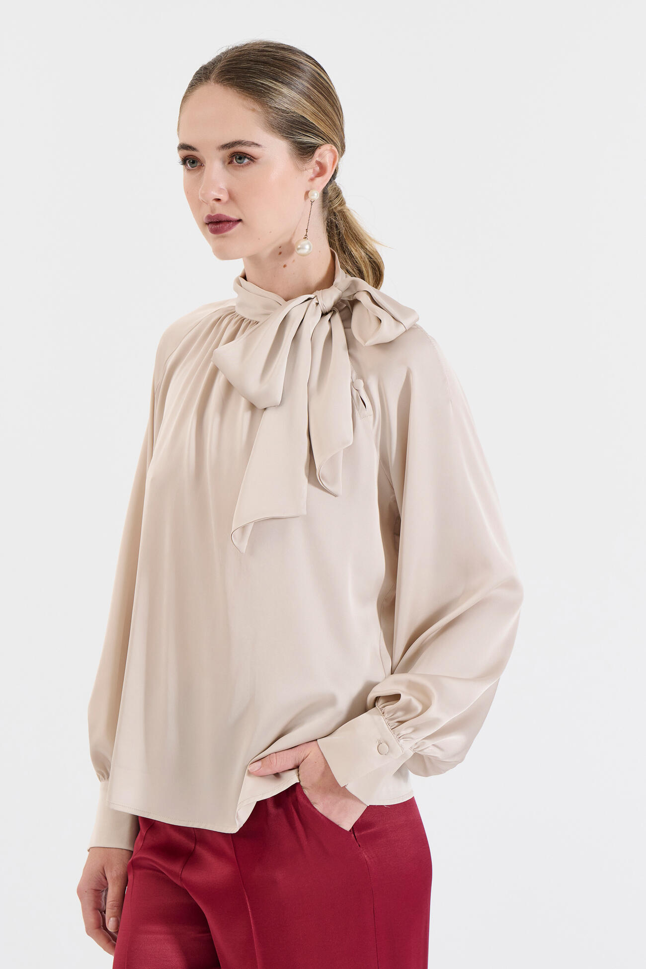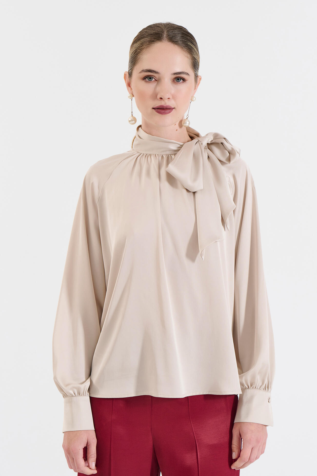 Σατέν μπλούζα με διακριτική λάμψη και δέσιμο φιόγκο στη λαιμόκοψη. Διαθέτει κουμπιά στο πλάι και μακριά μανίκια με μανσέτα, συνδυάζοντας κομψότητα και μοντέρνο χαρακτήρα. Ιδανική επιλογή για chic εμφανίσεις από το πρωί έως το βράδυ.