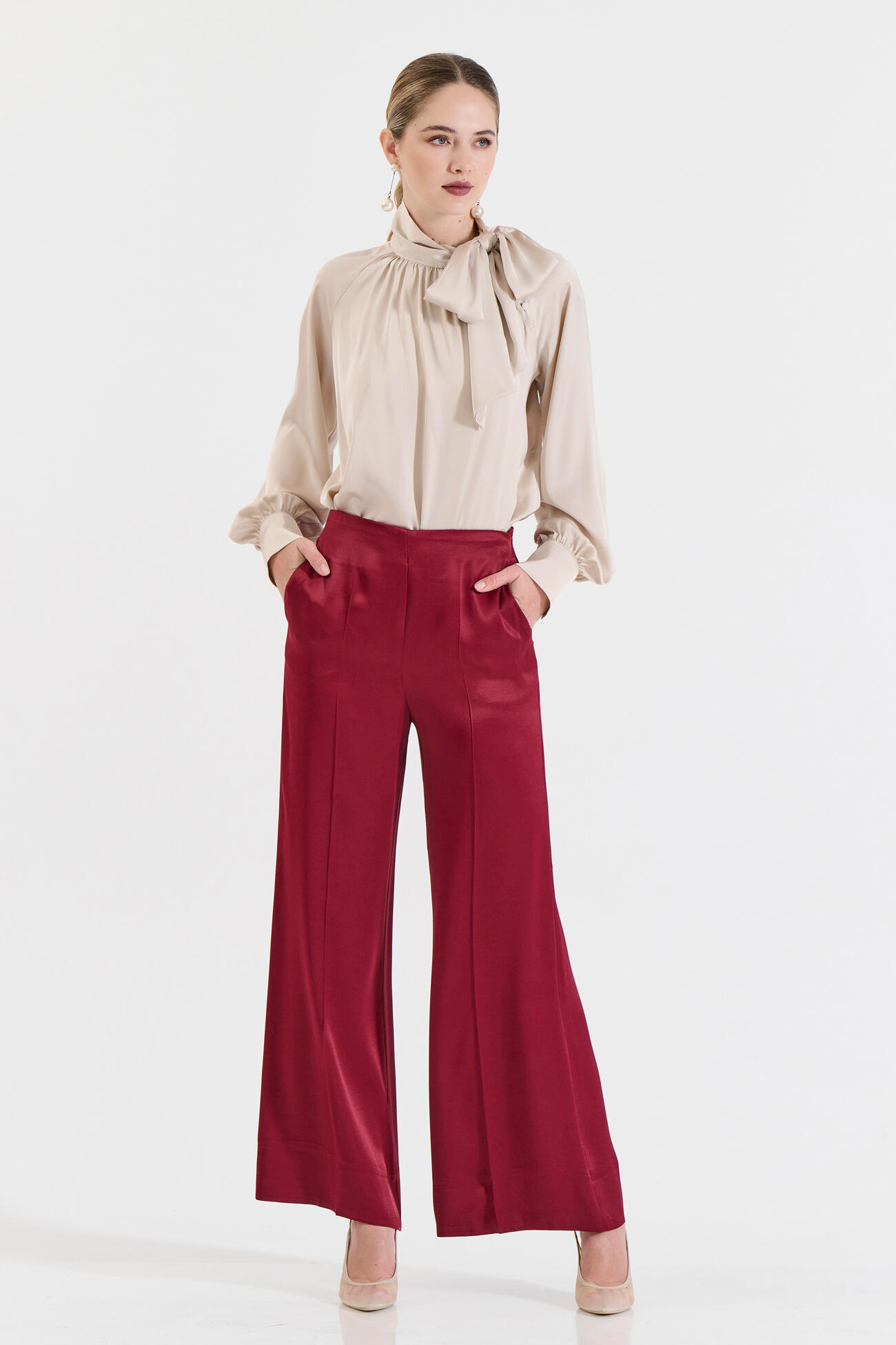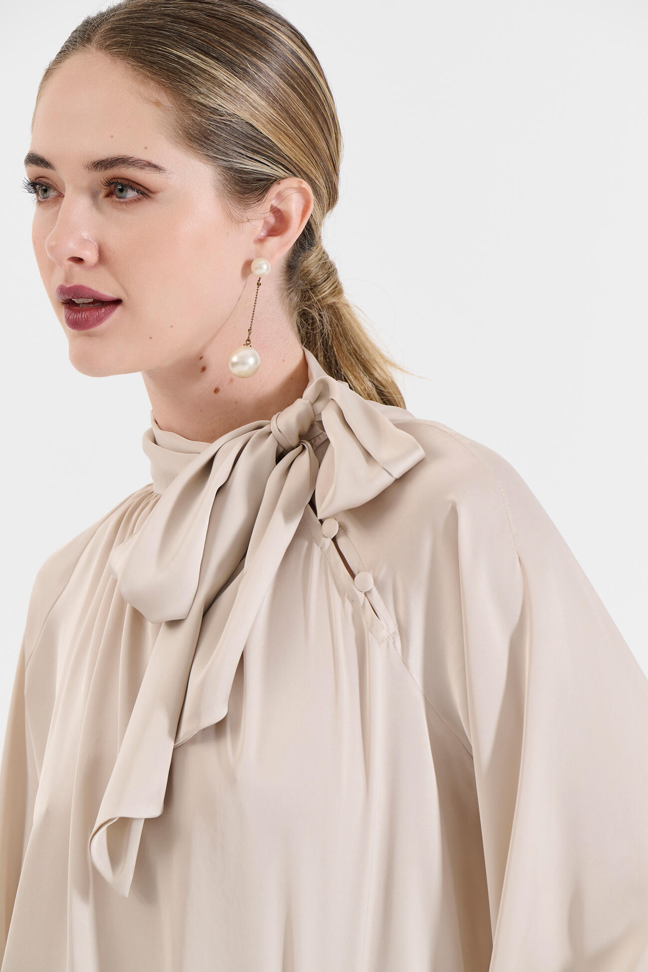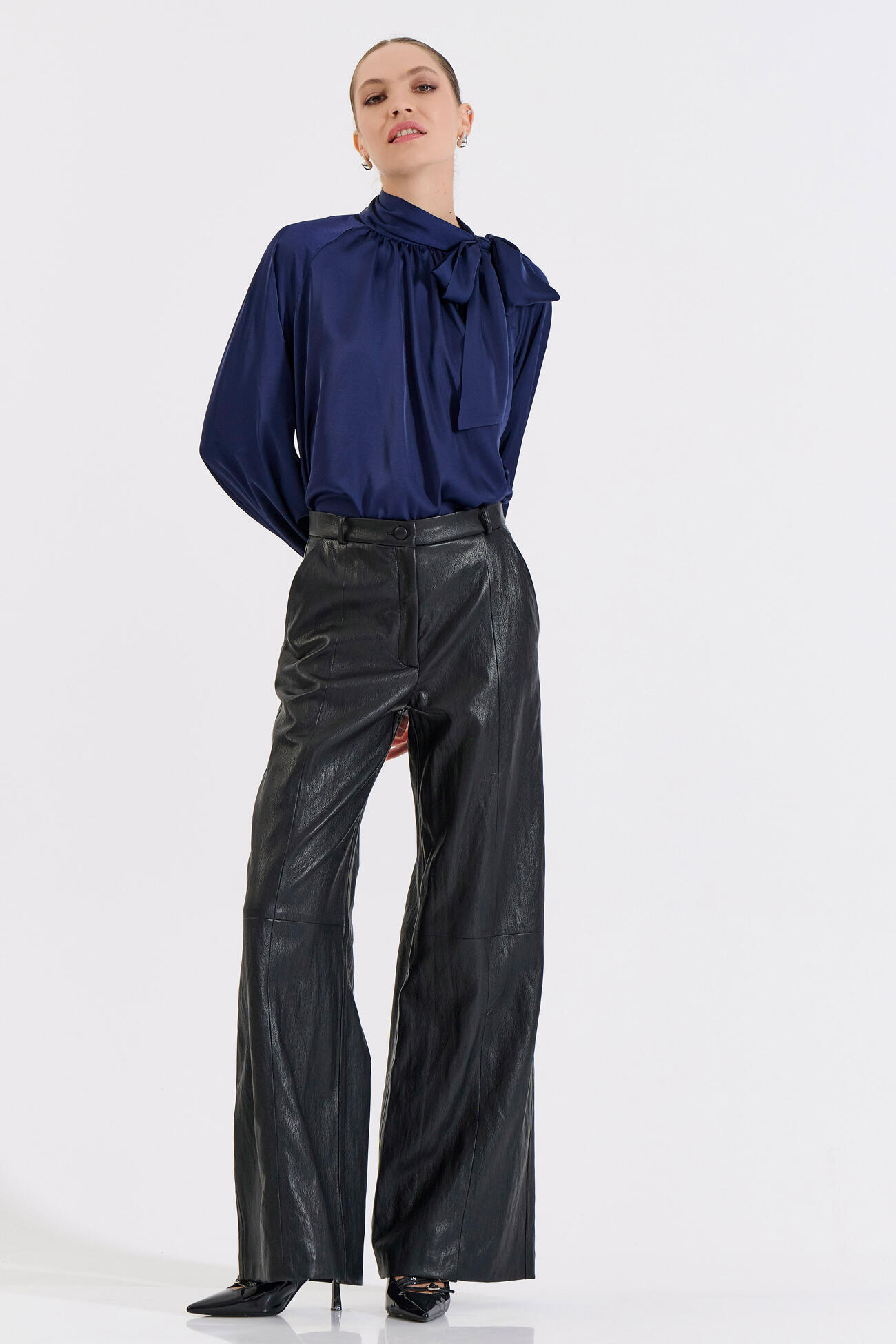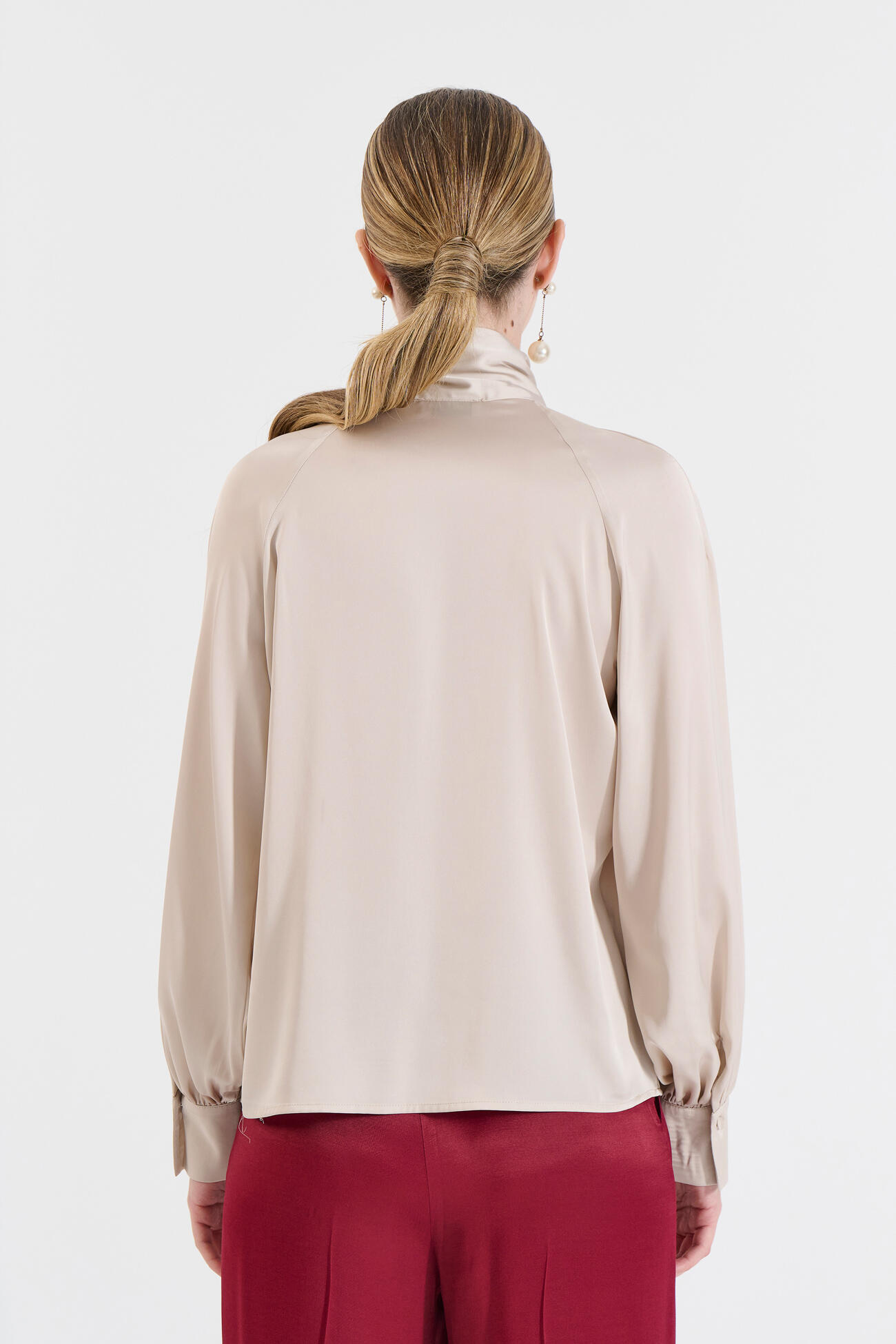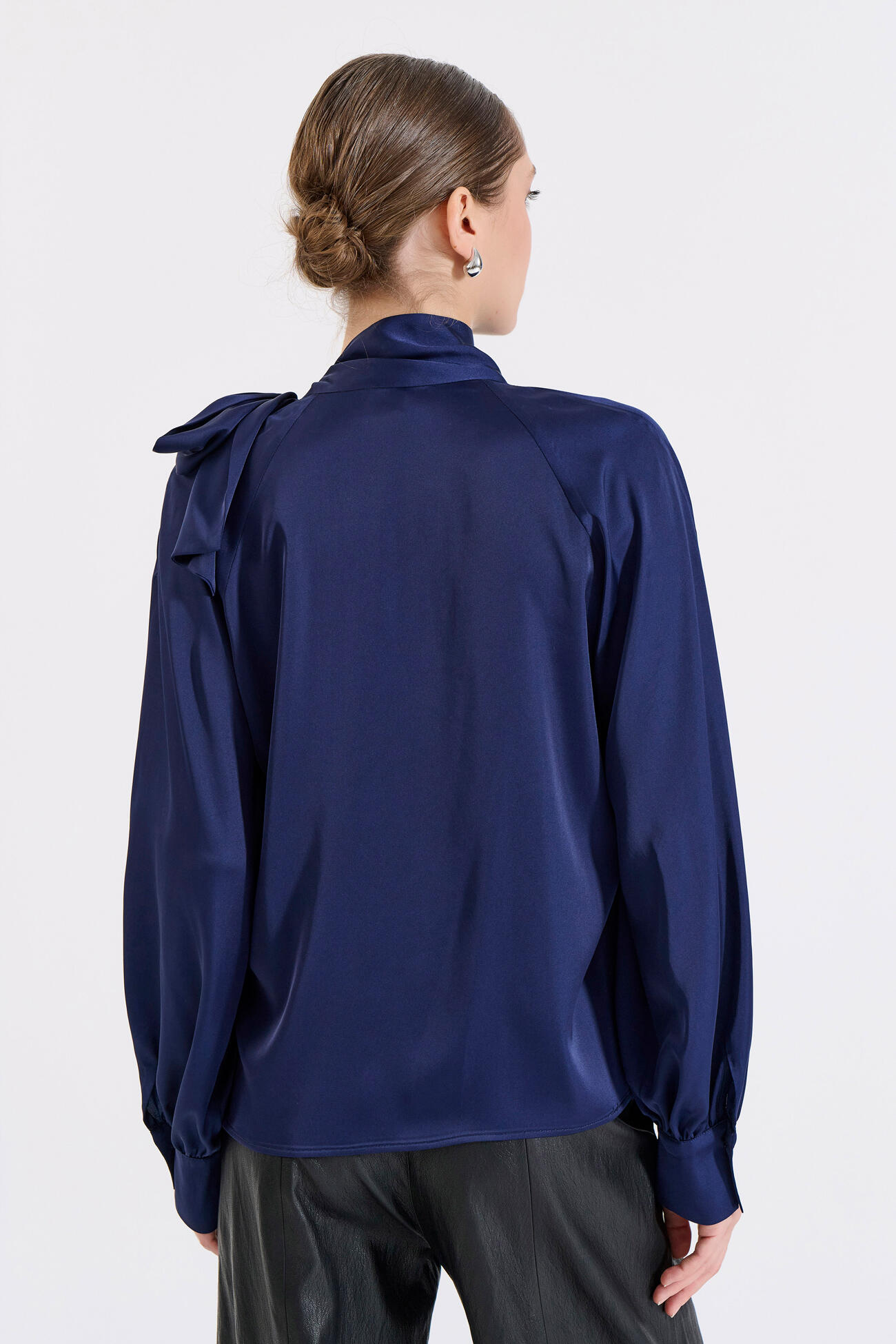 Σατέν μπλούζα με διακριτική λάμψη και δέσιμο φιόγκο στη λαιμόκοψη. Διαθέτει κουμπιά στο πλάι και μακριά μανίκια με μανσέτα, συνδυάζοντας κομψότητα και μοντέρνο χαρακτήρα. Ιδανική επιλογή για chic εμφανίσεις από το πρωί έως το βράδυ.