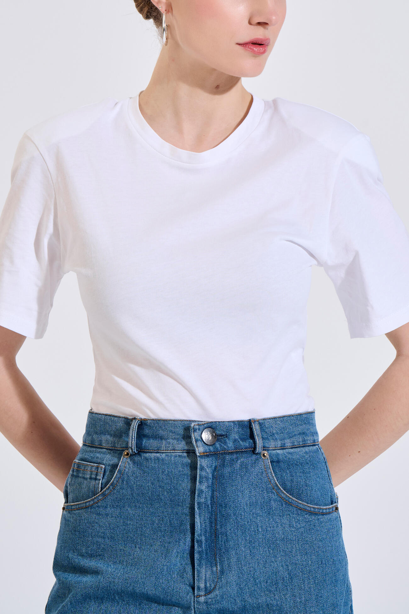 Βαμβακερή μπλούζα σε minimal γραμμή με στρογγυλή λαιμόκοψη και ενσωματωμένες βάτες στους ώμους.