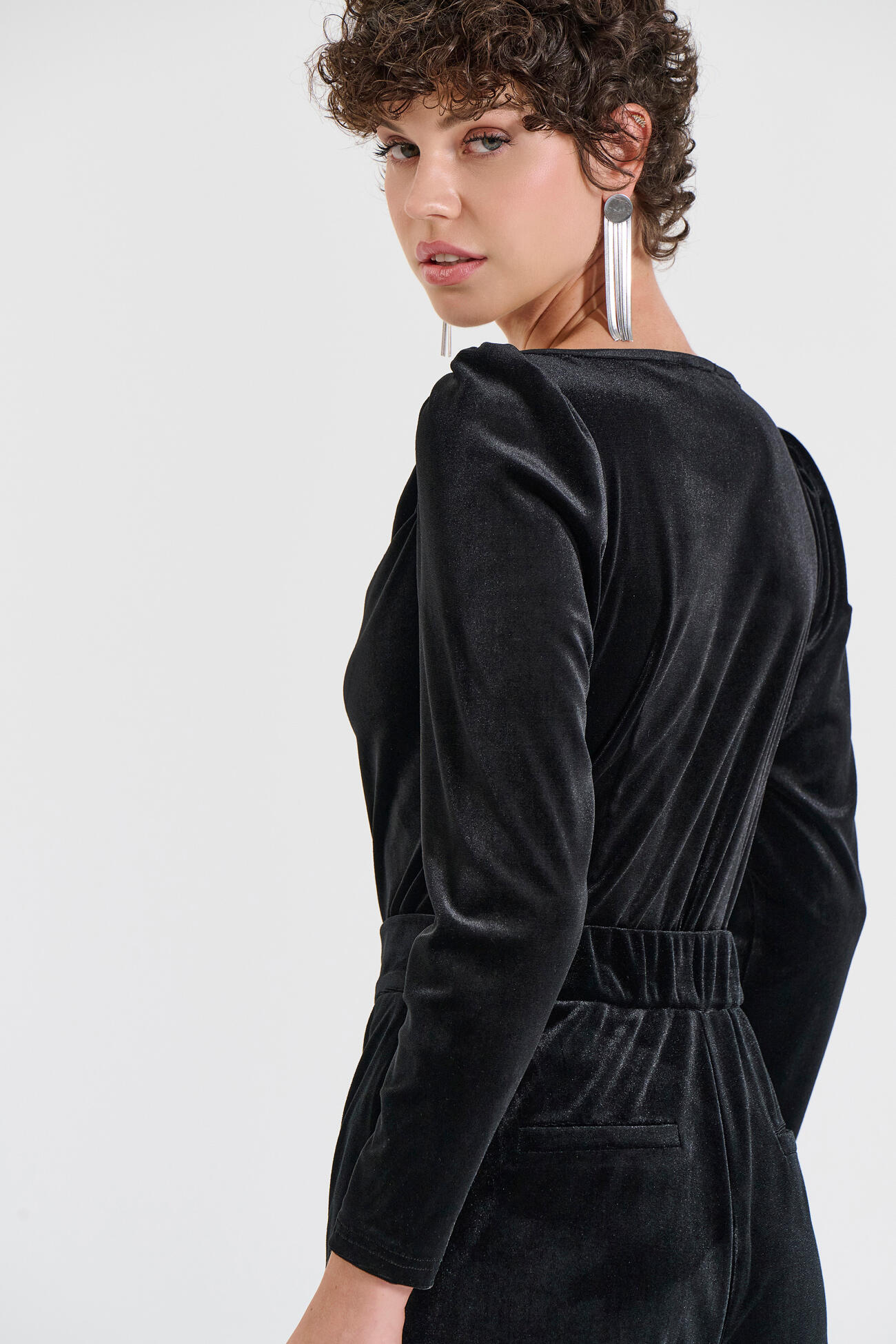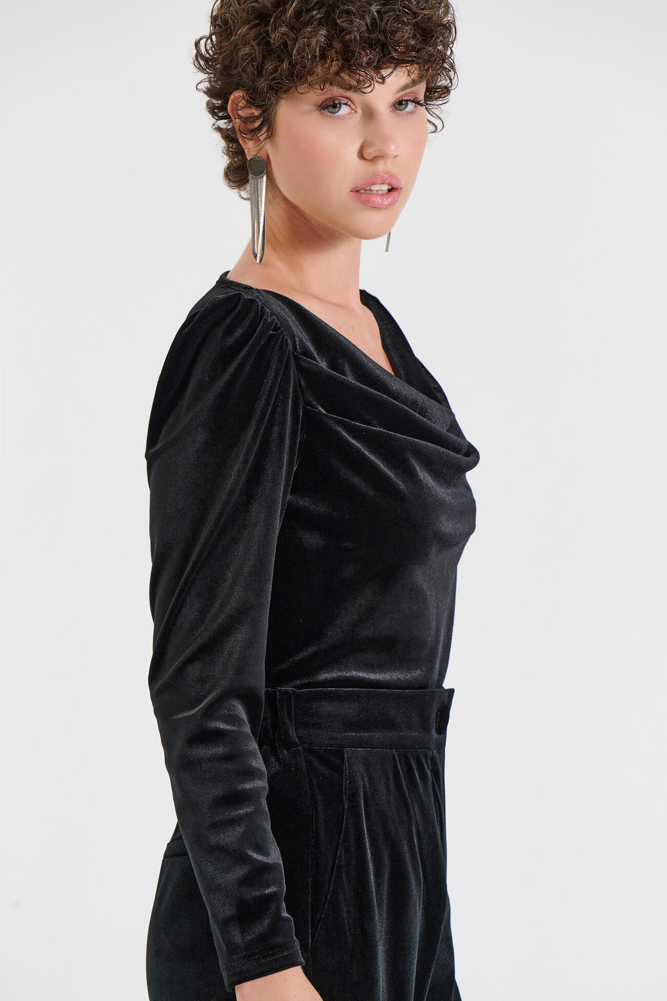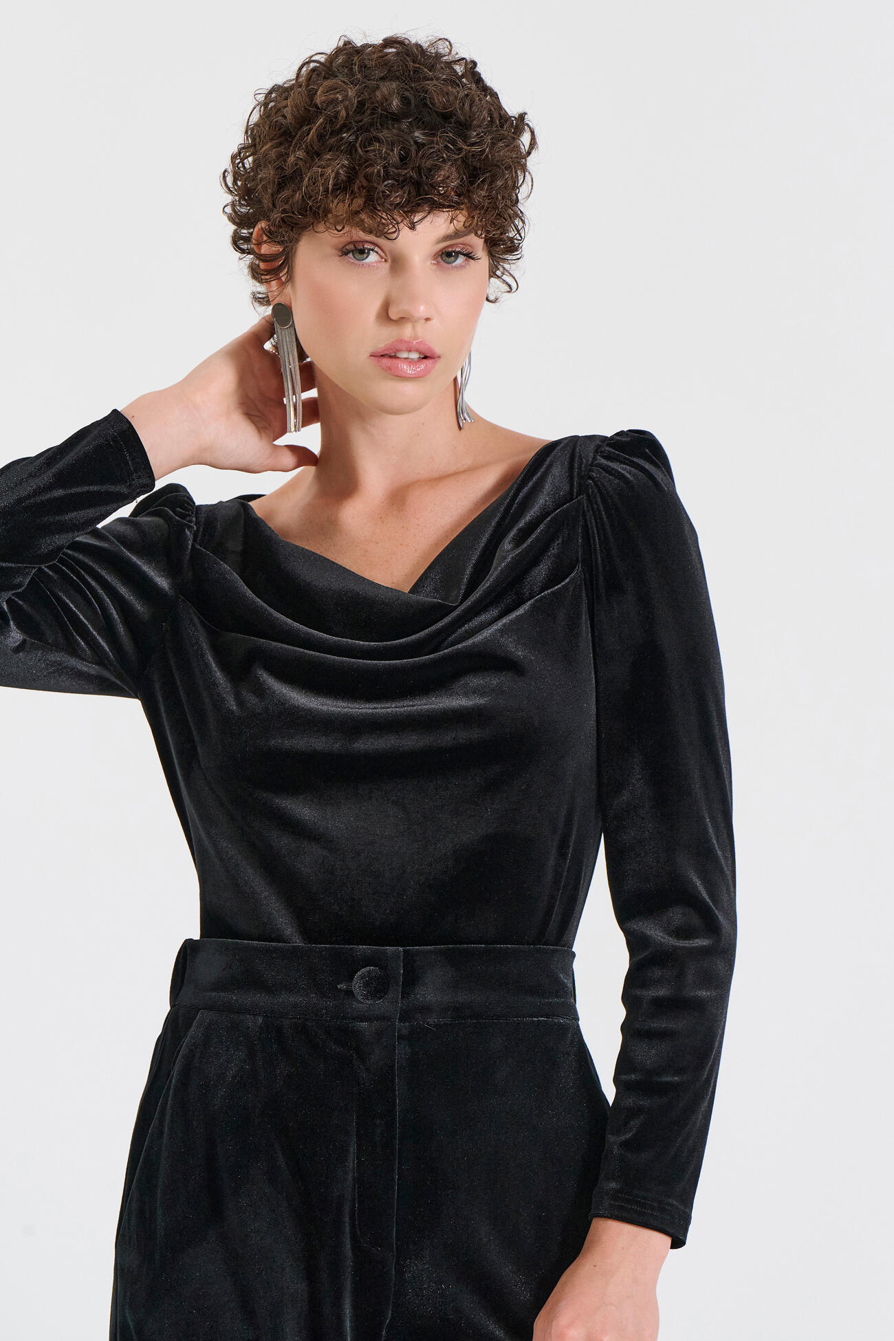 Κομψή μπλούζα από απαλή βελούδινη υφή, με εντυπωσιακή ντραπέ λαιμόκοψη που δημιουργεί elegant κίνηση στο ντεκολτέ. Διαθέτει μακριά μανίκια και ελαφριά σούρα στους ώμους για πιο θηλυκή και refined γραμμή. Ένα σύγχρονο κομμάτι που συνδυάζεται εύκολα με φούστες ή παντελόνια, ιδανικό για βραδινές και formal εμφανίσεις.