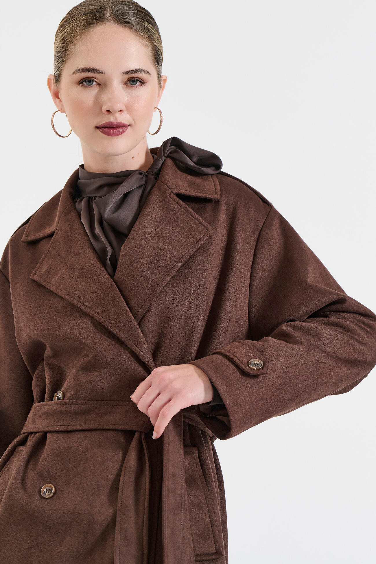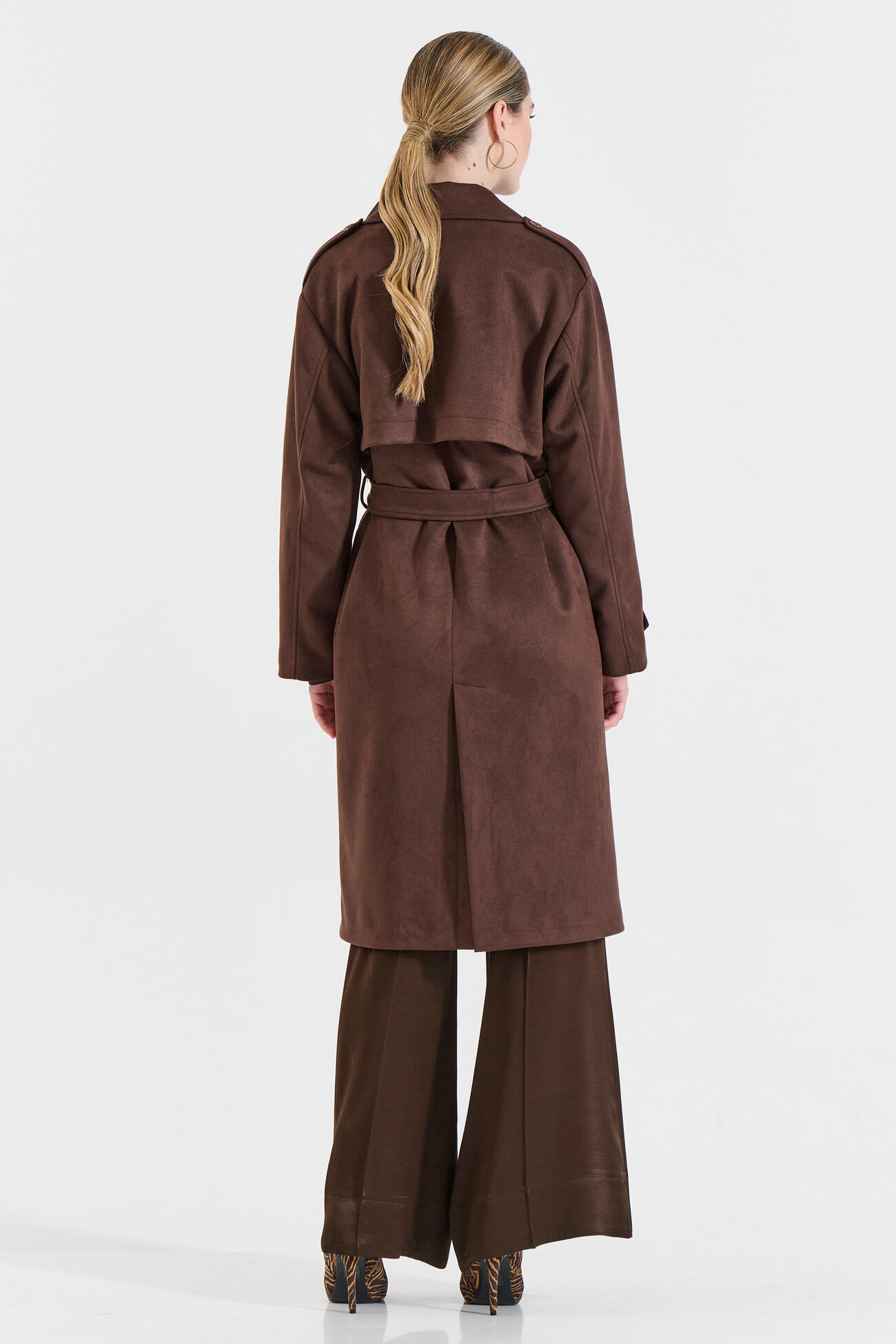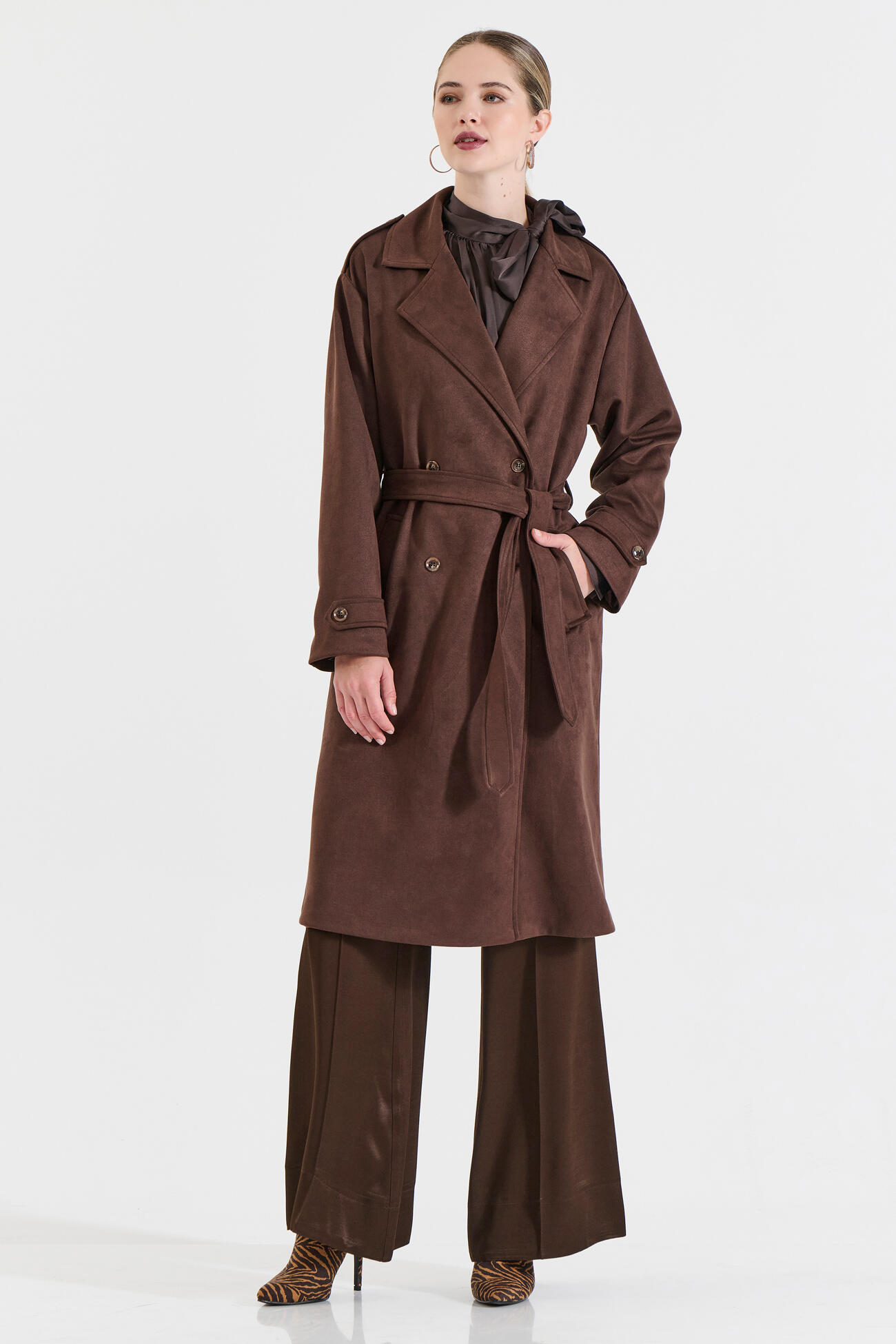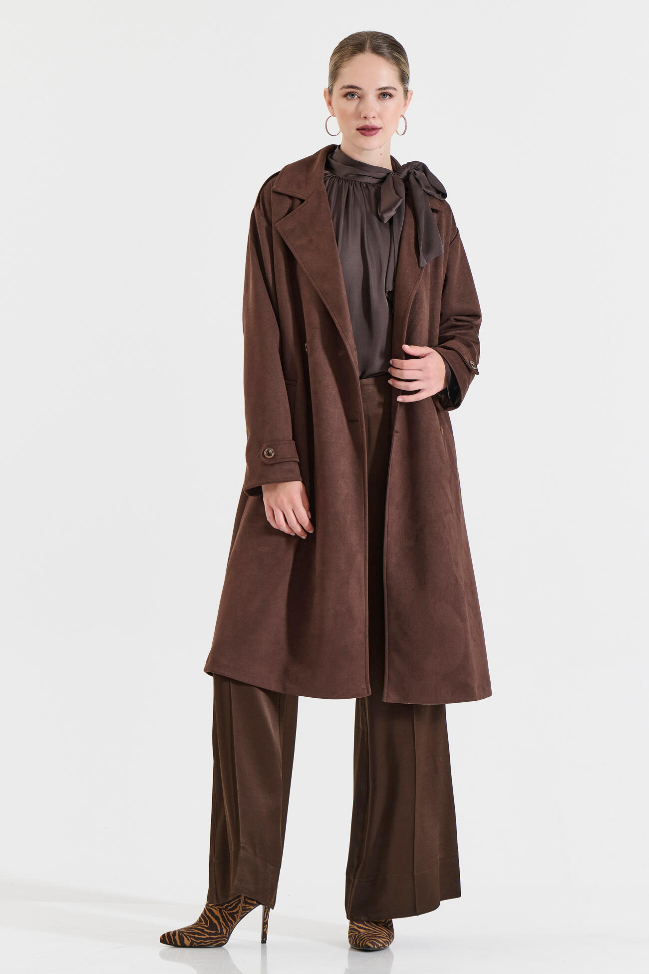 Κομψή καπαρντίνα με υφή σουέτ που χαρίζει απαλή αίσθηση και διακριτική πολυτέλεια. Διαθέτει πέτο γιακά, ζώνη στη μέση για ρυθμιζόμενη εφαρμογή και κουμπιά στο μπροστινό μέρος. Ένα διαχρονικό κομμάτι που ολοκληρώνει κάθε εμφάνιση με στιλ και κομψότητα, από το πρωί έως το βράδυ.