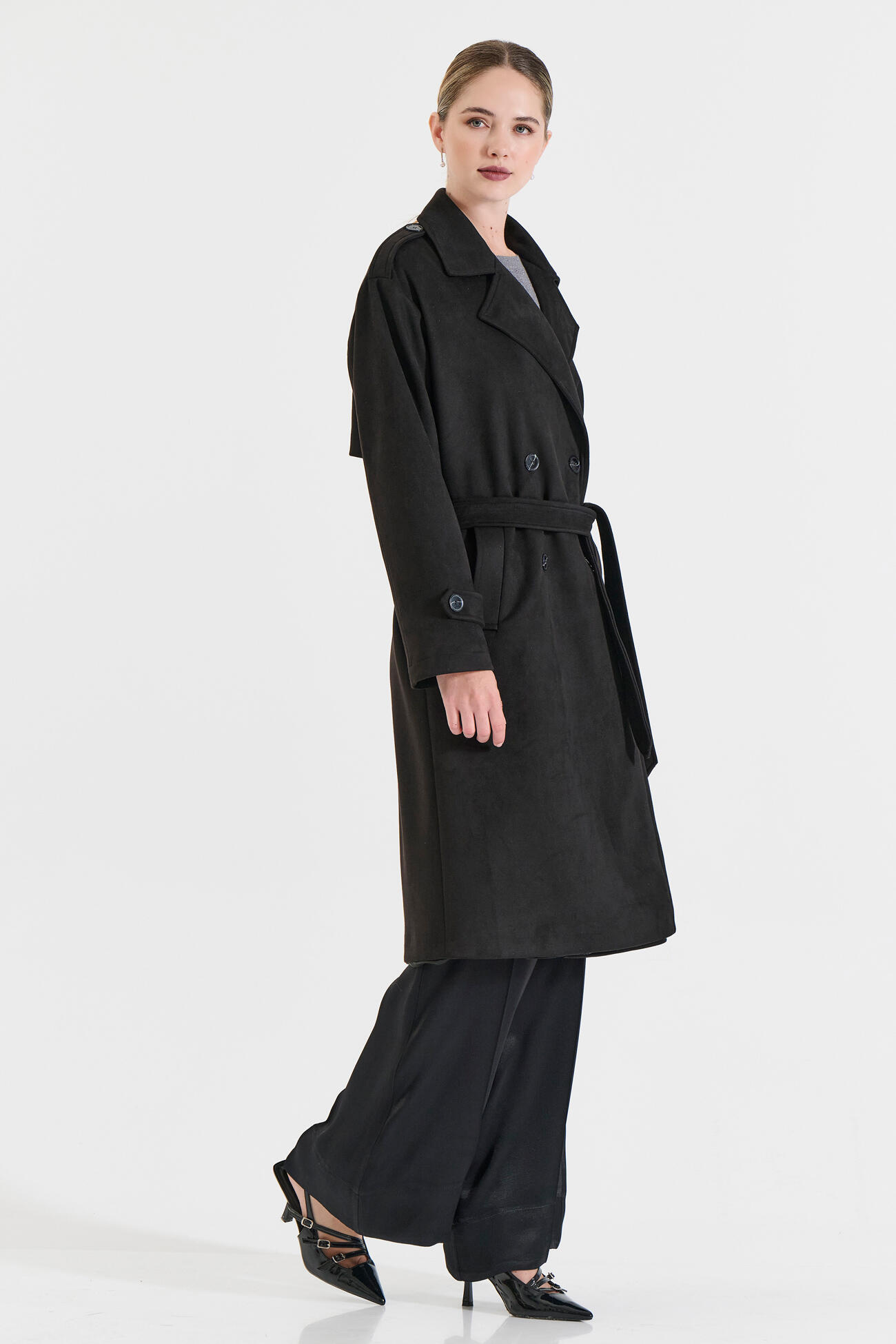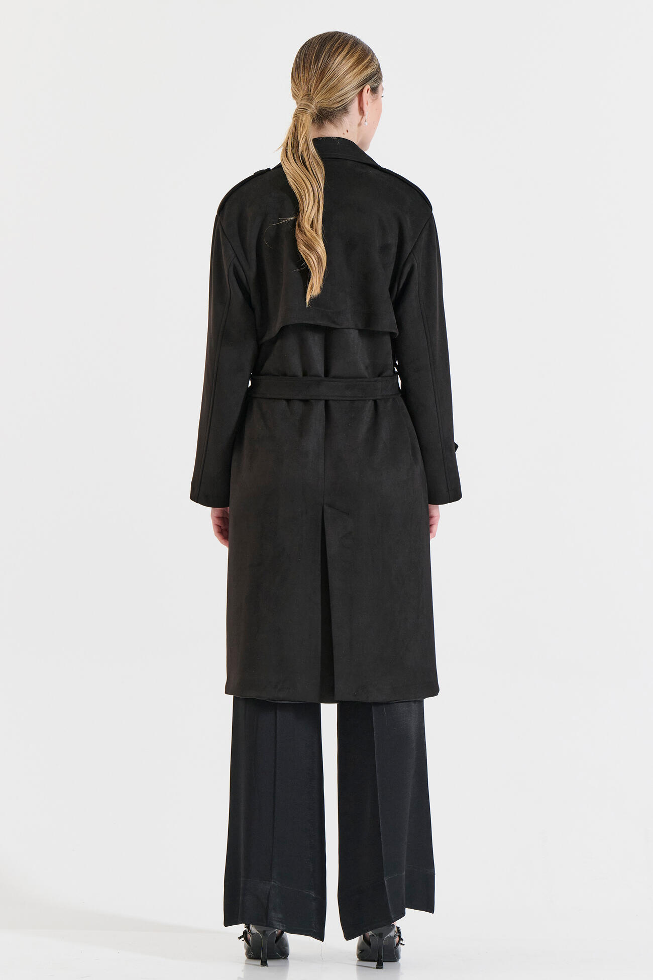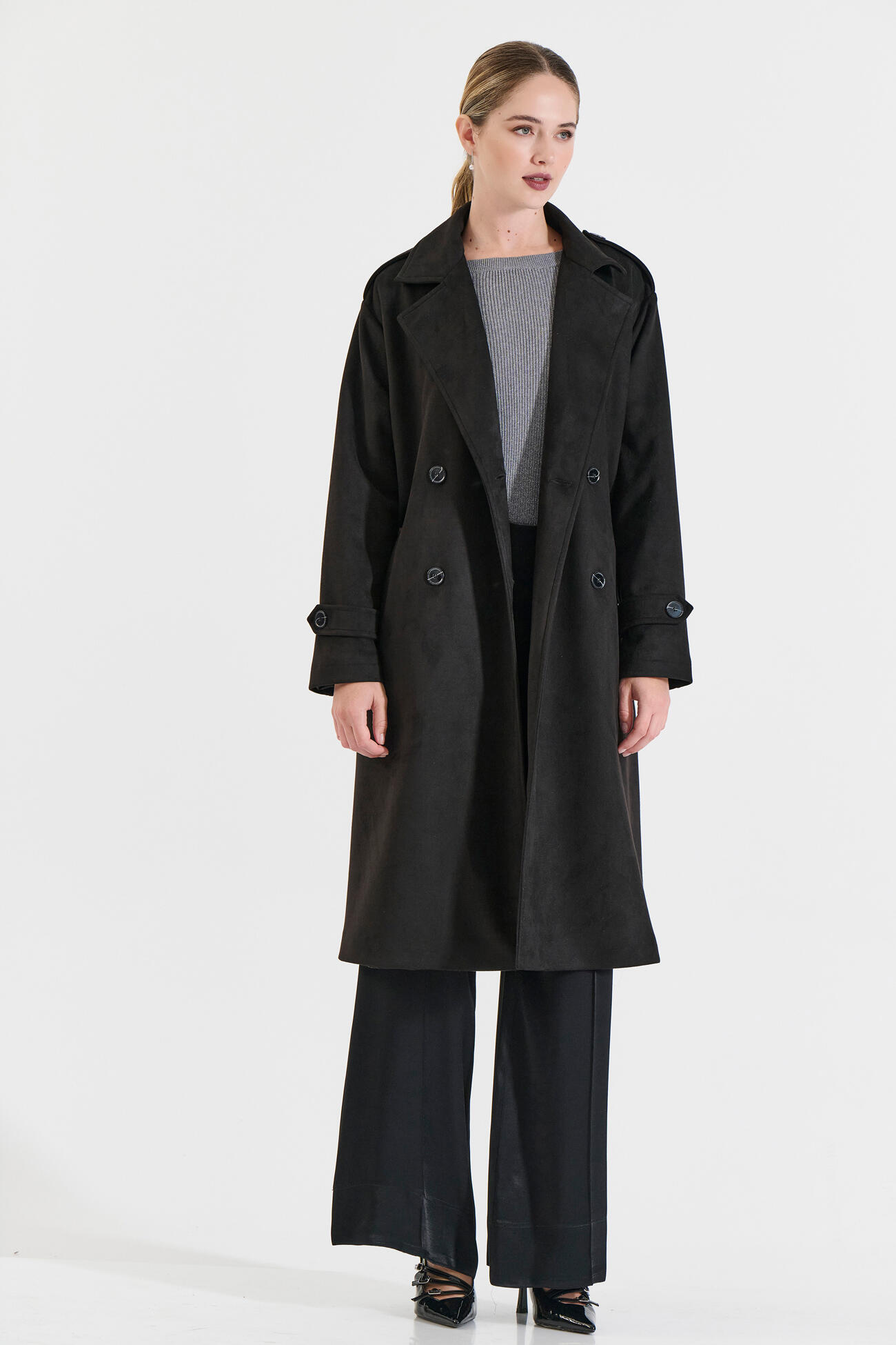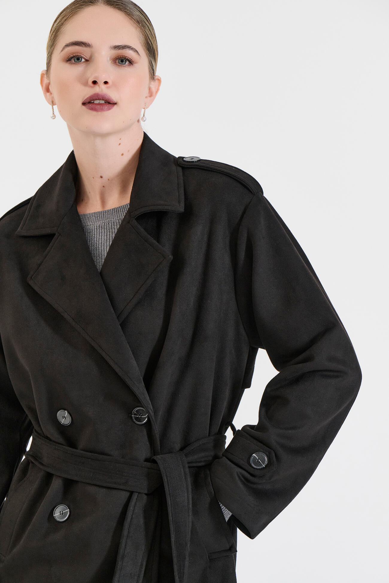 Κομψή καπαρντίνα με υφή σουέτ που χαρίζει απαλή αίσθηση και διακριτική πολυτέλεια. Διαθέτει πέτο γιακά, ζώνη στη μέση για ρυθμιζόμενη εφαρμογή και κουμπιά στο μπροστινό μέρος. Ένα διαχρονικό κομμάτι που ολοκληρώνει κάθε εμφάνιση με στιλ και κομψότητα, από το πρωί έως το βράδυ.
