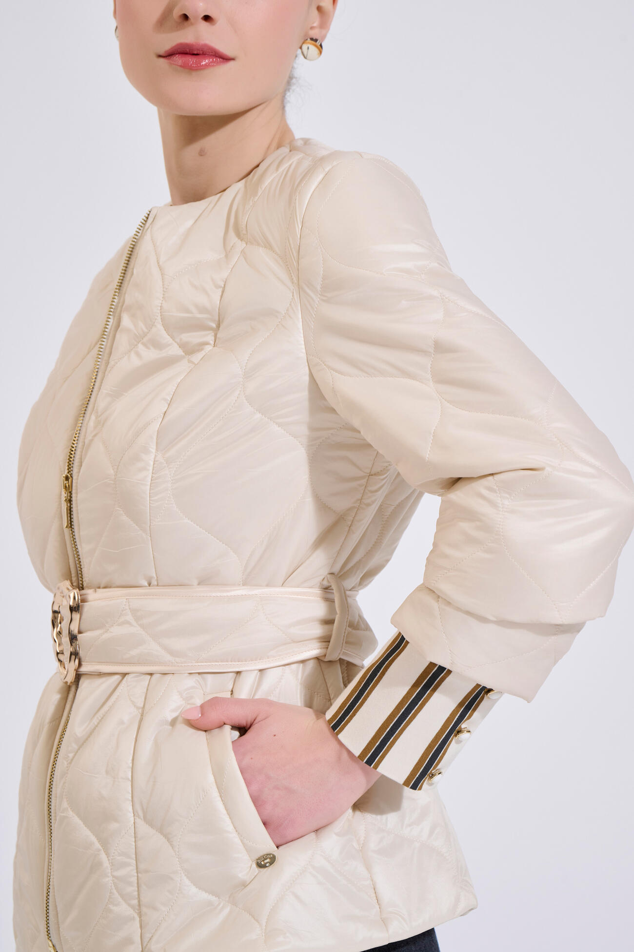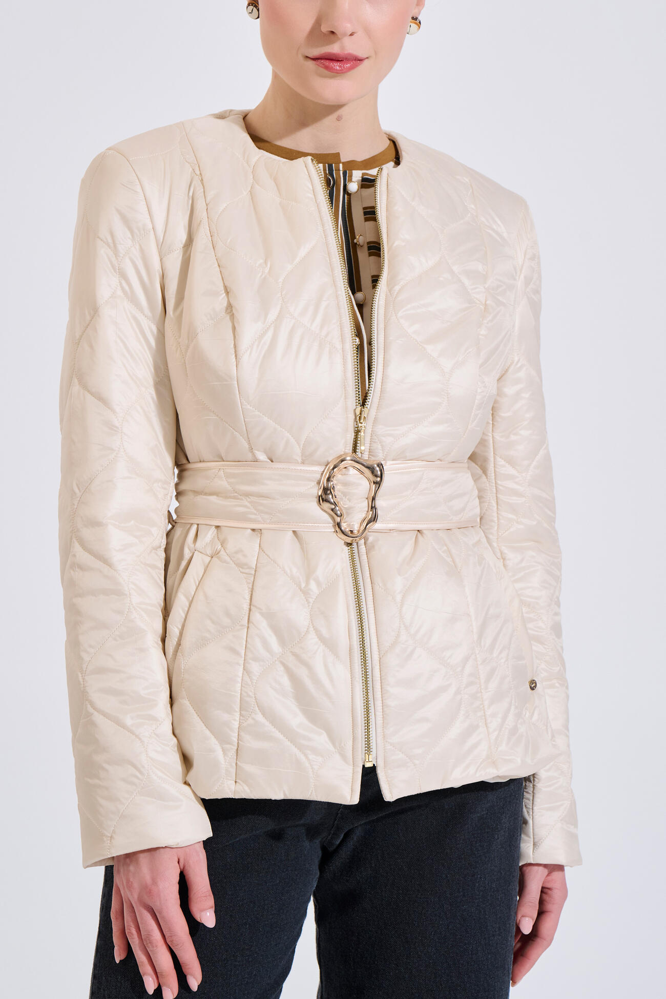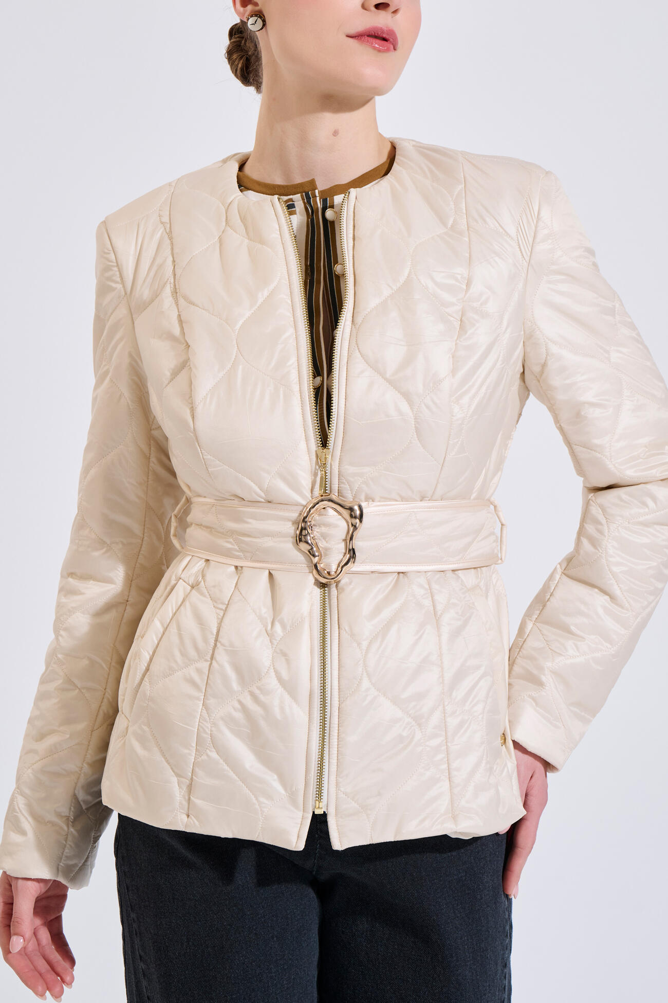 Καπιτονέ μπουφάν σε μεσαίο μήκος και εφαρμοστή γραμμή, με αποσπώμενη ζώνη και χρυσή αγκράφα που τονίζει τη μέση. Διαθέτει φερμουάρ και χαρίζει κομψή, θηλυκή σιλουέτα για καθημερινές εμφανίσεις.