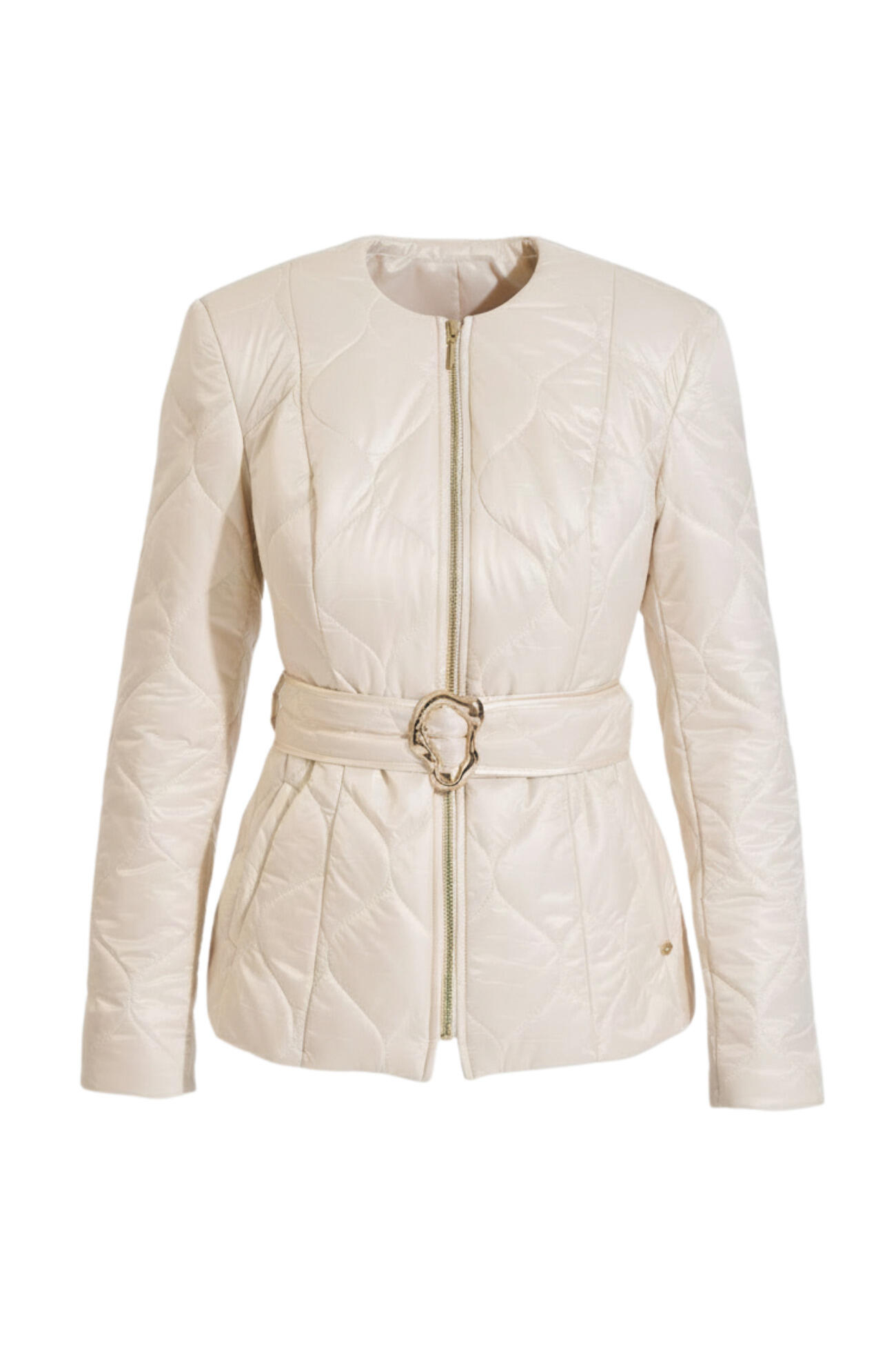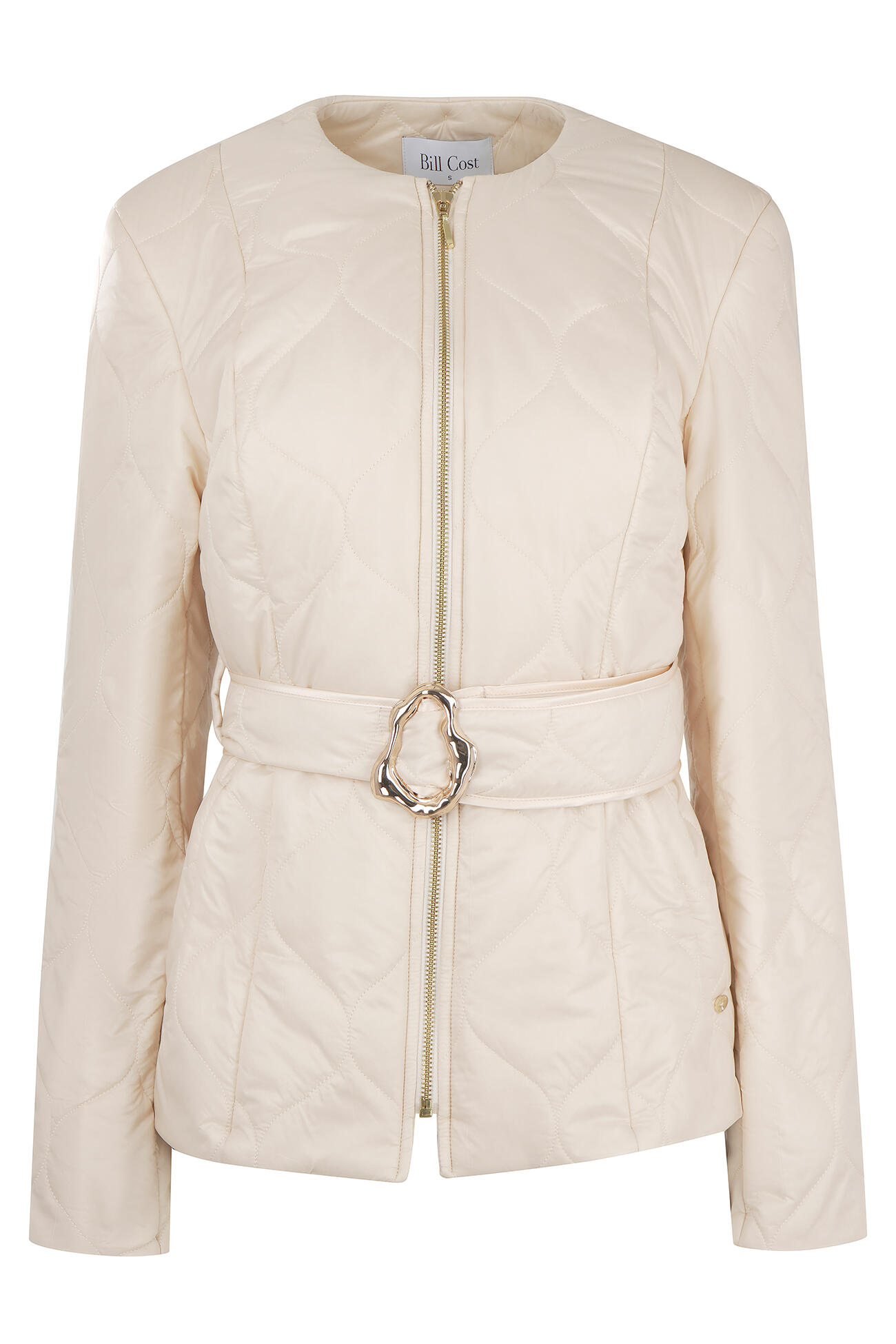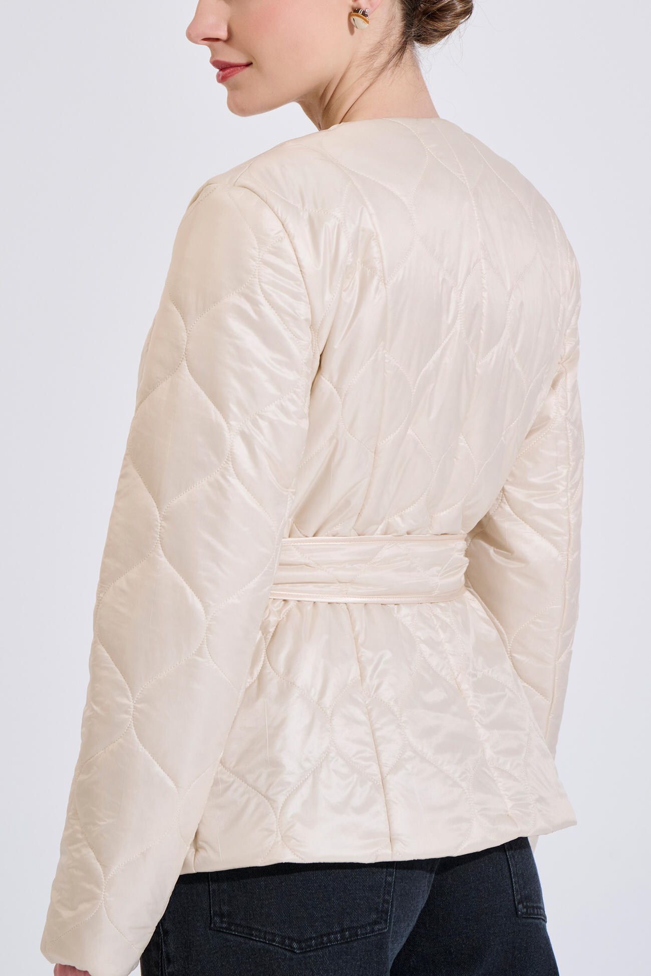Καπιτονέ μπουφάν σε μεσαίο μήκος και εφαρμοστή γραμμή, με αποσπώμενη ζώνη και χρυσή αγκράφα που τονίζει τη μέση. Διαθέτει φερμουάρ και χαρίζει κομψή, θηλυκή σιλουέτα για καθημερινές εμφανίσεις.