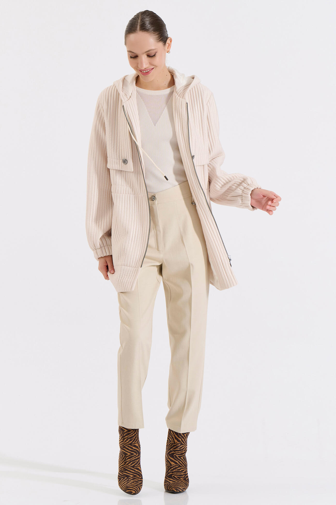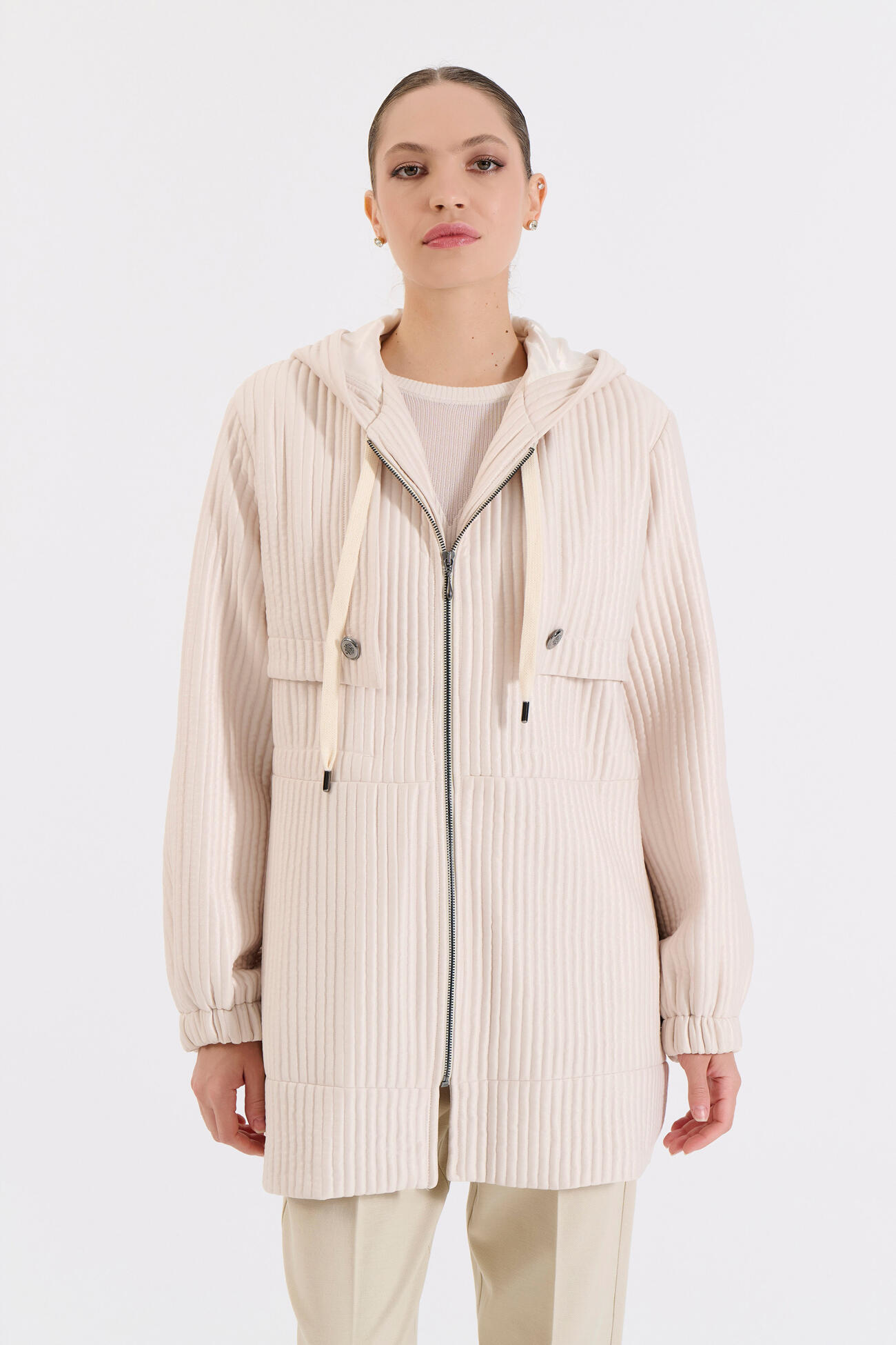 Μοντέρνο μπουφάν με κουκούλα και άνετη γραμμή. Διαθέτει μπροστινό φερμουάρ και τσέπες με κουμπί, προσφέροντας πρακτικότητα και διακριτικό στυλ. Ένα ευκολοφόρετο κομμάτι που συνδυάζει άνεση και σύγχρονη αισθητική για καθημερινές εμφανίσεις.