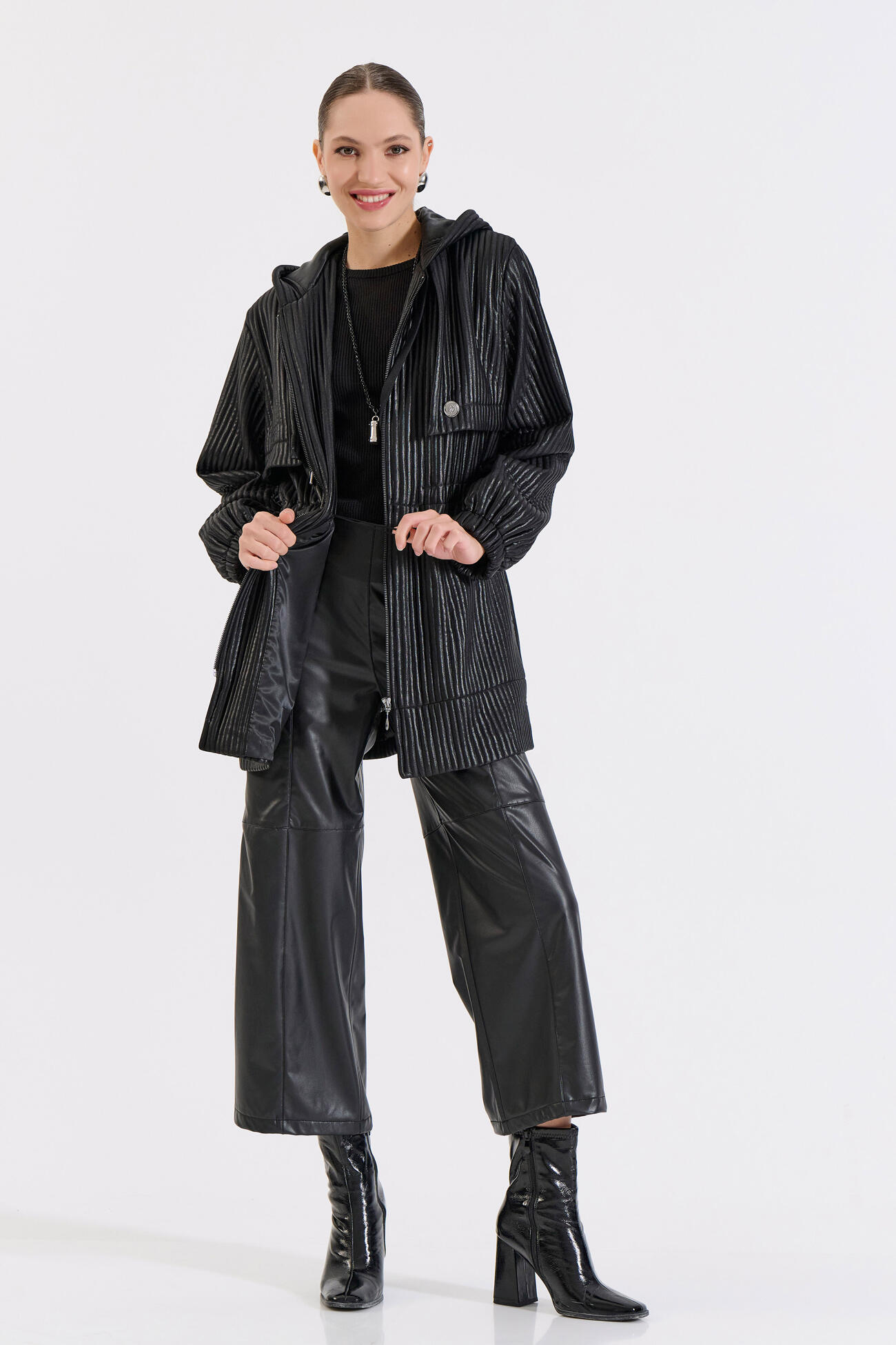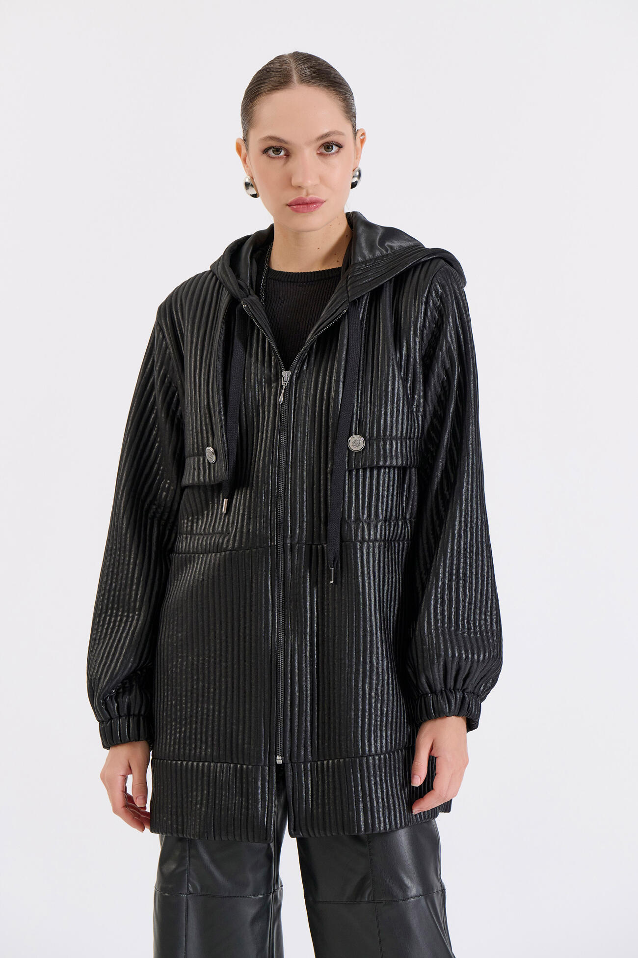 Μοντέρνο μπουφάν με κουκούλα και άνετη γραμμή. Διαθέτει μπροστινό φερμουάρ και τσέπες με κουμπί, προσφέροντας πρακτικότητα και διακριτικό στυλ. Ένα ευκολοφόρετο κομμάτι που συνδυάζει άνεση και σύγχρονη αισθητική για καθημερινές εμφανίσεις.