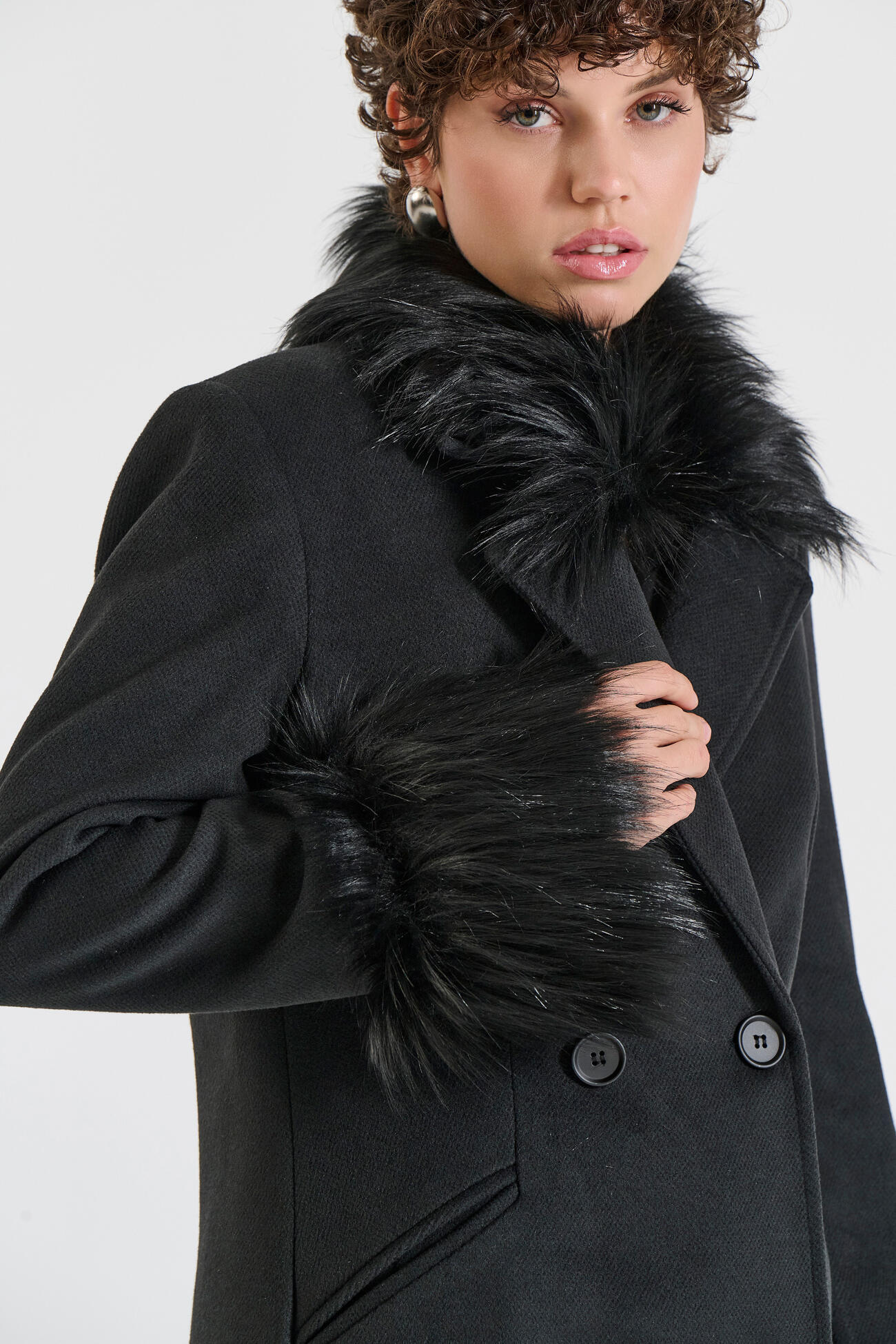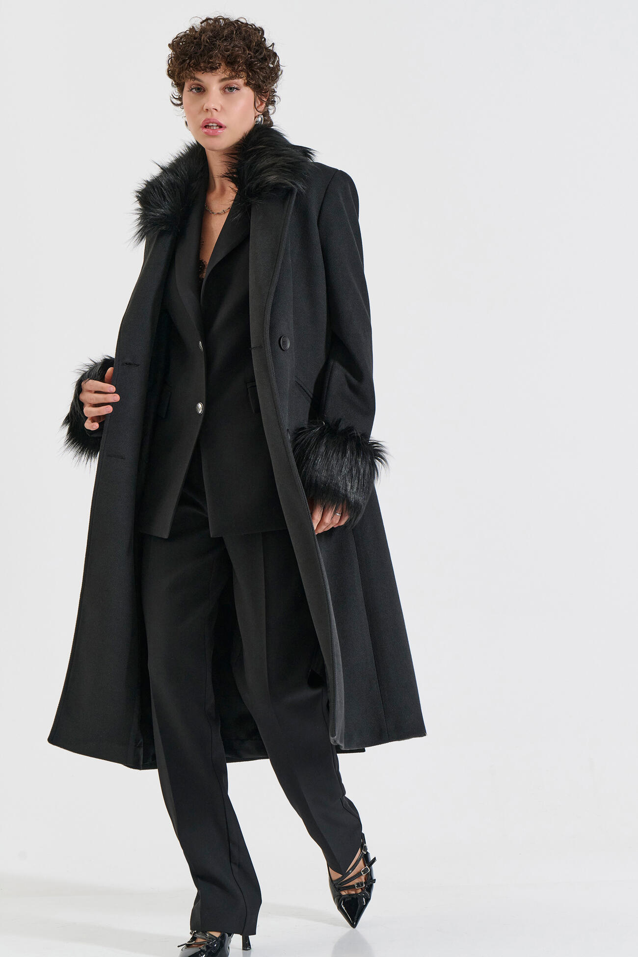 Σταυρωτό μακρύ παλτό με αποσπώμενη συνθετική γούνα στον γιακά και στα μανίκια, που χαρίζει πολυτελή υφή και statement χαρακτήρα. Η δομημένη γραμμή του και το κλασικό πέτο προσφέρουν κομψότητα, ενώ το σταυρωτό κούμπωμα αναδεικνύει τη σιλουέτα. Φοριέται με ή χωρίς τις γούνινες λεπτομέρειες, προσαρμόζοντας το ύφος από minimal έως εντυπωσιακό ένα διαχρονικό πανωφόρι για σύγχρονες χειμερινές εμφανίσεις.