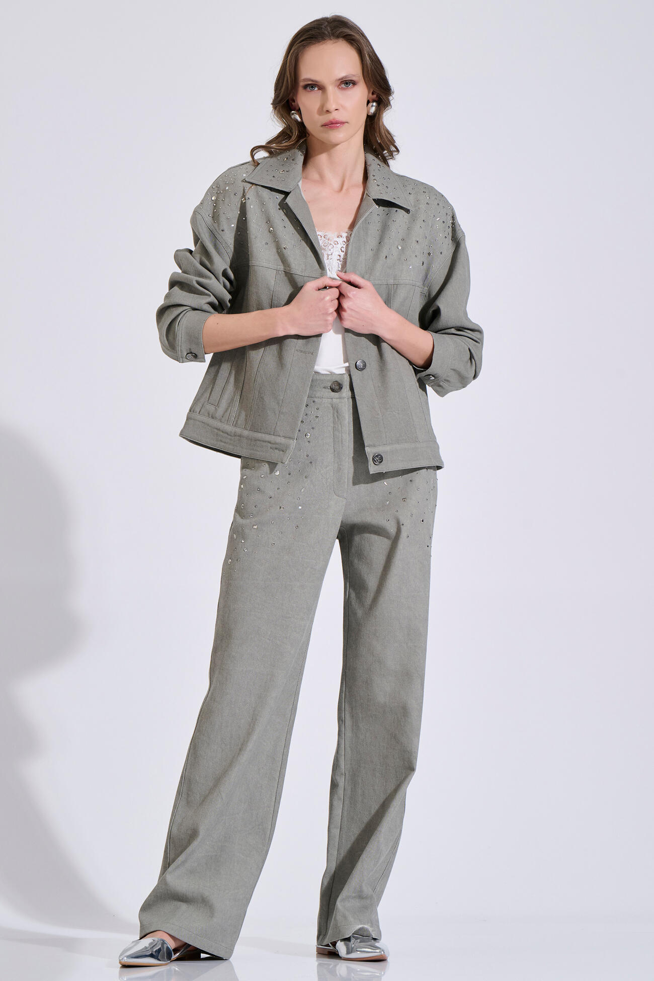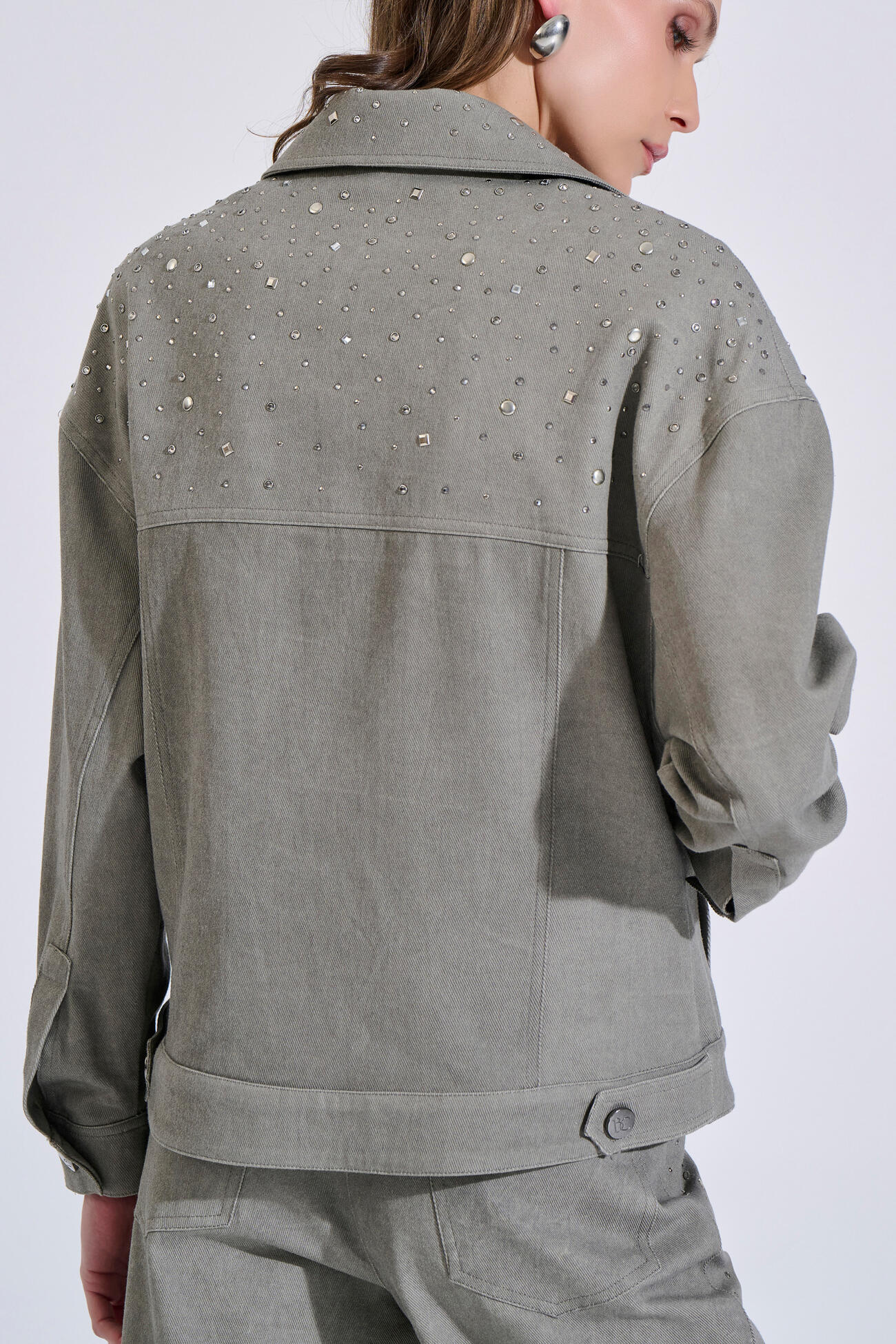 Βαμβακερό τζιν μπουφάν με γιακά και μπροστινό κλείσιμο με κουμπιά. Διαθέτει αποσπώμενες βάτες στους ώμους, τσέπες και διακοσμητικά τρουκς και στρας στο επάνω μέρος μπροστά και πίσω. Συνδυάζεται ιδανικά με το παντελόνι 10-200183-0 για ολοκληρωμένο σετ.