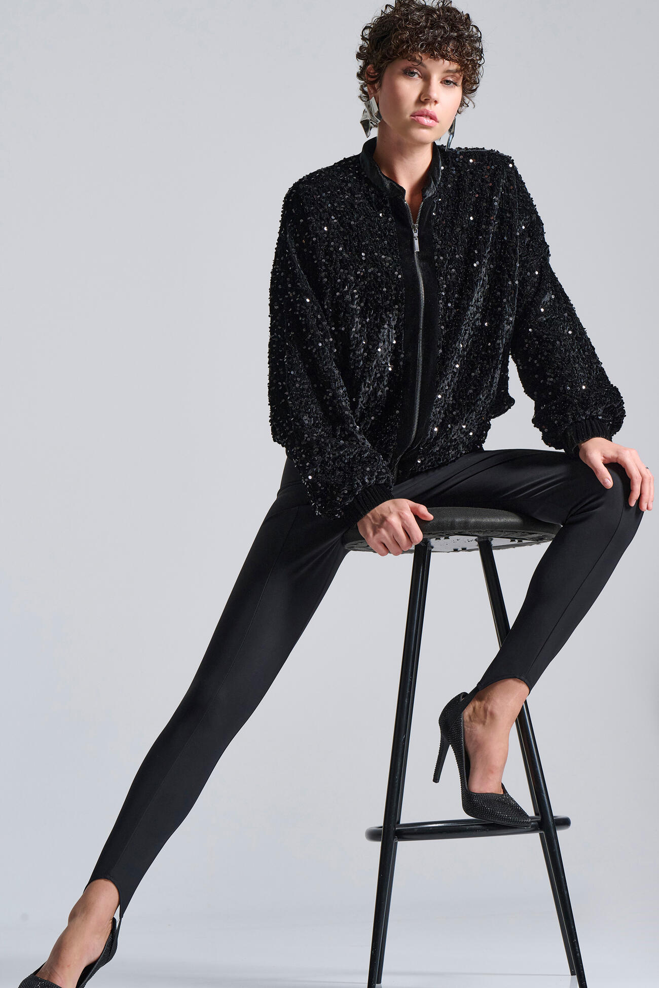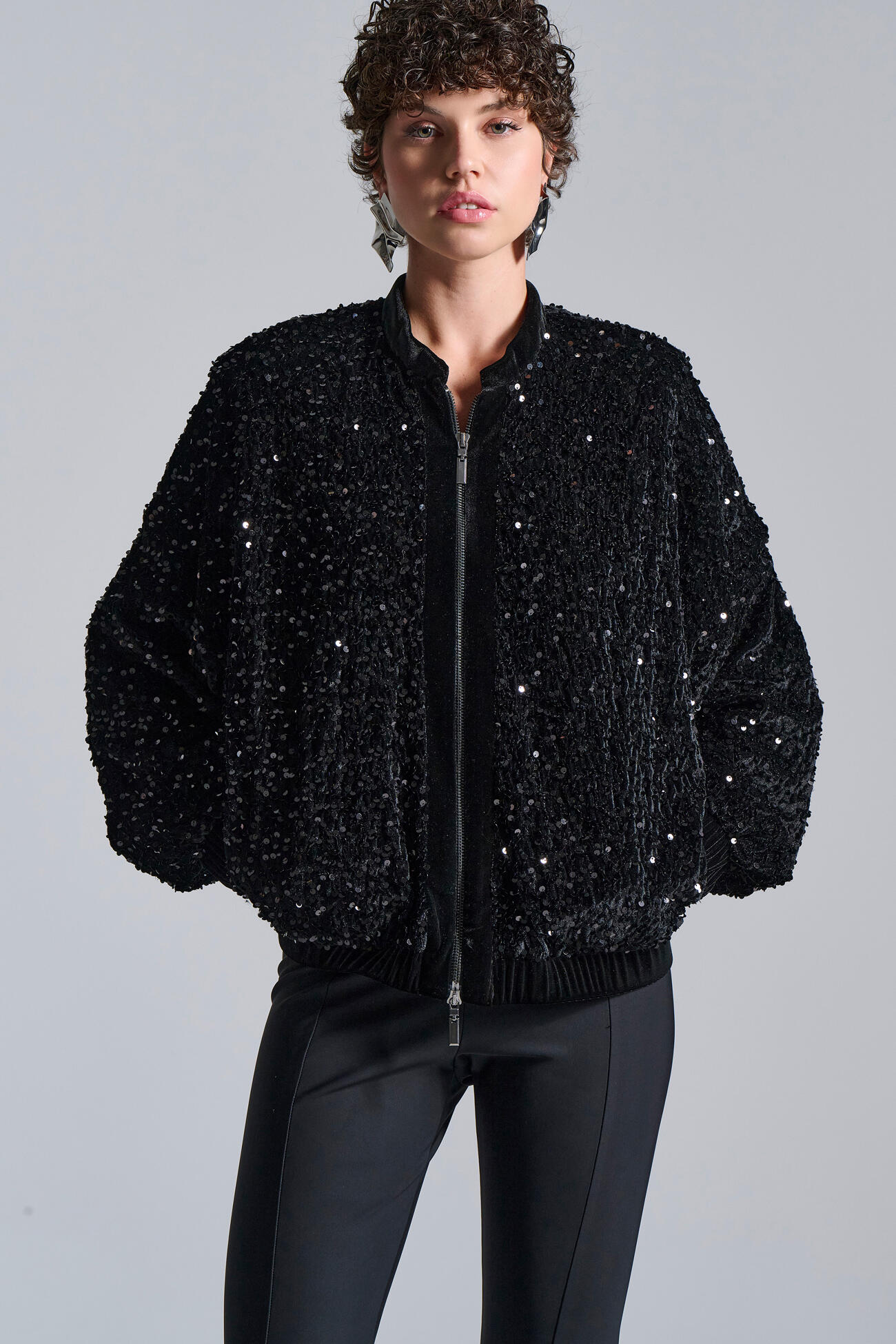 Εντυπωσιακό βελούδινο bomber jacket, διακοσμημένο με λαμπερές παγιέτες που δημιουργούν glamorous υφή και statement αποτέλεσμα. Διαθέτει μπροστινό φερμουάρ, ελαστικά τελειώματα και χαλαρή, άνετη γραμμή που προσφέρει σύγχρονο και elegant στιλ. Ένα ξεχωριστό πανωφόρι που αναβαθμίζει άμεσα κάθε βραδινή εμφάνιση.