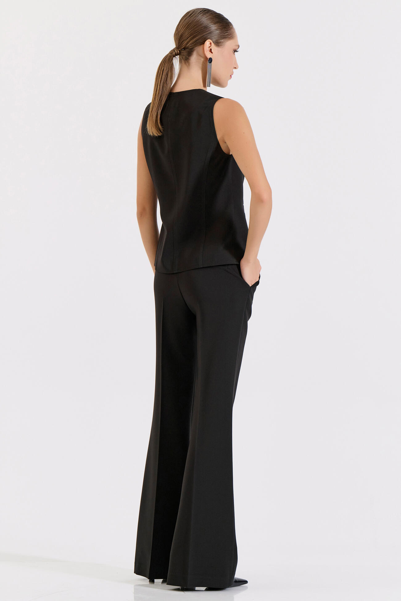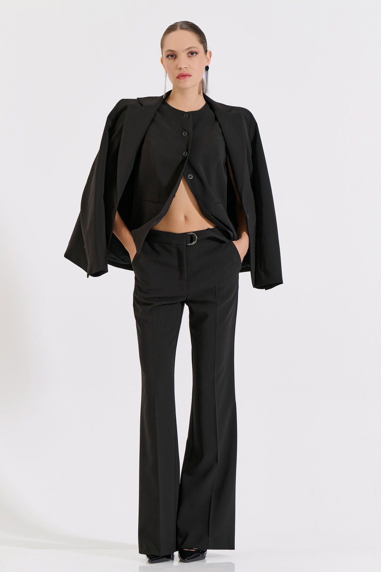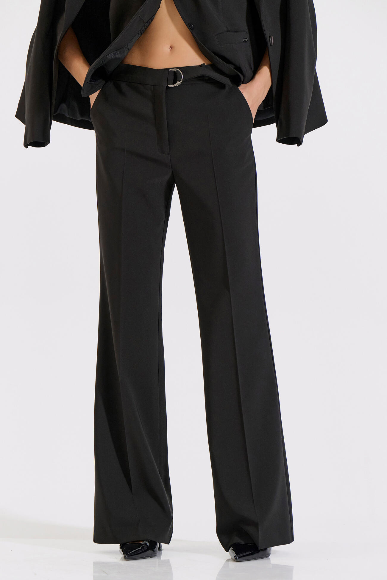 Στυλάτο παντελόνι σε γραμμή καμπάνα που κολακεύει τη σιλουέτα και χαρίζει κίνηση σε κάθε εμφάνιση. Διαθέτει πρακτικές τσέπες και διακοσμητική ζώνη με μεταλλικό κρίκο στη μέση, προσθέτοντας μοντέρνα και κομψή λεπτομέρεια.Συνδύασέ το με το σακάκι 10-031039-0 και το γιλέκο 10-031053-0 για ένα ολοκληρωμένο και κομψό σύνολο.