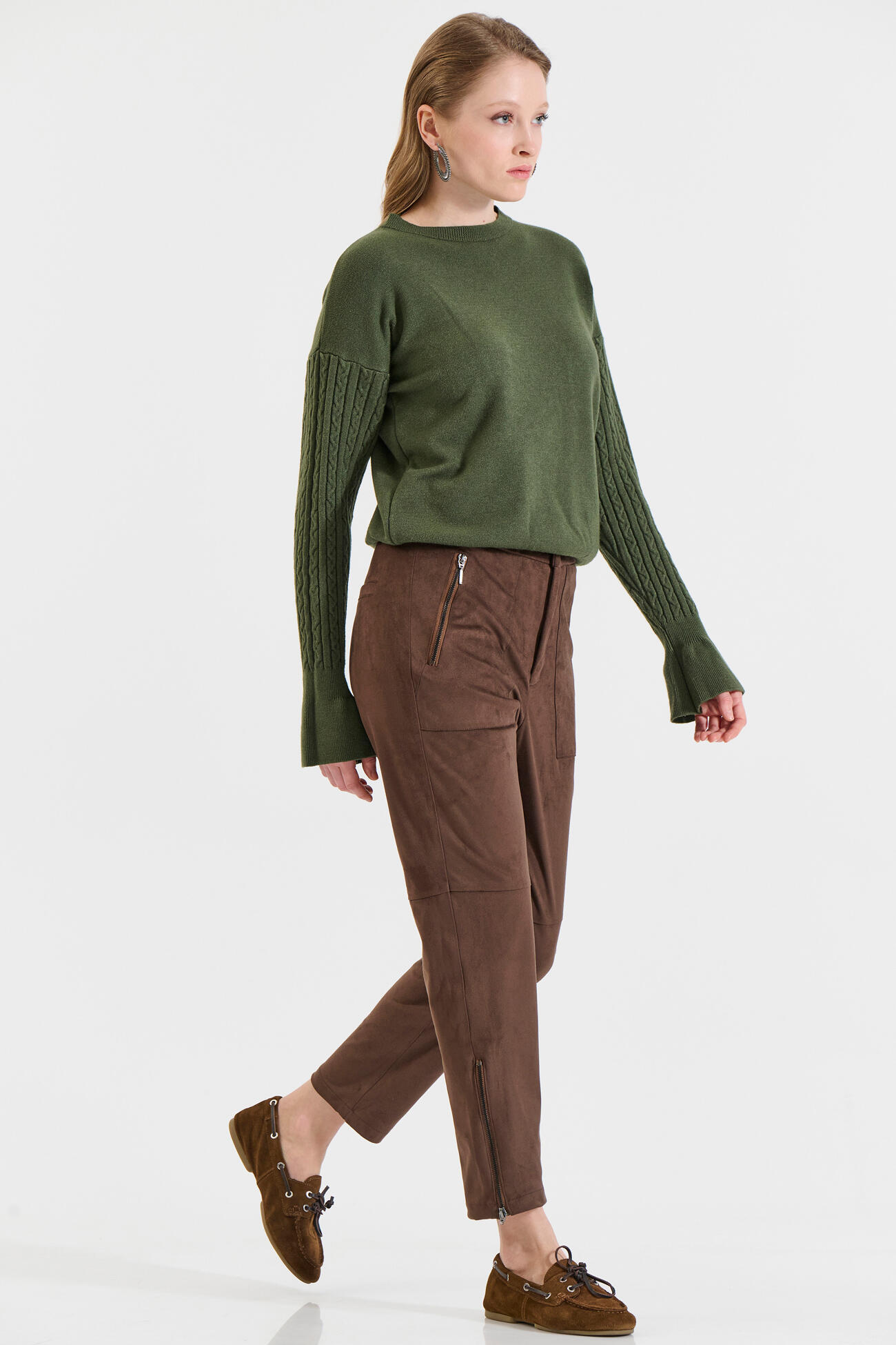 Κομψό παντελόνι σε υφή σουέτ που συνδυάζει άνεση και στυλ. Διαθέτει λάστιχο στη μέση με ρυθμιζόμενο κορδόνι και διακριτικό φερμουάρ στο τελείωμα του ποδιού. Η μαλακή υφή και η μοντέρνα γραμμή του το καθιστούν ιδανικό για all-day εμφανίσεις με boho χαρακτήρα.