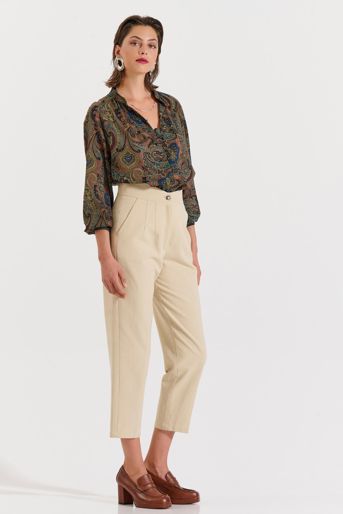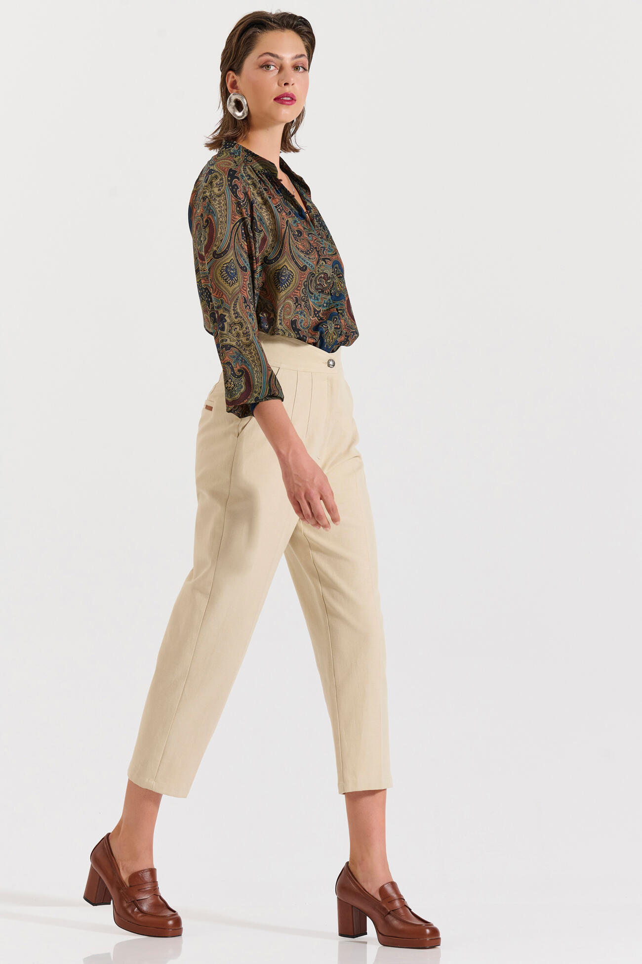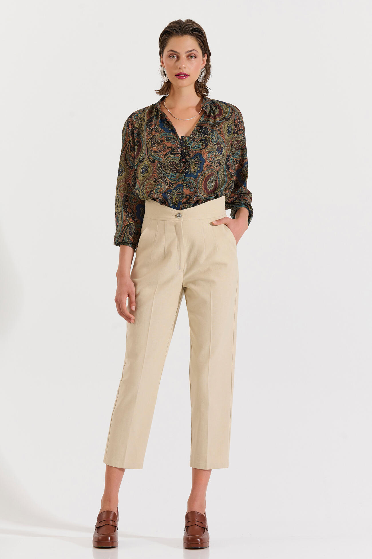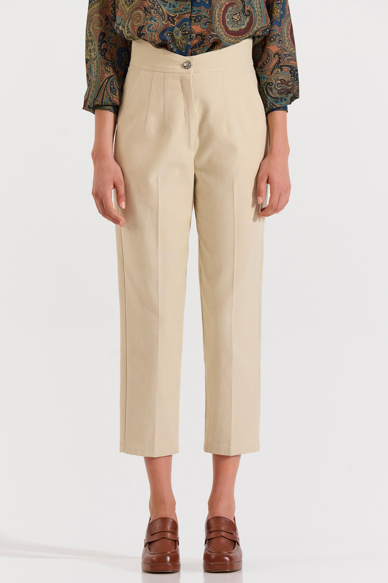 Κομψό ψηλόμεσο παντελόνι σε ίσια γραμμή με πιέτες μπροστά και πλαϊνές τσέπες. Ένα διαχρονικό κομμάτι που συνδυάζεται εύκολα τόσο σε επαγγελματικά όσο και σε πιο χαλαρά σύνολα.
