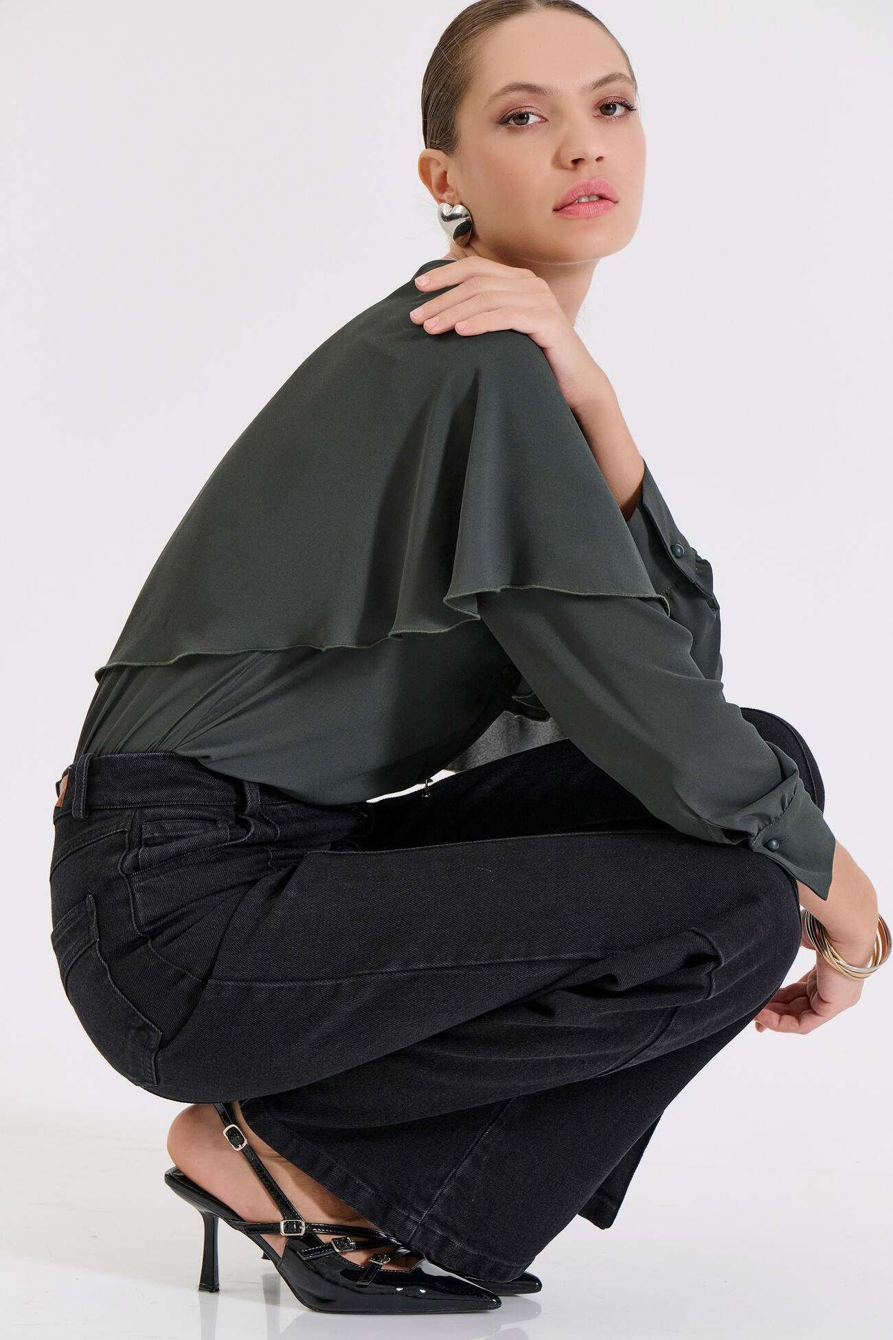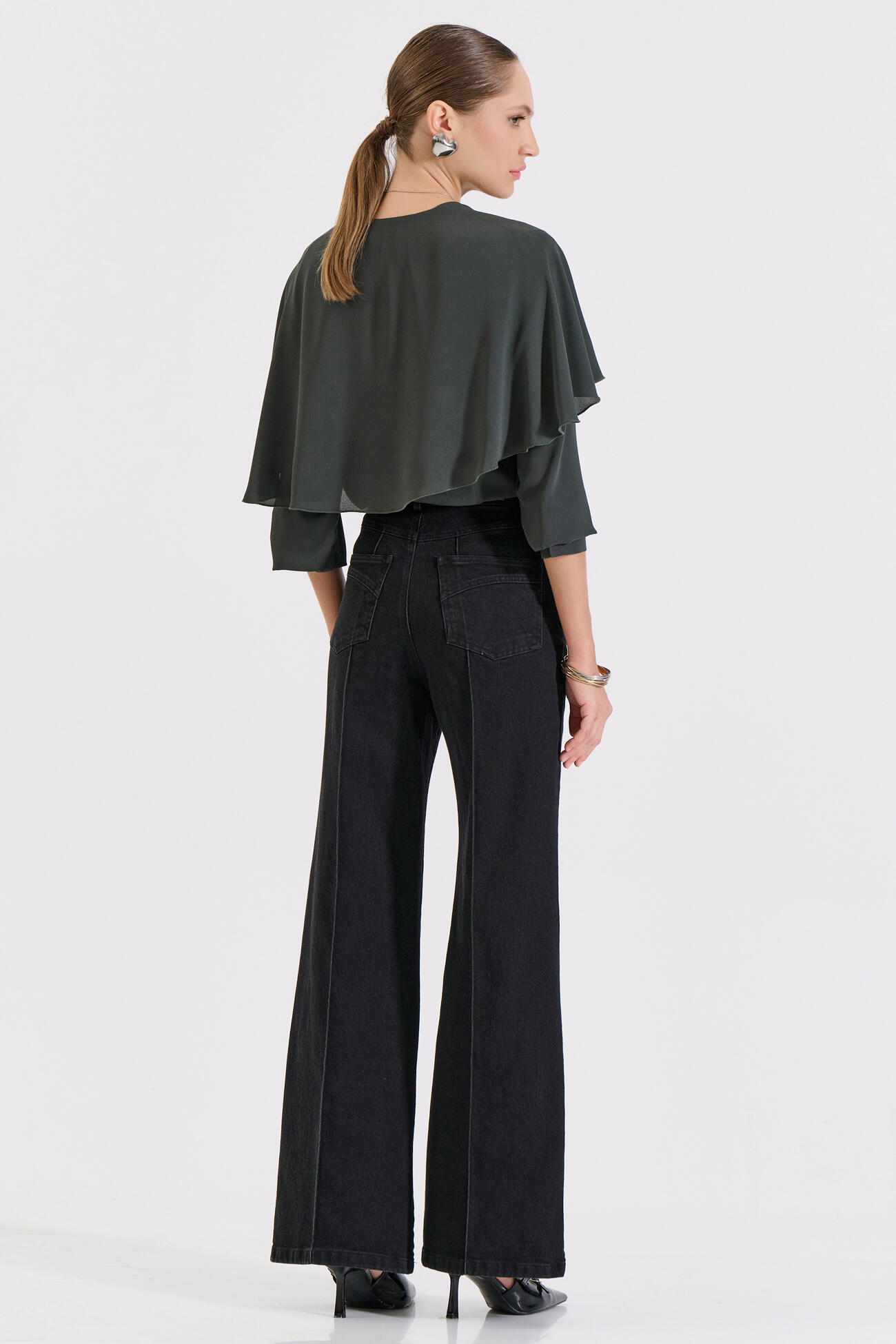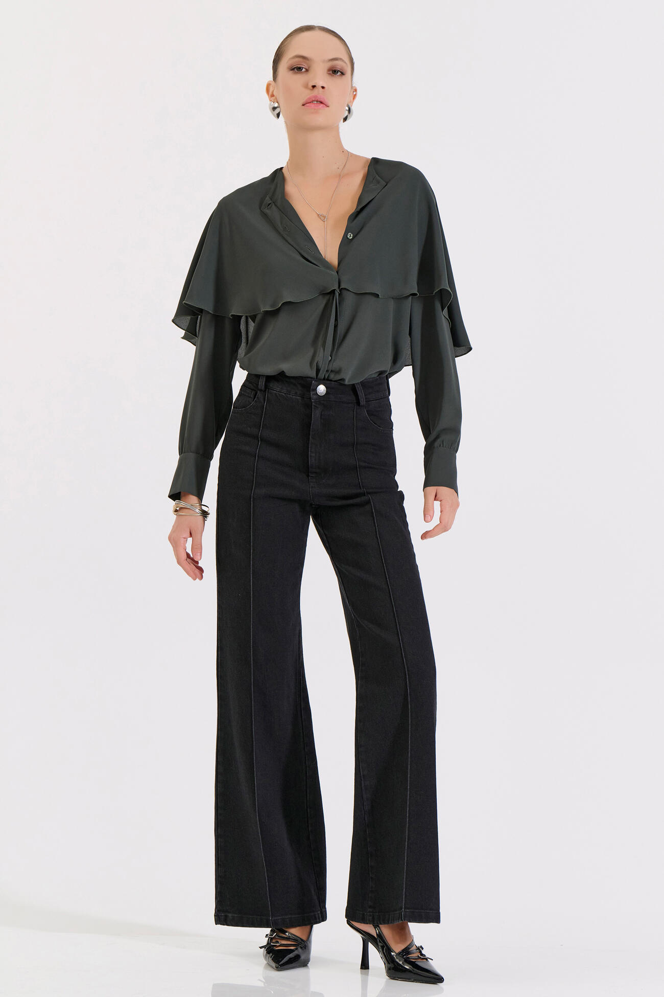 Τζιν παντελόνι καμπάνα από βαμβάκι. Η ψηλή μέση και η νερβίρ ραφή στο μπροστινό μέρος επιμηκύνει οπτικά τη σιλουέτα, ενώ η άνετη γραμμή προσφέρει ελευθερία κινήσεων. Ένα κομμάτι με ρετρό διάθεση που ανανεώνει τη γκαρνταρόμπα, ιδανικό για συνδυασμούς με πουκάμισα, tops και blazers.