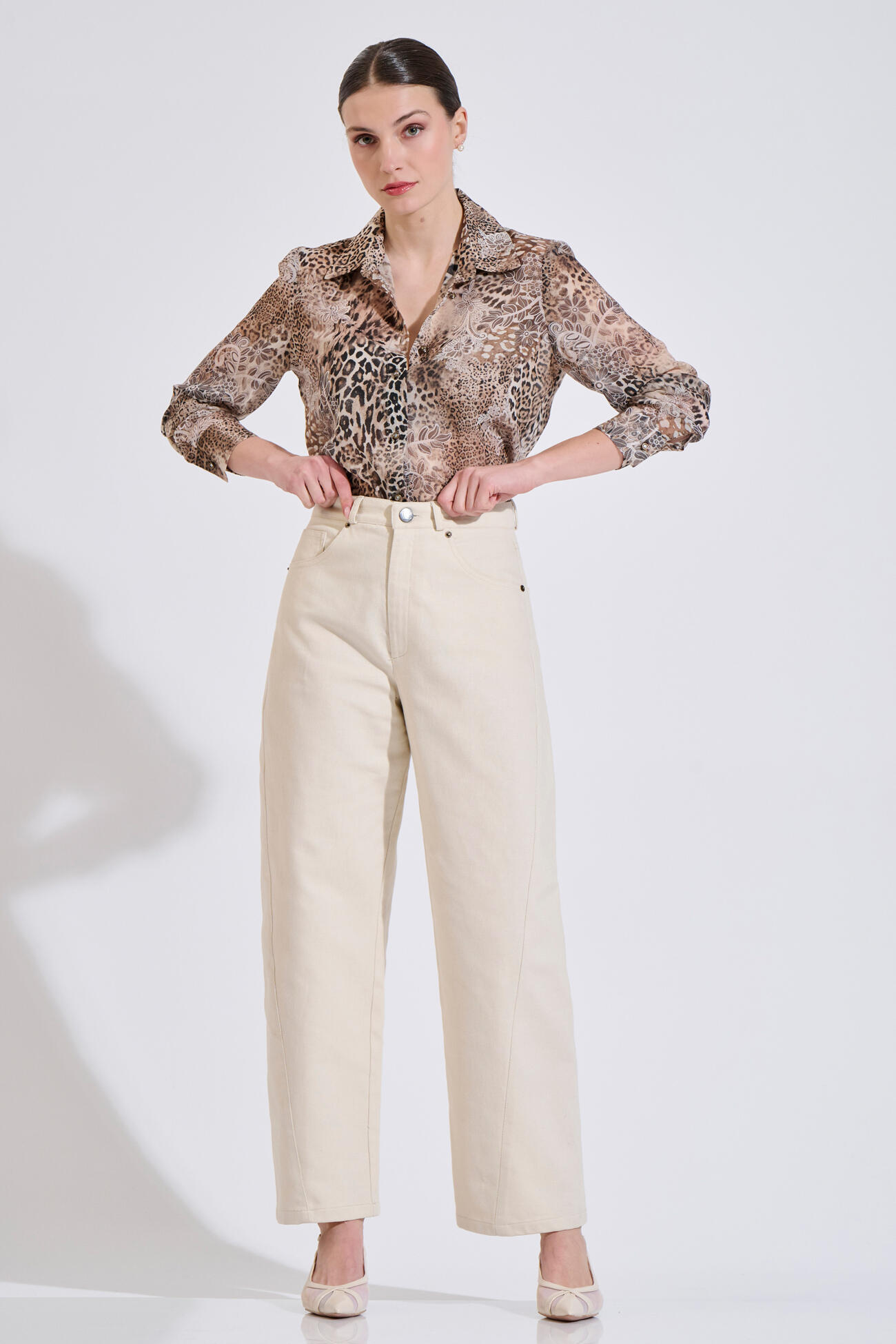 Βαμβακερό παντελόνι τύπου τζιν σε γραμμή barrel.Διαθέτει κλασικό πεντάτσεπο σχεδιασμό, μπροστινό κλείσιμο με φερμουάρ και μεταλλικό κουμπί, καθώς και θηλάκια για ζώνη .