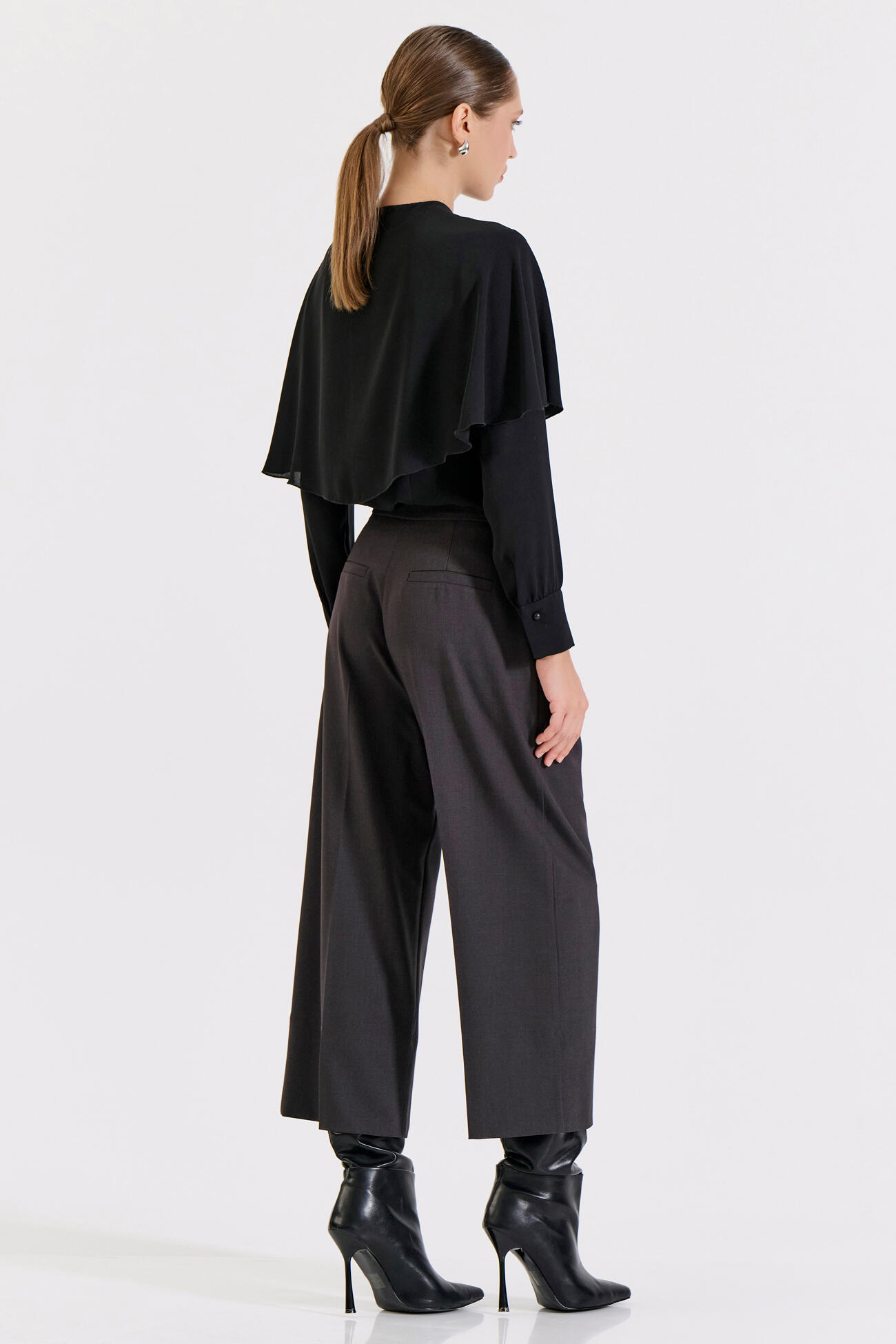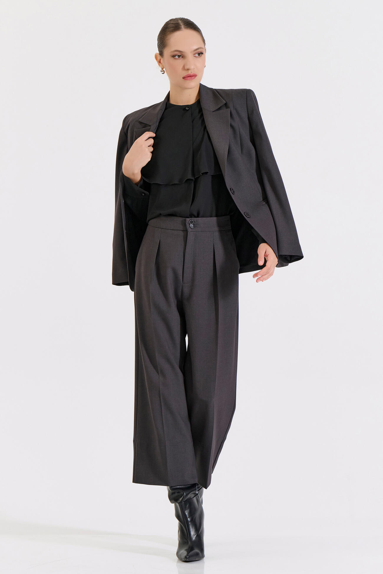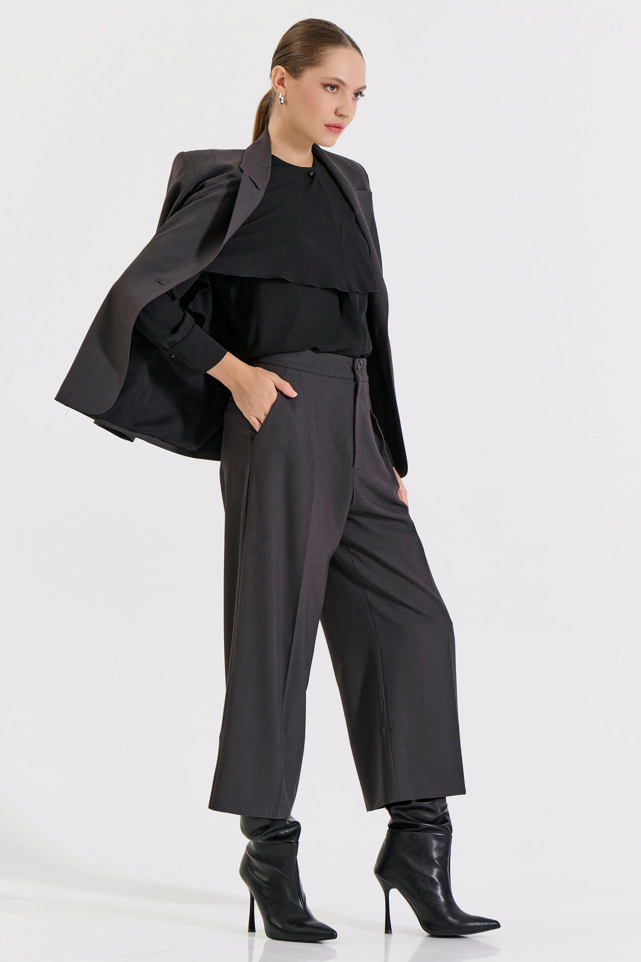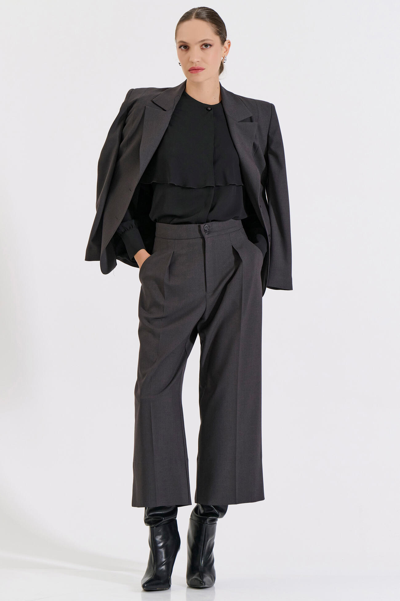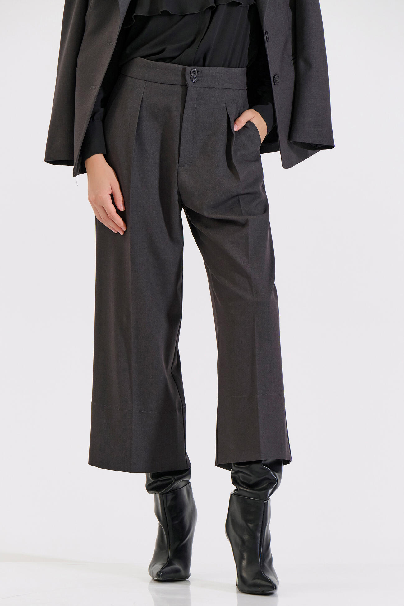 Κομψή ζιπ κιλότ με ψηλή μέση και άνετη εφαρμογή. Διαθέτει πιέτες στο μπροστινό μέρος και κλείσιμο με κουμπιά και φερμουάρ για πρακτικότητα και στυλ. Ένα ευέλικτο κομμάτι που μπορεί να φορεθεί από το γραφείο έως τις βραδινές εμφανίσεις, προσφέροντας στυλ και άνεση.