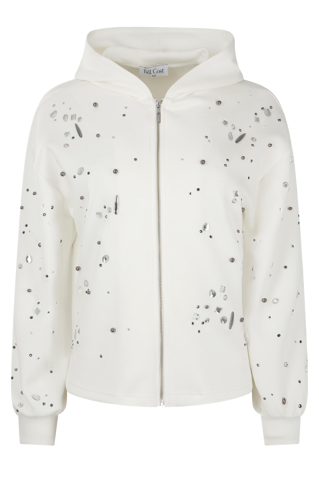 Φούτερ ζακέτα σε άνετη γραμμή με απαλή υφή. Διαθέτει κουκούλα, μπροστινό κλείσιμο με φερμουάρ και μακριά μανίκια με λάστιχο στο τελείωμα. Διακοσμημένη με πέτρες σε όλη την επιφάνεια για διακριτική λάμψη. Συνδυάζεται σε σετ με το φούτερ παντελόνι 10-240061-0.
