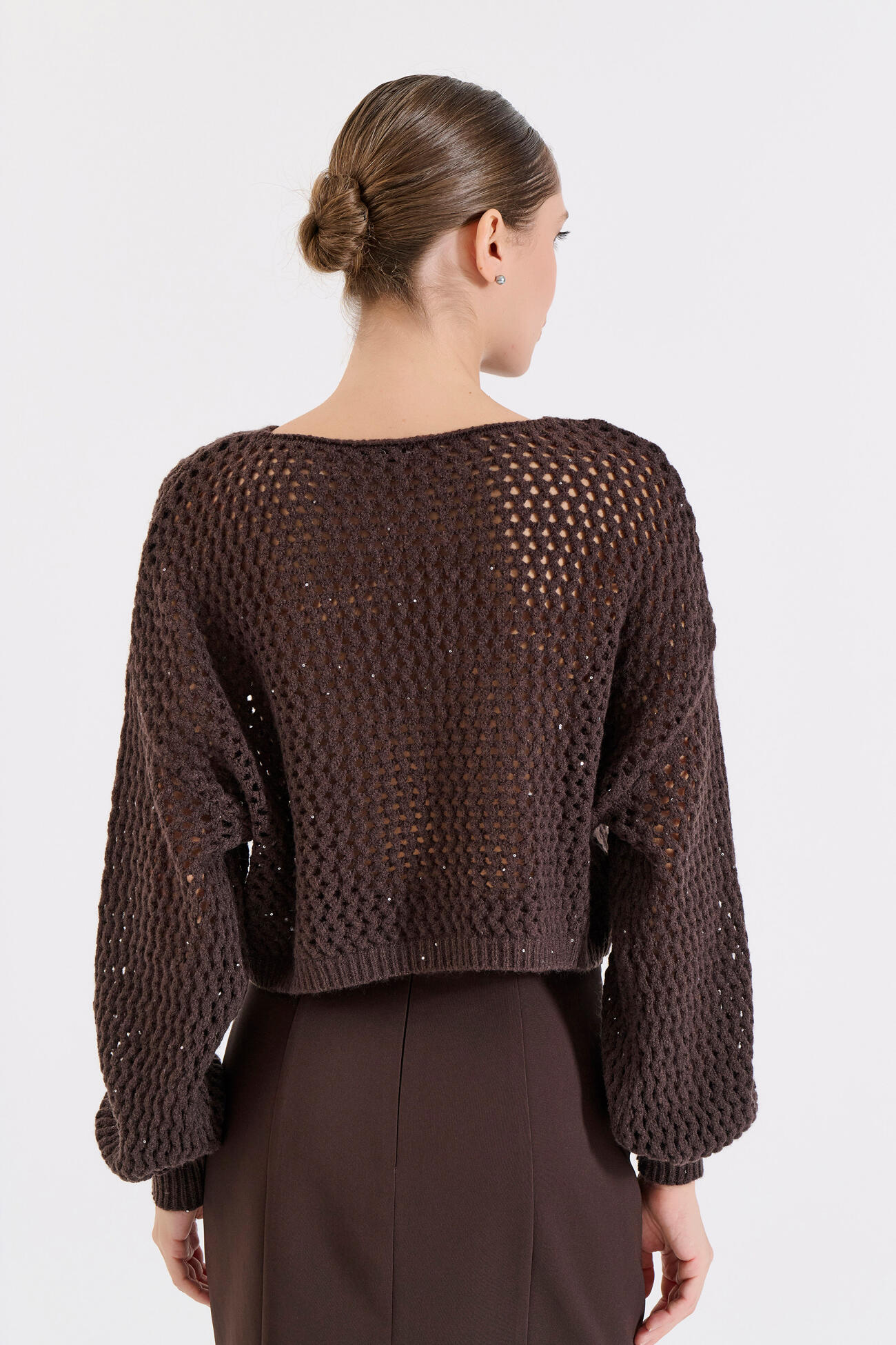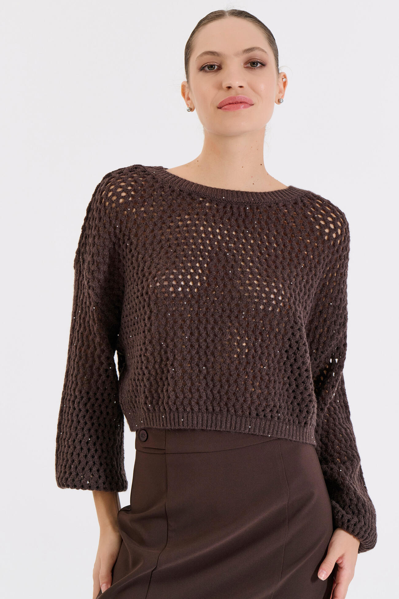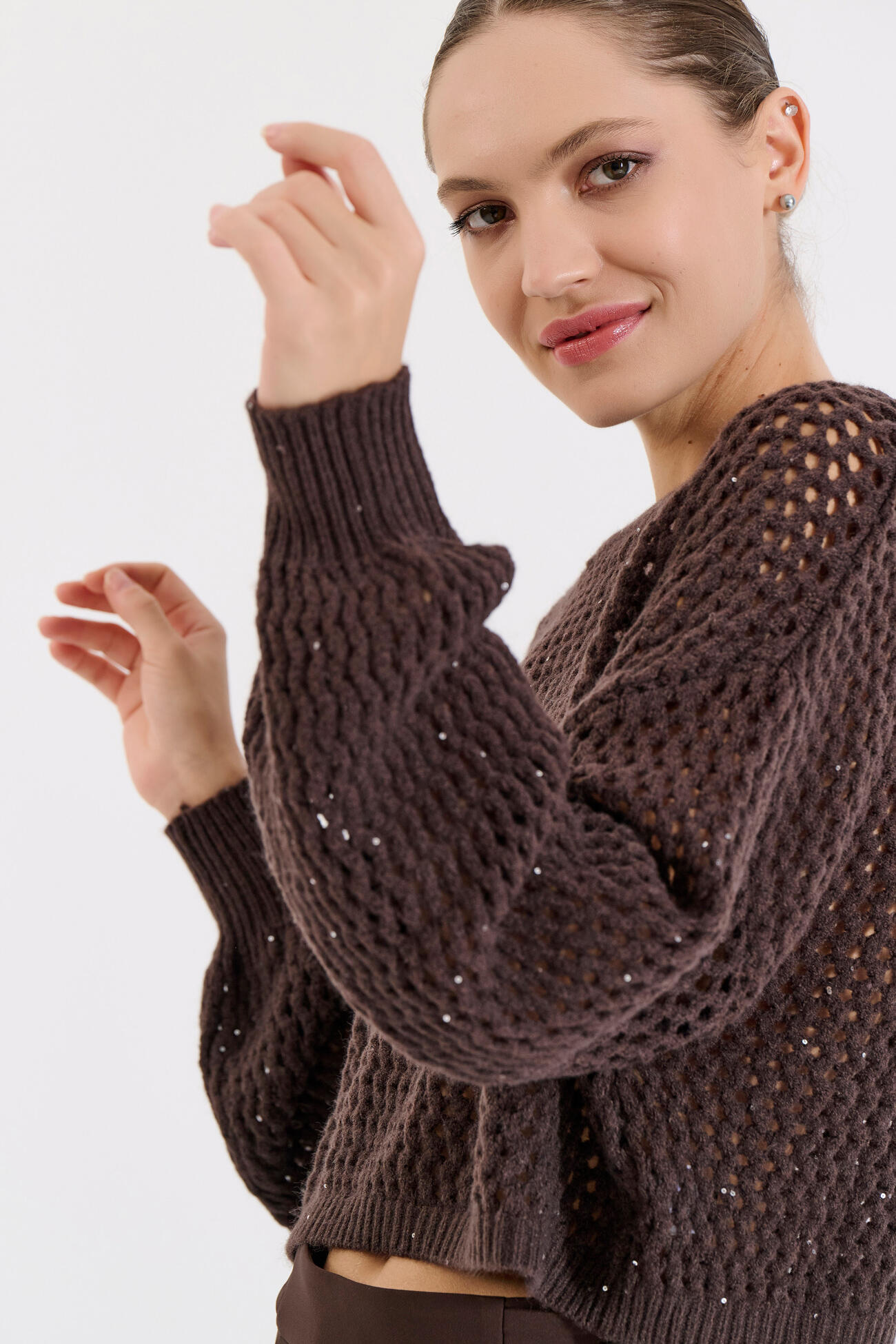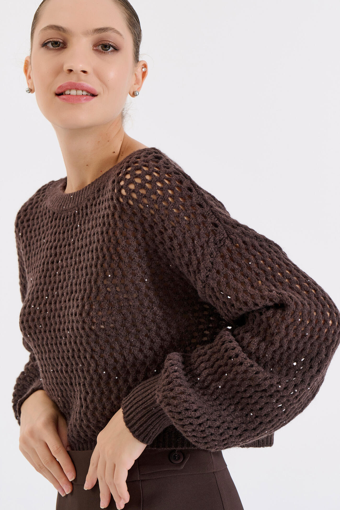 Πλεκτή μπλούζα με διάτρητο σχέδιο και διακριτικές παγιέτες που προσθέτουν λάμψη. Διαθέτει στρογγυλή λαιμόκοψη και χαλαρή εφαρμογή για άνετο, σύγχρονο look. Ιδανική για να φορεθεί μόνη της ή πάνω από πουκάμισο για πιο ιδιαίτερο layering.