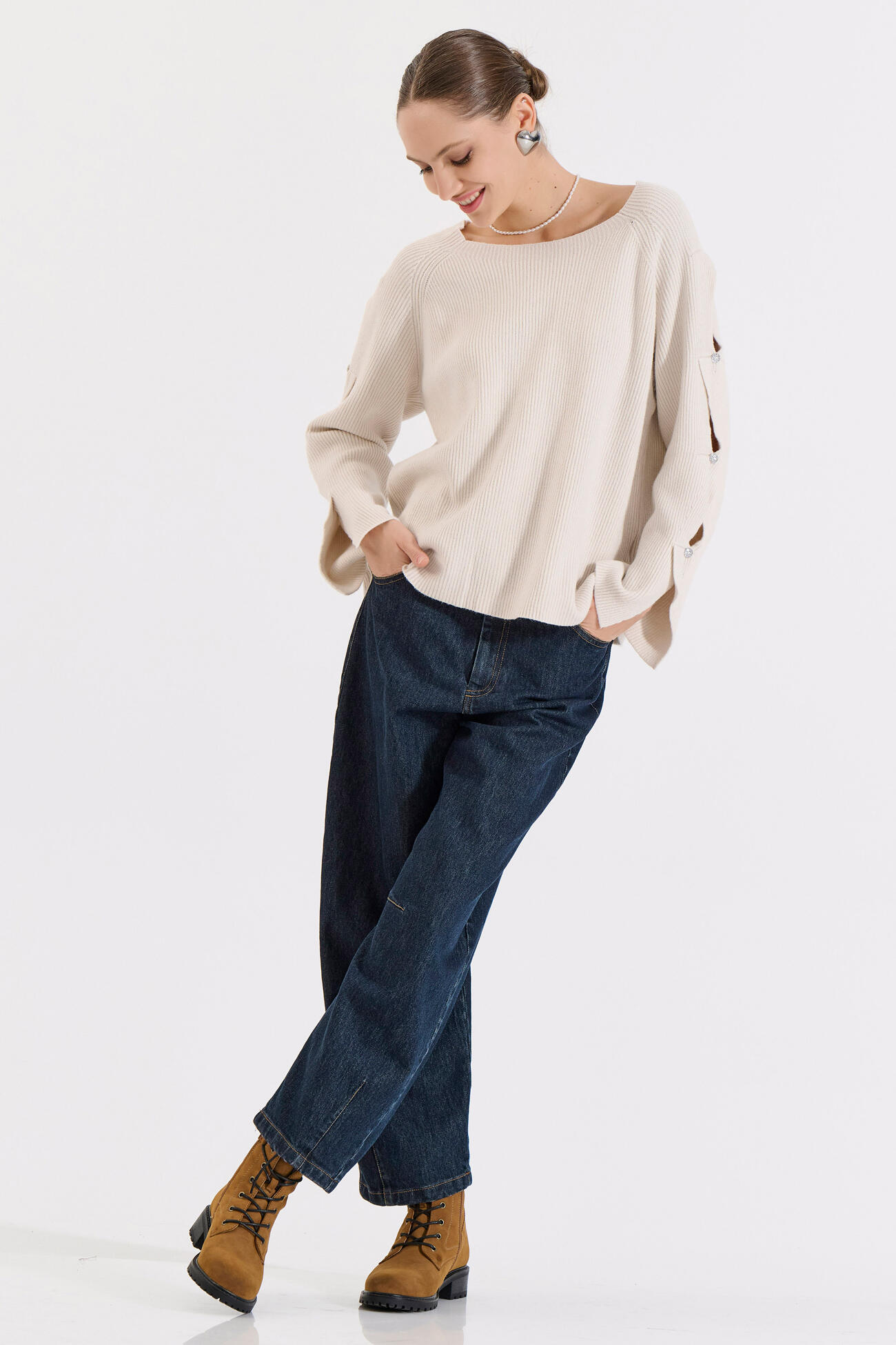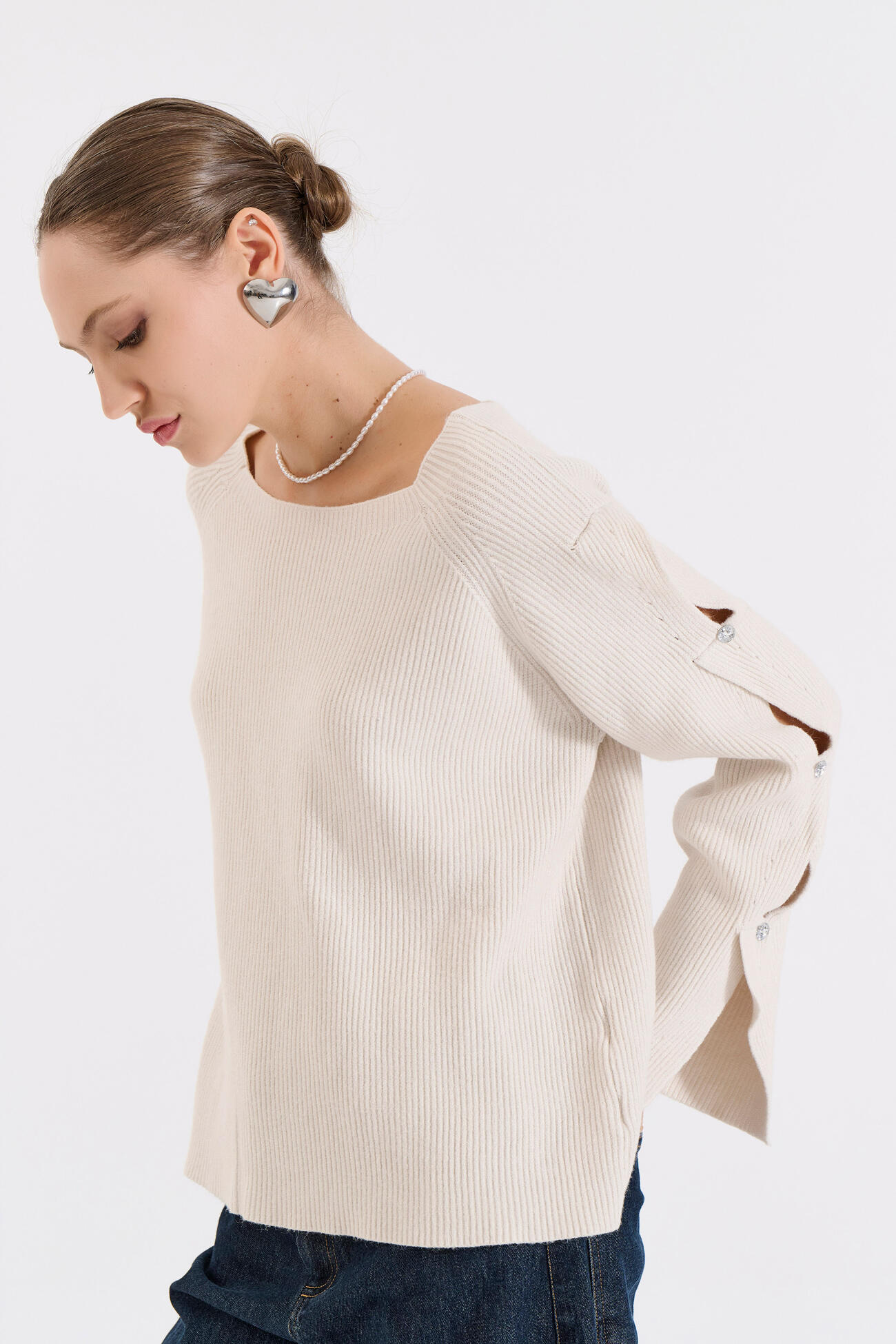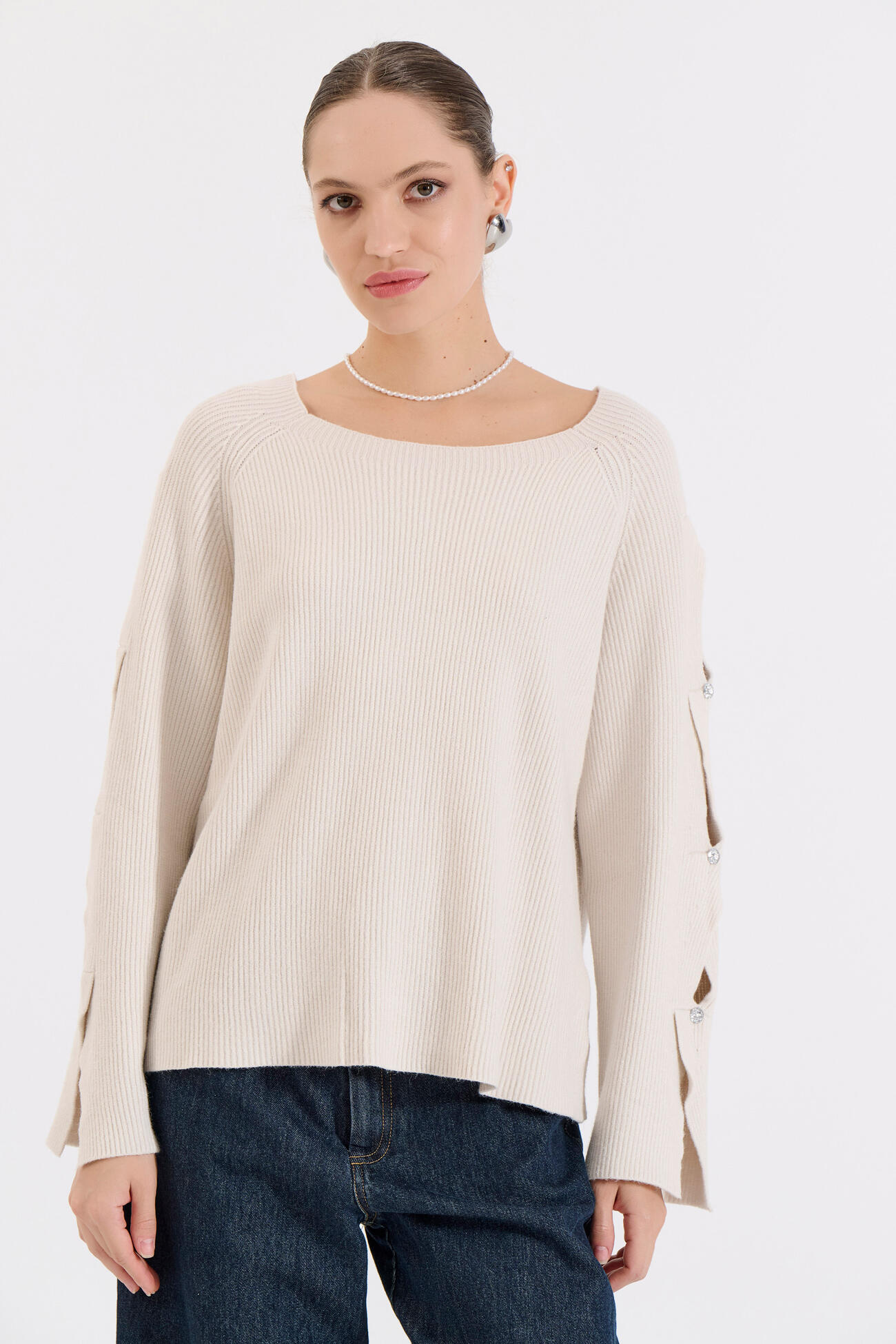 Ζεστή πλεκτή μπλούζα με ανάγλυφη υφή και λαιμόκοψη χαμόγελο. Διαθέτει διακοσμητικά κουμπιά στα μανίκια που προσθέτουν διακριτική λάμψη και μοντέρνο χαρακτήρα. Ένα ευκολοφόρετο κομμάτι που συνδυάζει άνεση και κομψότητα για καθημερινές εμφανίσεις.