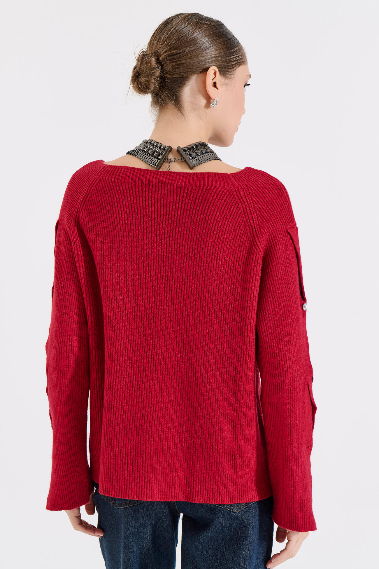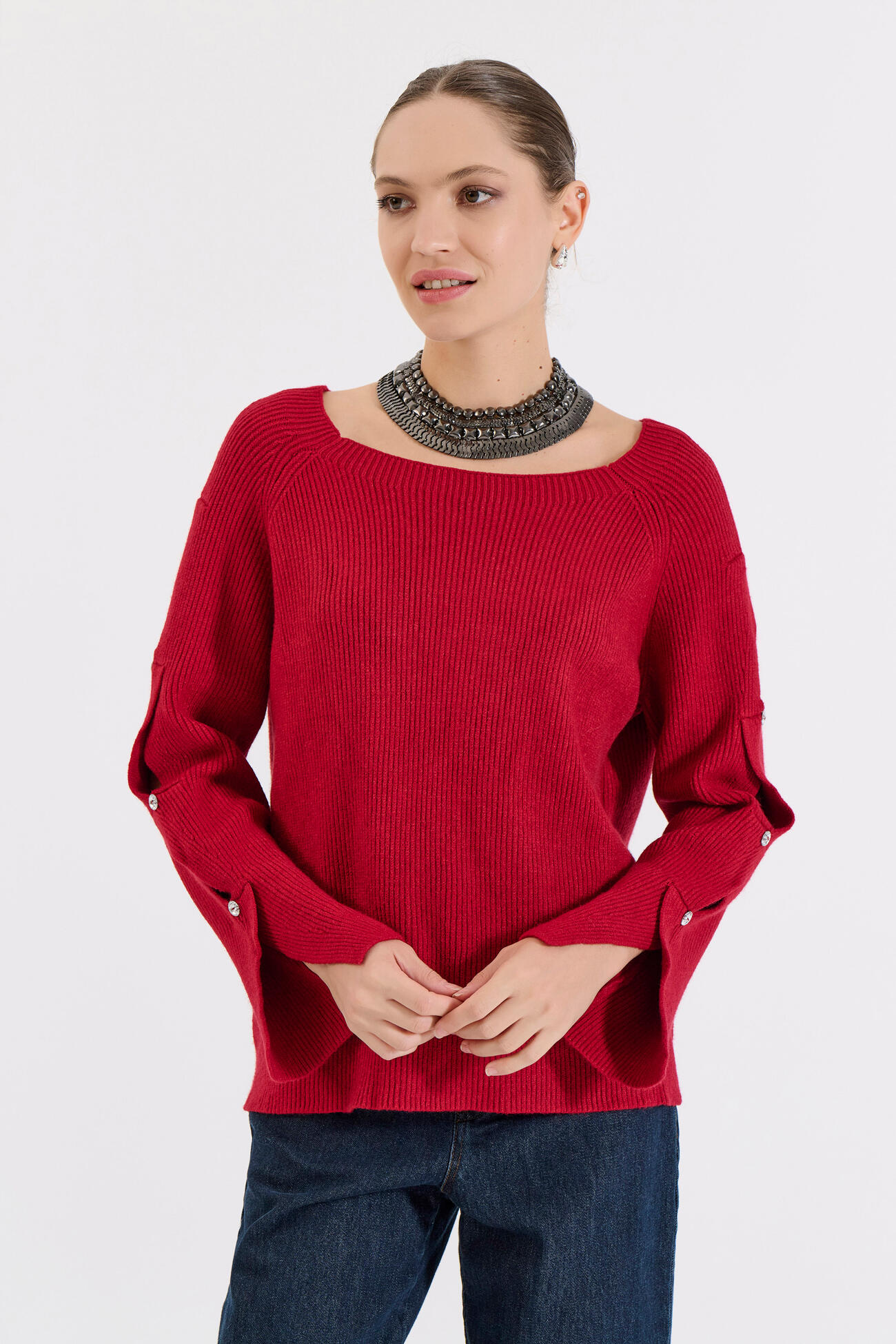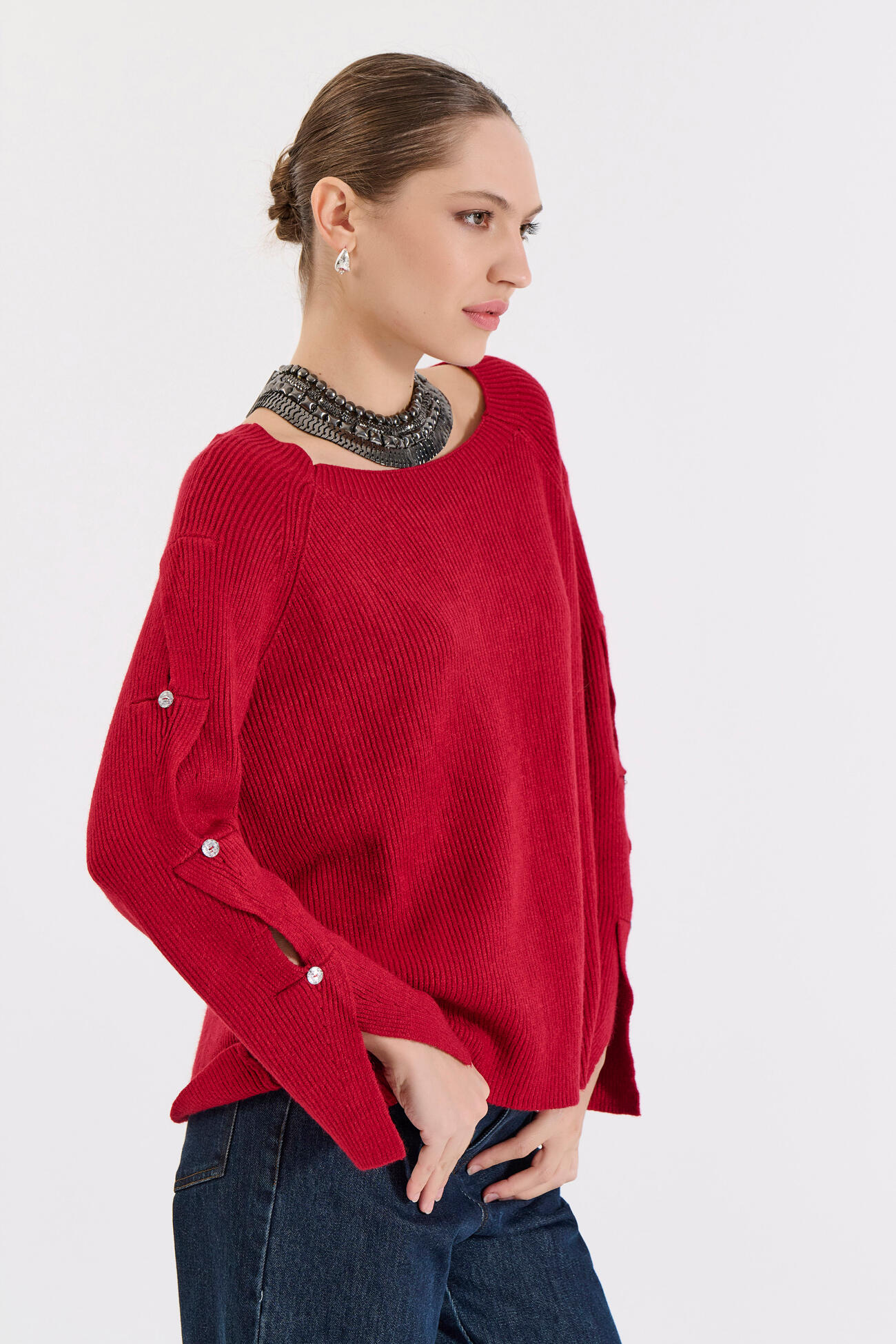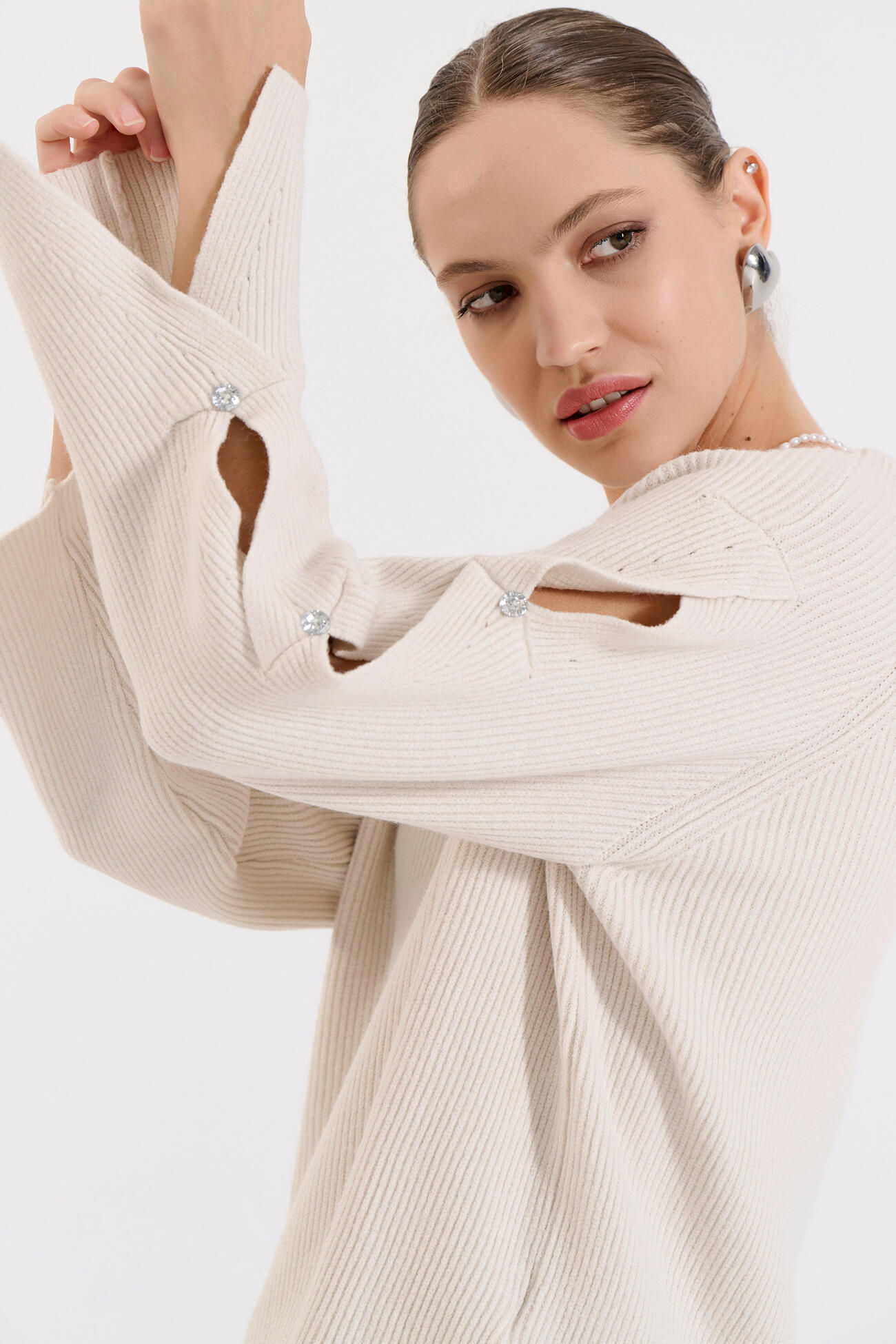 Ζεστή πλεκτή μπλούζα με ανάγλυφη υφή και λαιμόκοψη χαμόγελο. Διαθέτει διακοσμητικά κουμπιά στα μανίκια που προσθέτουν διακριτική λάμψη και μοντέρνο χαρακτήρα. Ένα ευκολοφόρετο κομμάτι που συνδυάζει άνεση και κομψότητα για καθημερινές εμφανίσεις.