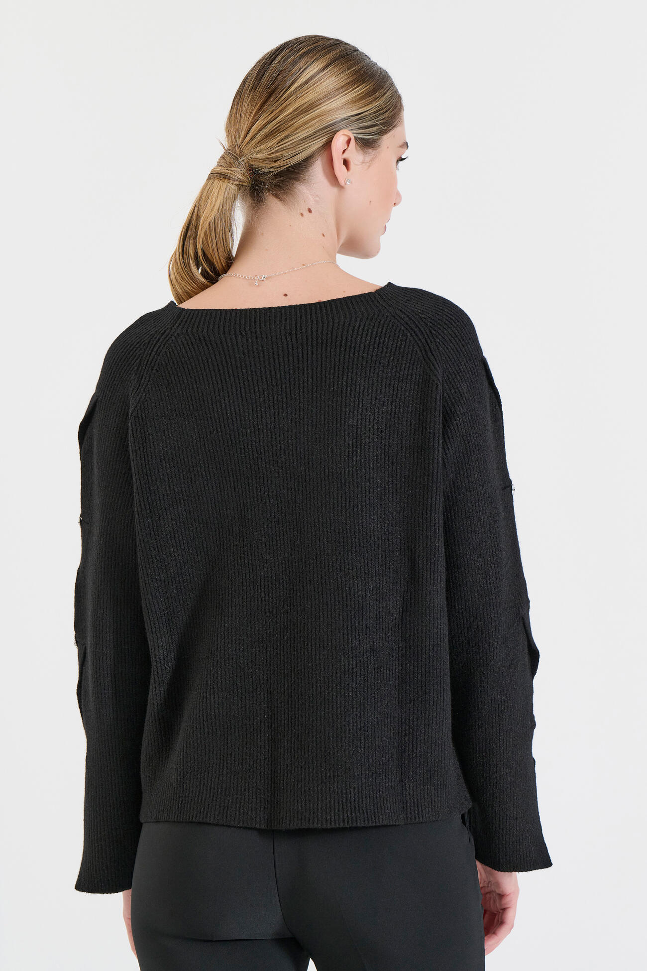 Ζεστή πλεκτή μπλούζα με ανάγλυφη υφή και λαιμόκοψη χαμόγελο. Διαθέτει διακοσμητικά κουμπιά στα μανίκια που προσθέτουν διακριτική λάμψη και μοντέρνο χαρακτήρα. Ένα ευκολοφόρετο κομμάτι που συνδυάζει άνεση και κομψότητα για καθημερινές εμφανίσεις.