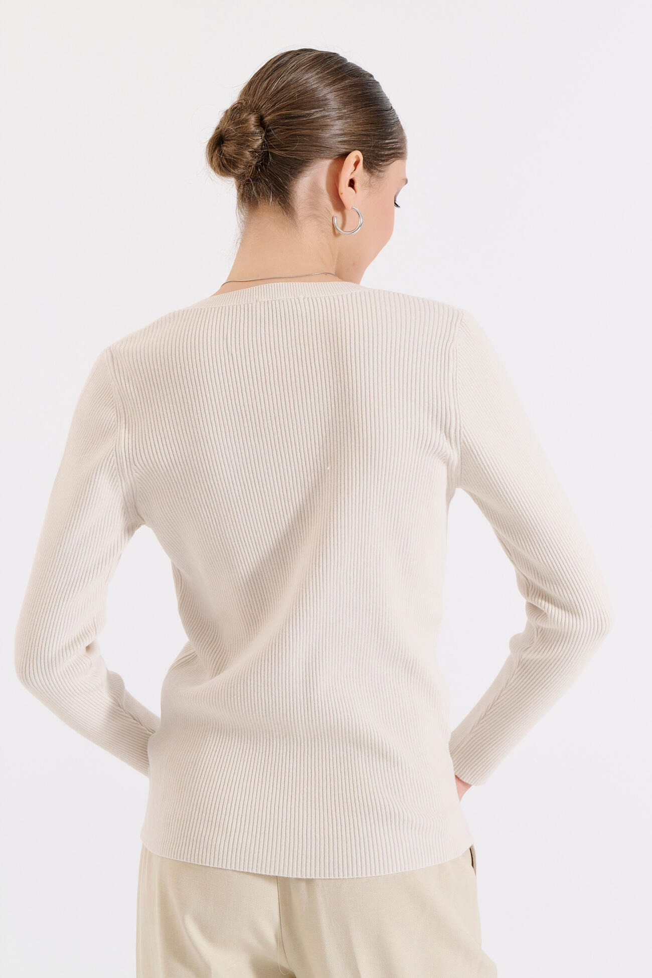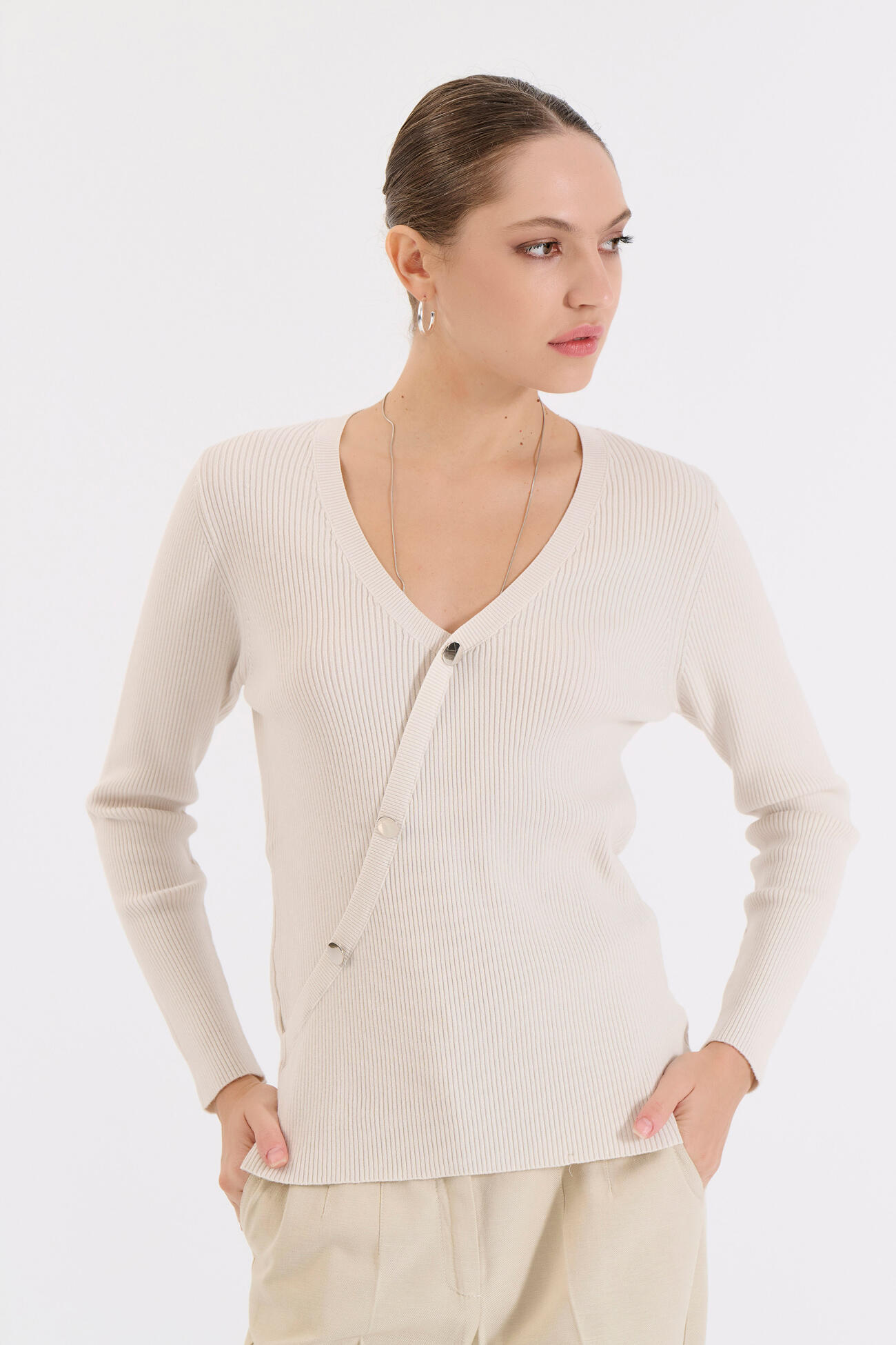 Κομψή πλεκτή μπλούζα με V ντεκολτέ και διακοσμητικά κουμπιά που προσθέτουν μοντέρνα, θηλυκή πινελιά. Διαθέτει εφαρμοστή γραμμή και ελαστική υφή που αγκαλιάζει το σώμα με άνεση. Ένα basic αλλά ξεχωριστό κομμάτι, ιδανικό για chic καθημερινές εμφανίσεις.