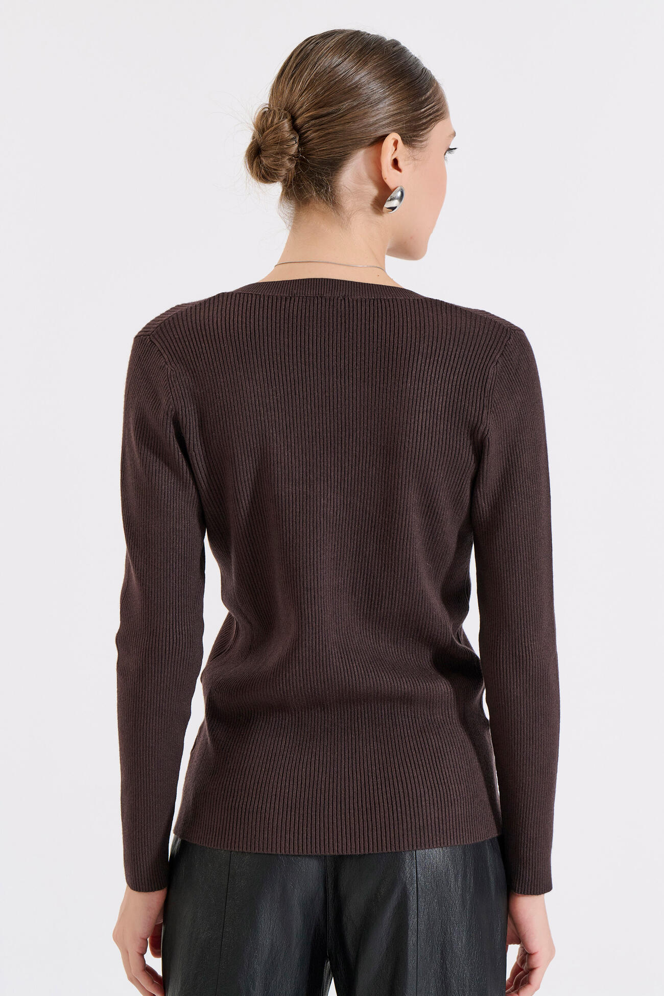 Κομψή πλεκτή μπλούζα με V ντεκολτέ και διακοσμητικά κουμπιά που προσθέτουν μοντέρνα, θηλυκή πινελιά. Διαθέτει εφαρμοστή γραμμή και ελαστική υφή που αγκαλιάζει το σώμα με άνεση. Ένα basic αλλά ξεχωριστό κομμάτι, ιδανικό για chic καθημερινές εμφανίσεις.