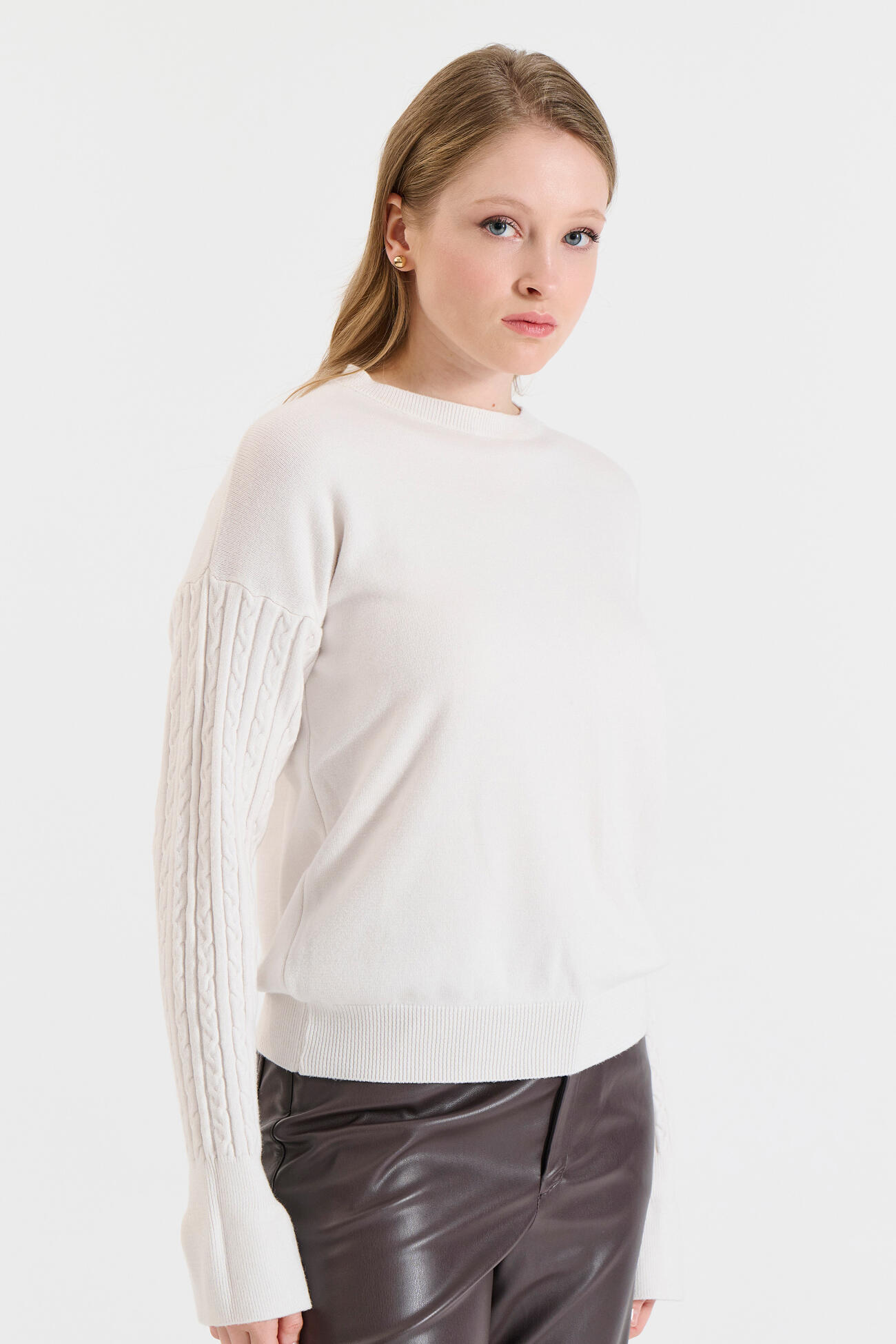 Κομψό πλεκτό πουλόβερ με στρογγυλή λαιμόκοψη και μανίκια με ανάγλυφη πλέξη πλεξούδας. Το τελείωμα των μανικιών ανοίγει ελαφρώς, προσθέτοντας θηλυκή και ιδιαίτερη πινελιά. Ένα cozy και ευκολοφόρετο κομμάτι που συνδυάζεται εύκολα με παντελόνια ή φούστες για casual και chic εμφανίσεις.