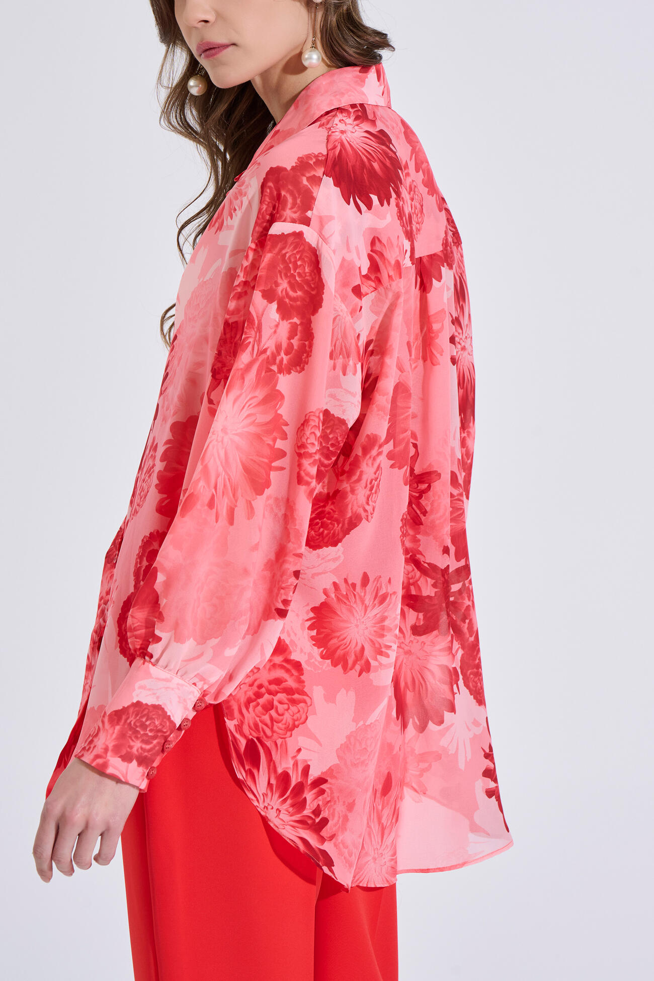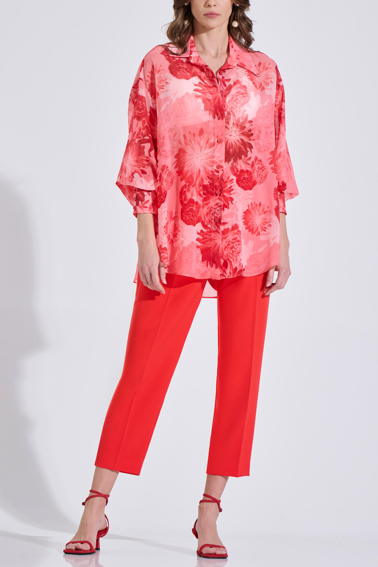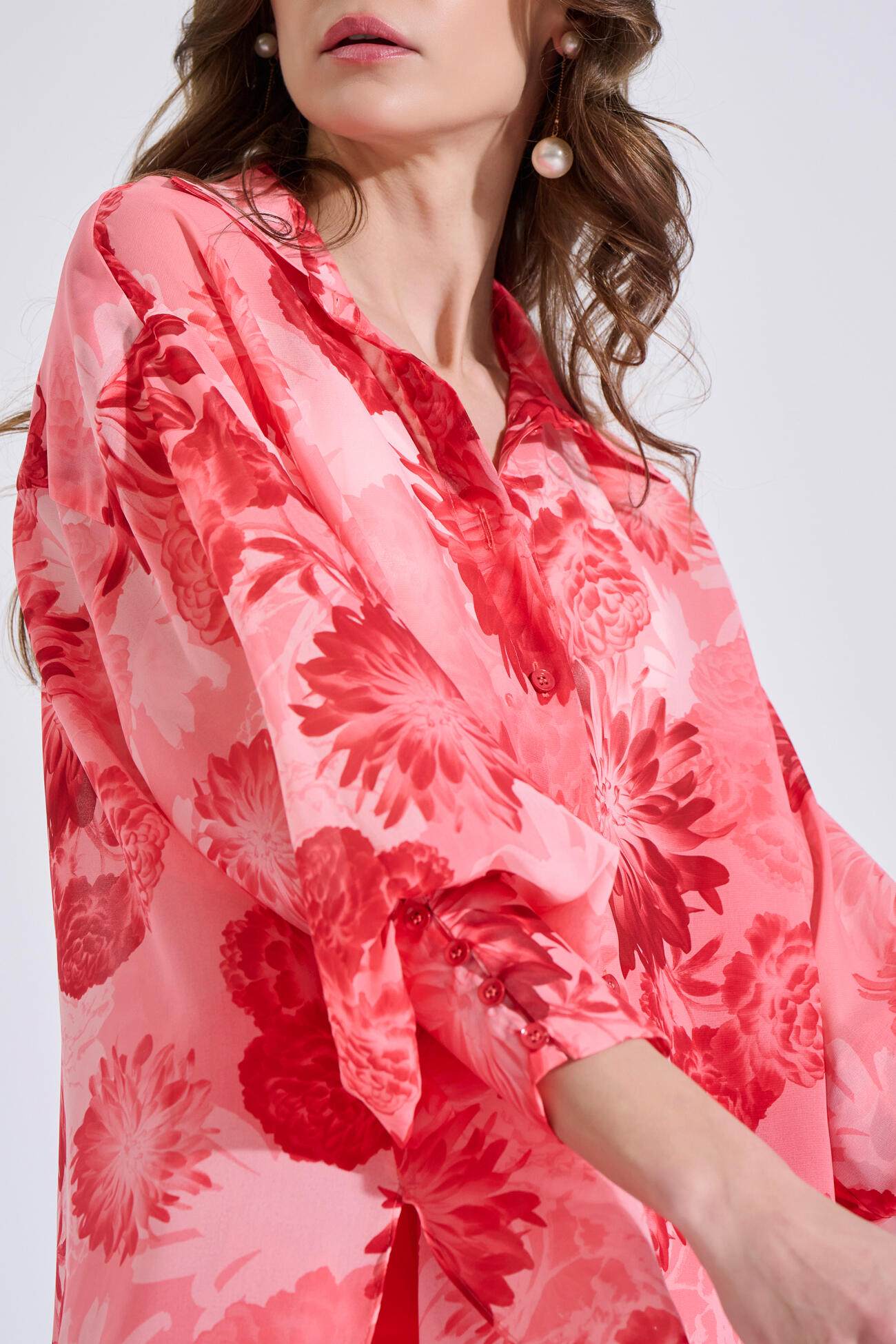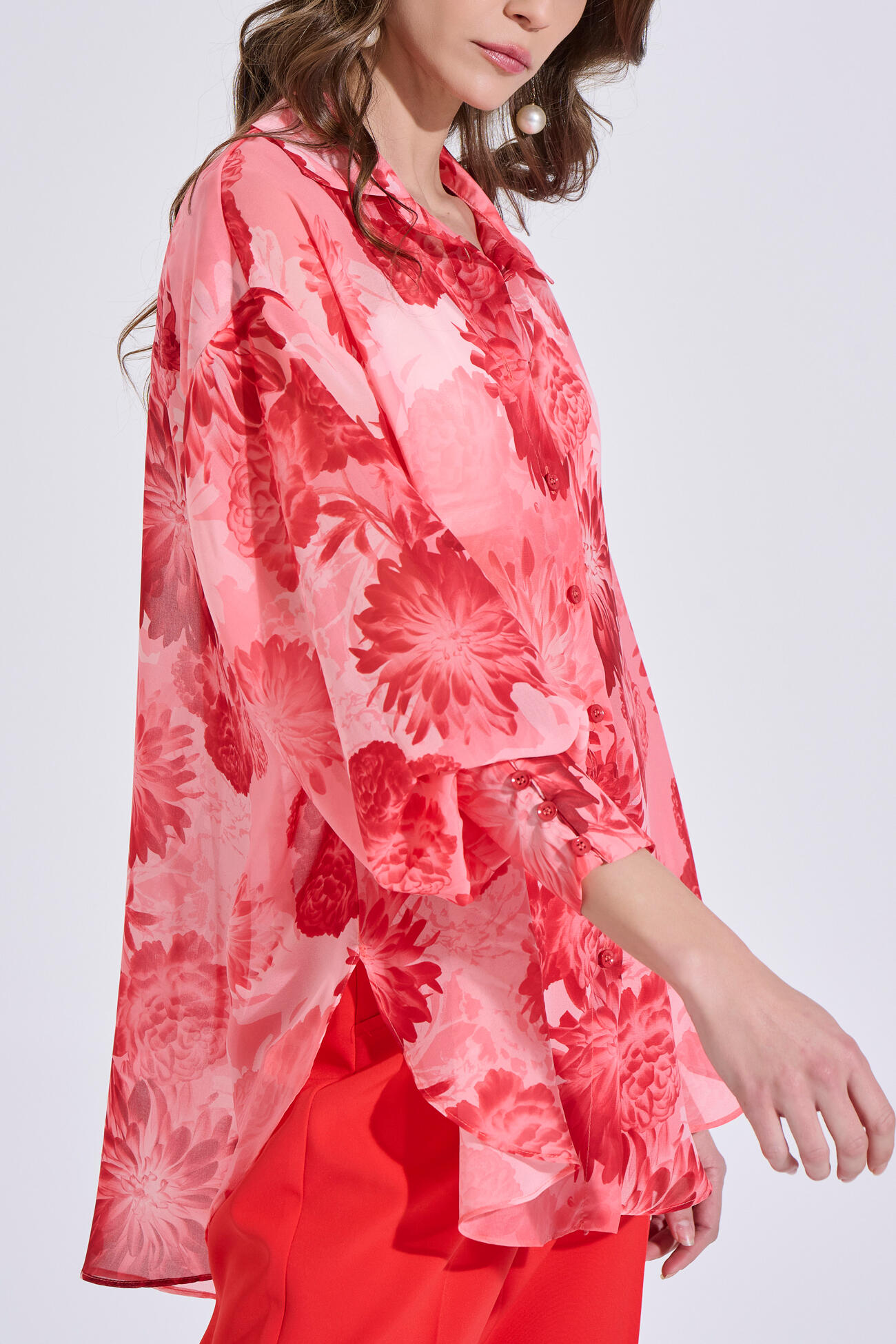 Εμπριμέ πουκάμισο σε αέρινο ύφασμα, με γιακά και μπροστινό κλείσιμο με κουμπιά. Διαθέτει μακριά μανίκια με μανσέτες, ενώ στο πίσω μέρος είναι πιο μακρύ για κομψή εφαρμογή