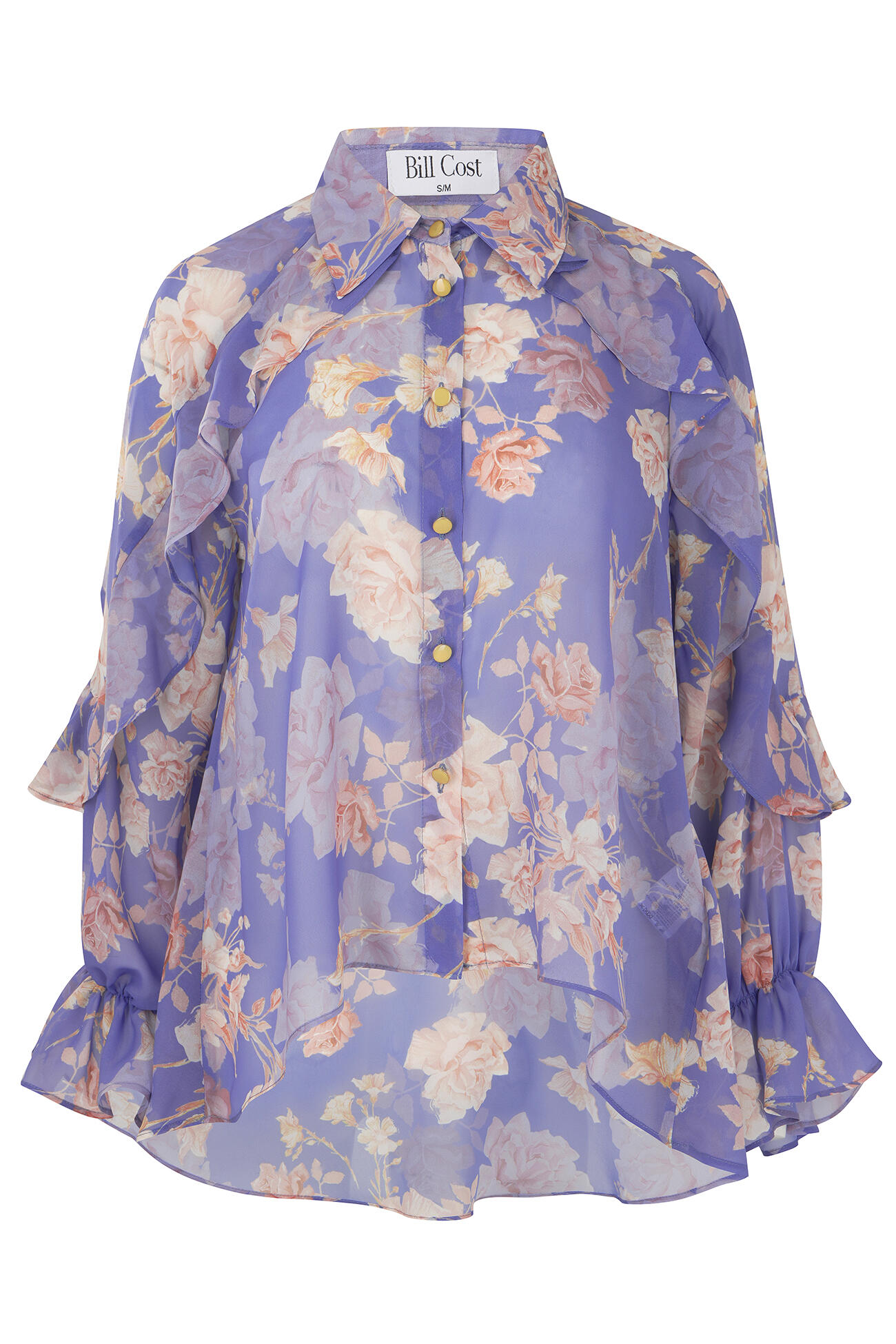 Εμπριμέ πουκάμισο από ελαφρύ, διάφανο ύφασμα. Διαθέτει κλασικό γιακά και κλείσιμο με κουμπιά. Βολάν στους ώμους και κατά μήκος των μανικιών, μακρύ μανίκι με λάστιχο στο τελείωμα, άνετη γραμμή.