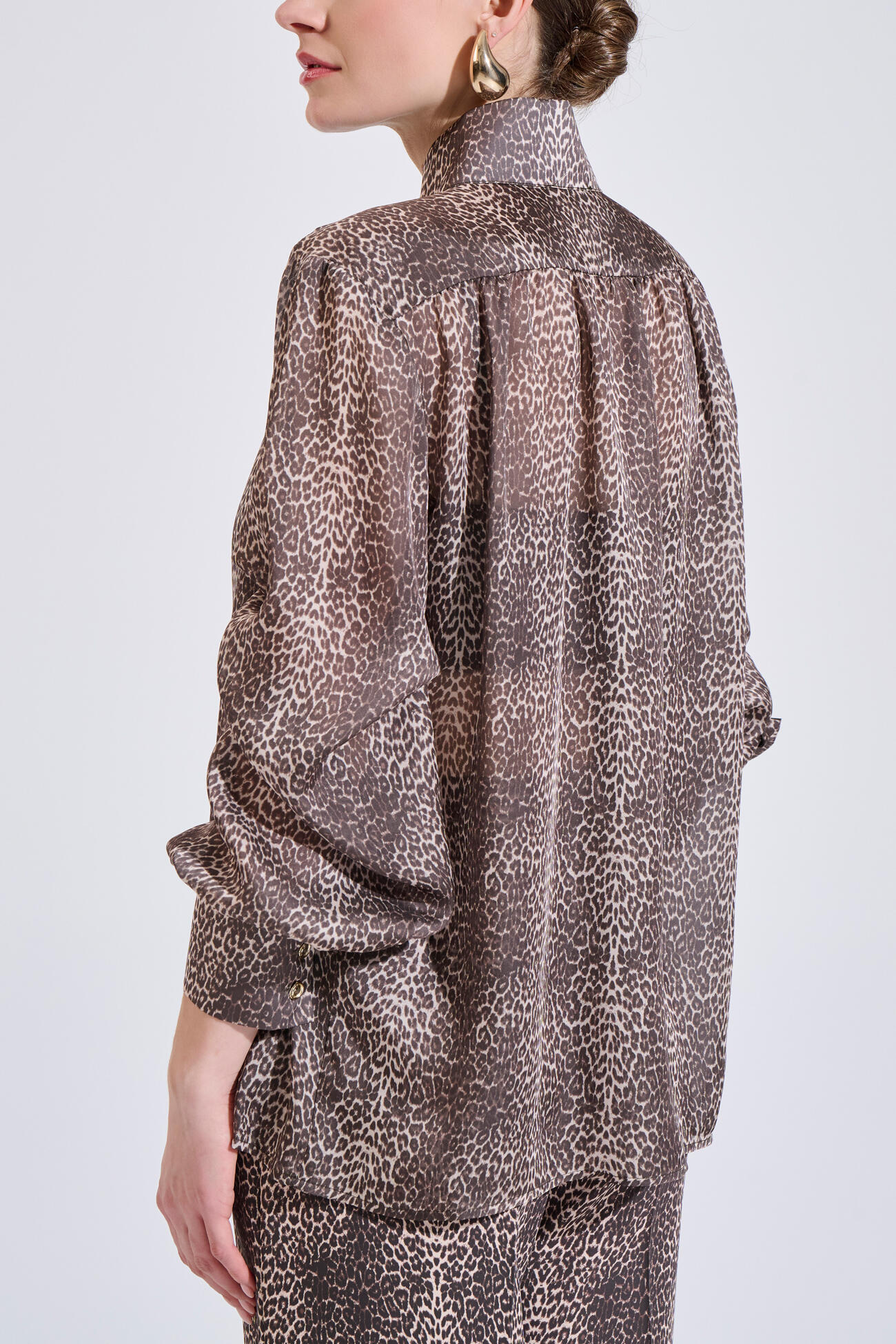 Πουκάμισο σε άνετη γραμμή με all-over λεοπάρ μοτίβο. Διαθέτει όρθιο γιακά, μεταλλικά κουμπιά μπροστά και μανίκια με μανσέτα.Συνδυάζεται ιδανικά με το παντελόνι 10-342479-0 για ολοκληρωμένο σετ.