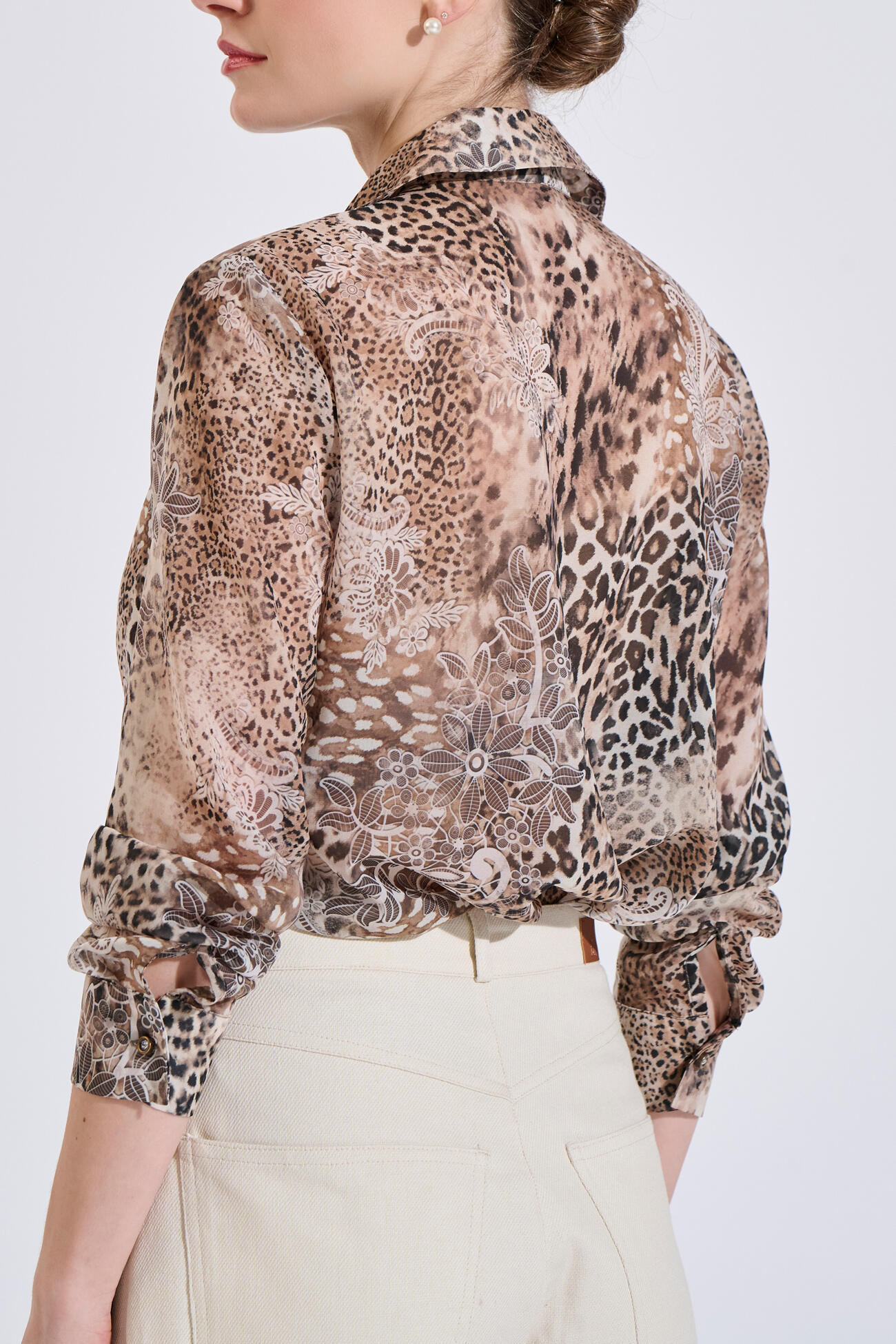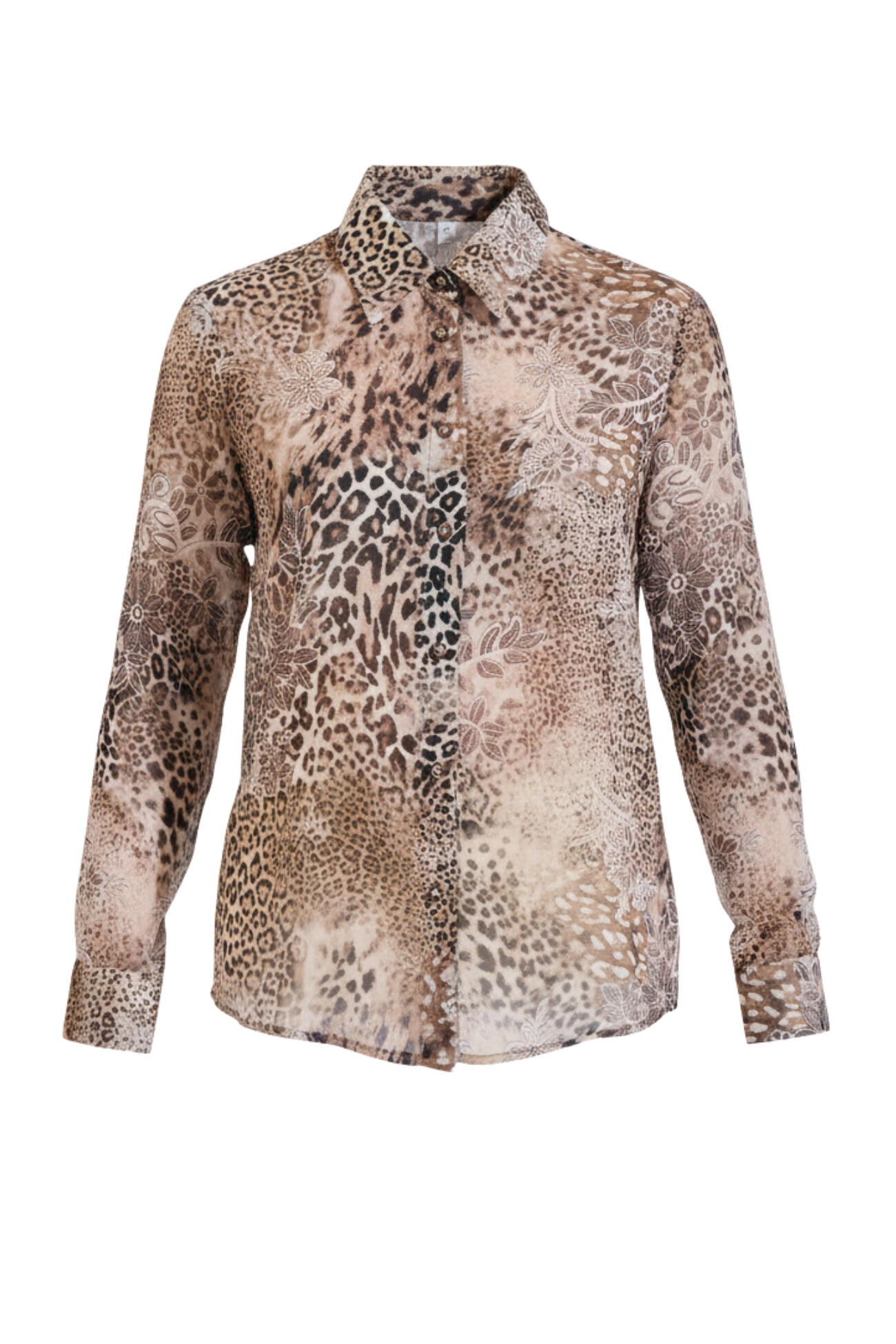 Πουκάμισο σε άνετη γραμμή με all-over λεοπάρ μοτίβο. Διαθέτει κλασικό γιακά και μπροστινό κλείσιμο με κουμπιά κατά μήκος. Ολοκληρώνεται με μακριά μανίκια με μανσέτα και άνετη εφαρμογή.