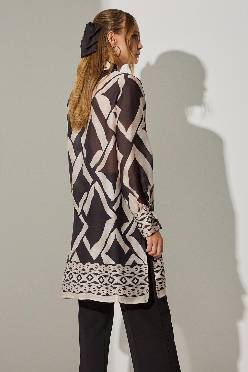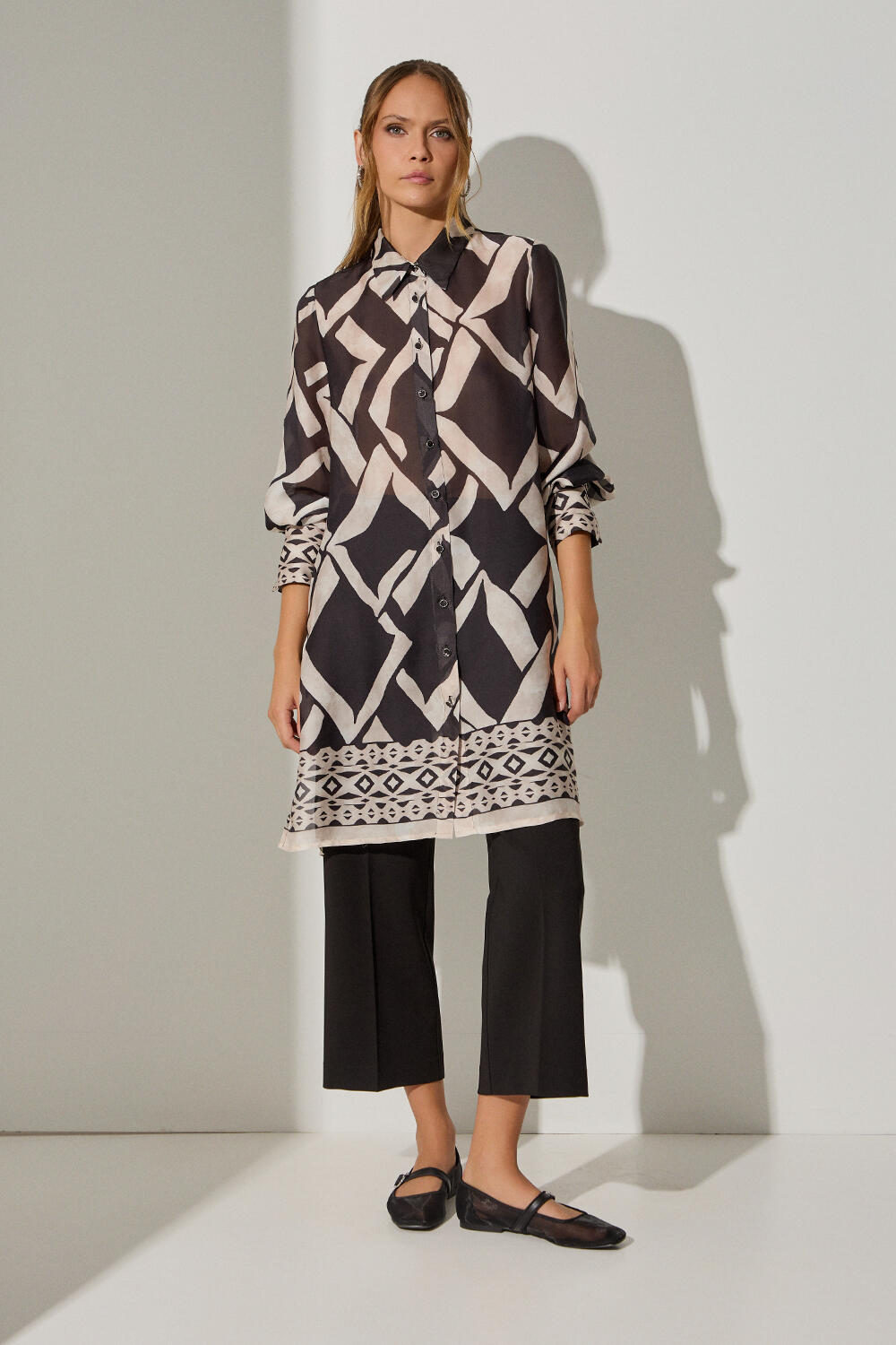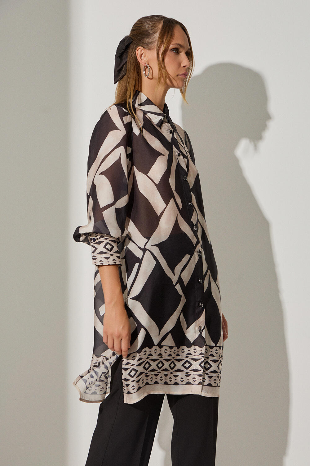 Πουκαμίσα με γεωμετρικά σχέδια Κωδικός 10-342222-0 Περιγραφή Πουκαμίσα εμπριμέ σε ημιδιάφανο κρεπ ύφασμα με κουμπιά και μπορντούρα στο τελείωμα και στις μανσέτες Σύνθεση 100% polyester