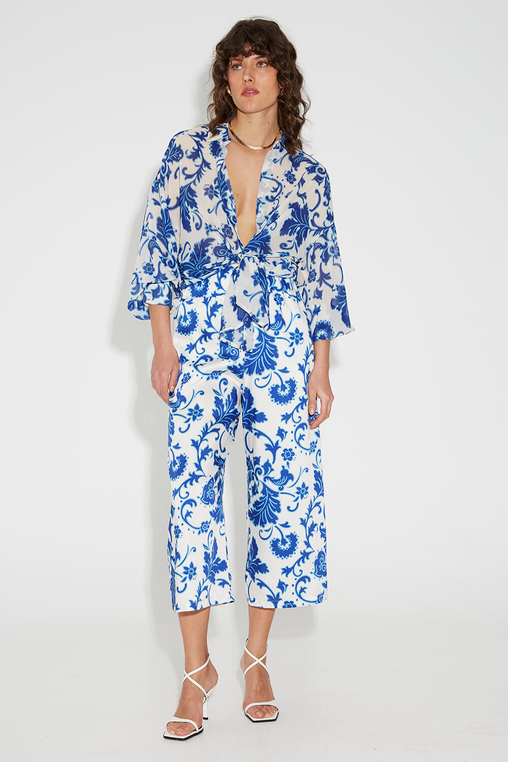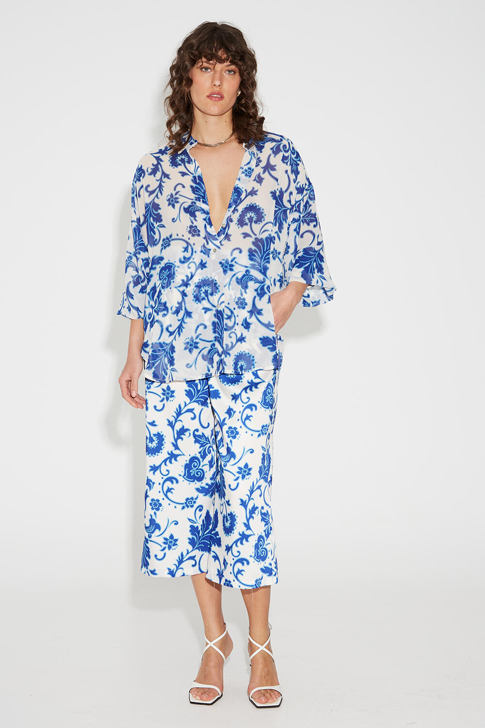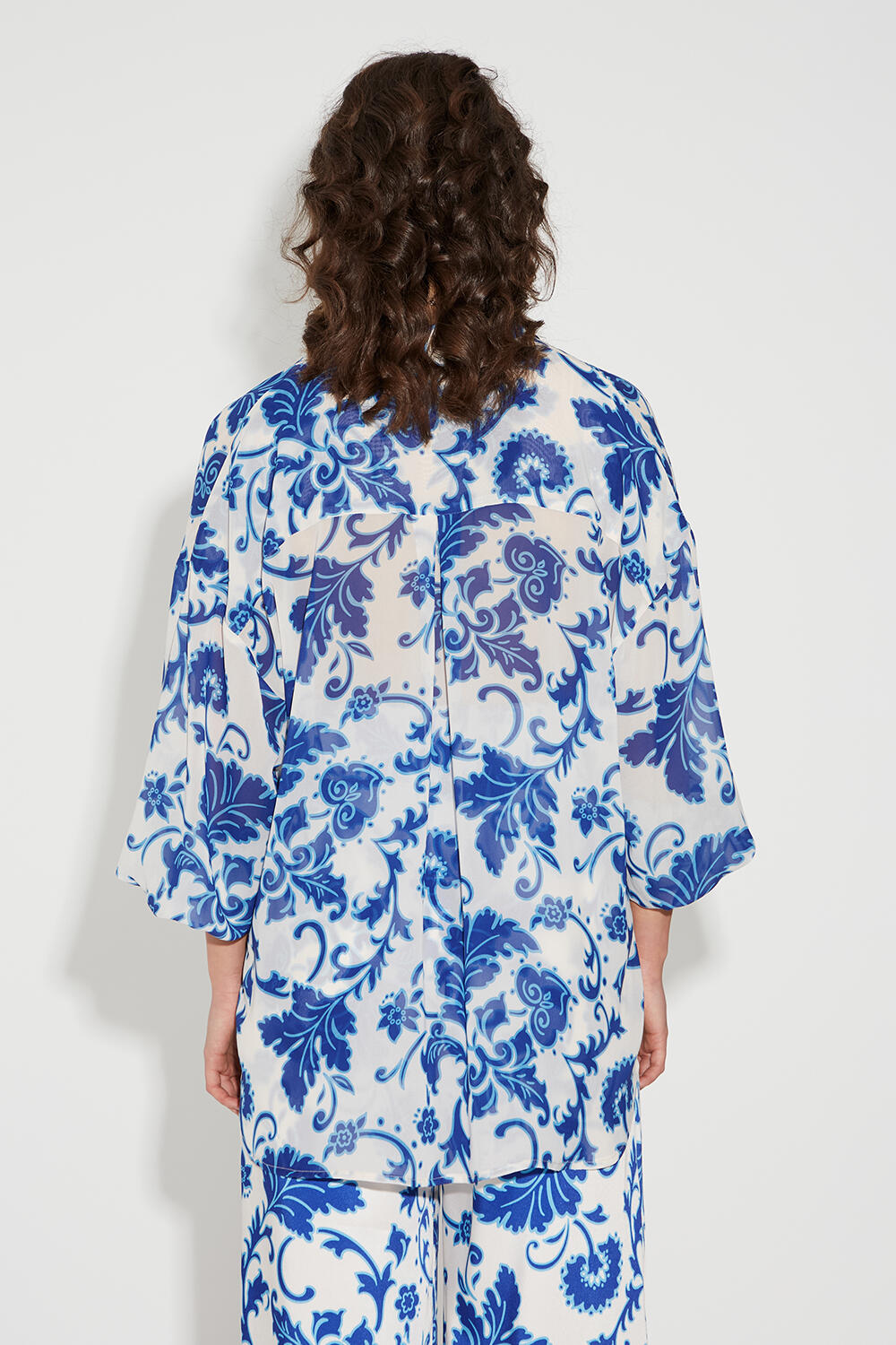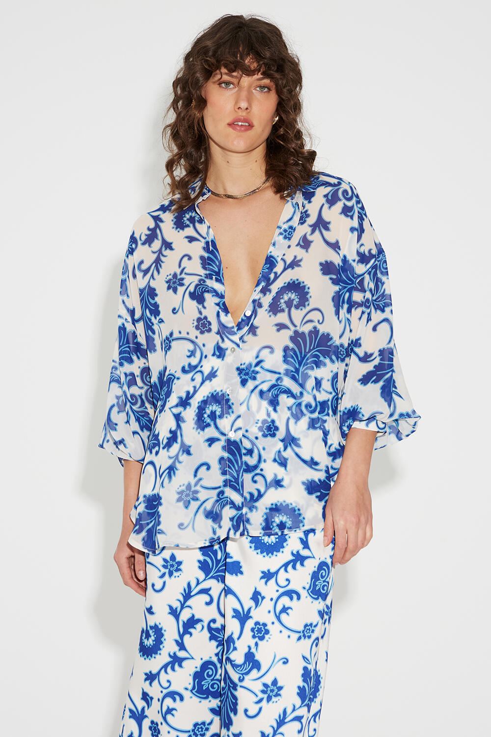 Πουκάμισο floral oversize, ημιδιάφανο, με κλείσιμο μπροστά με κουμπιά και γιακά. Μανίκια balloon που κλείνουν στη μανσέτα με κουμπιά.