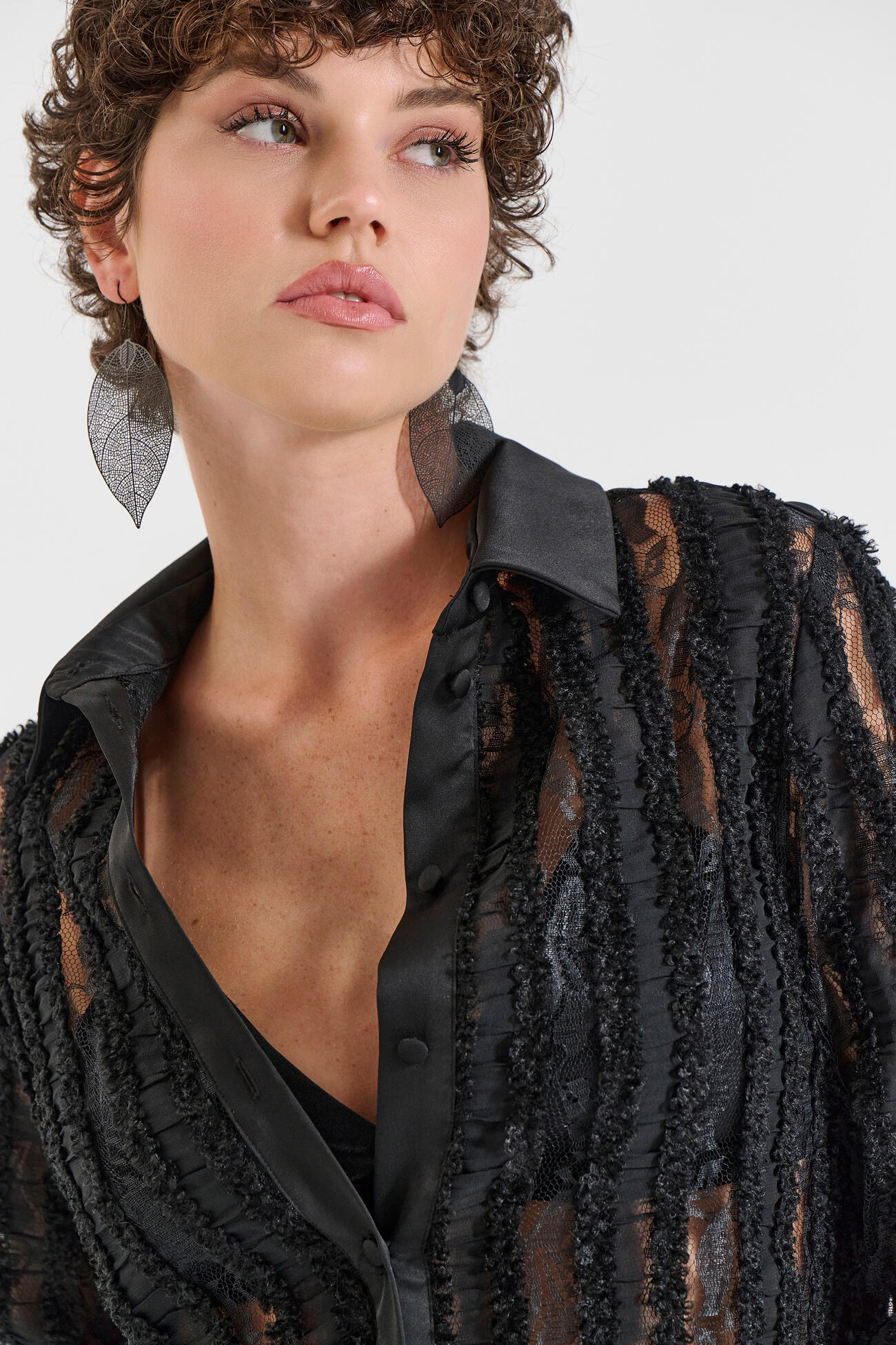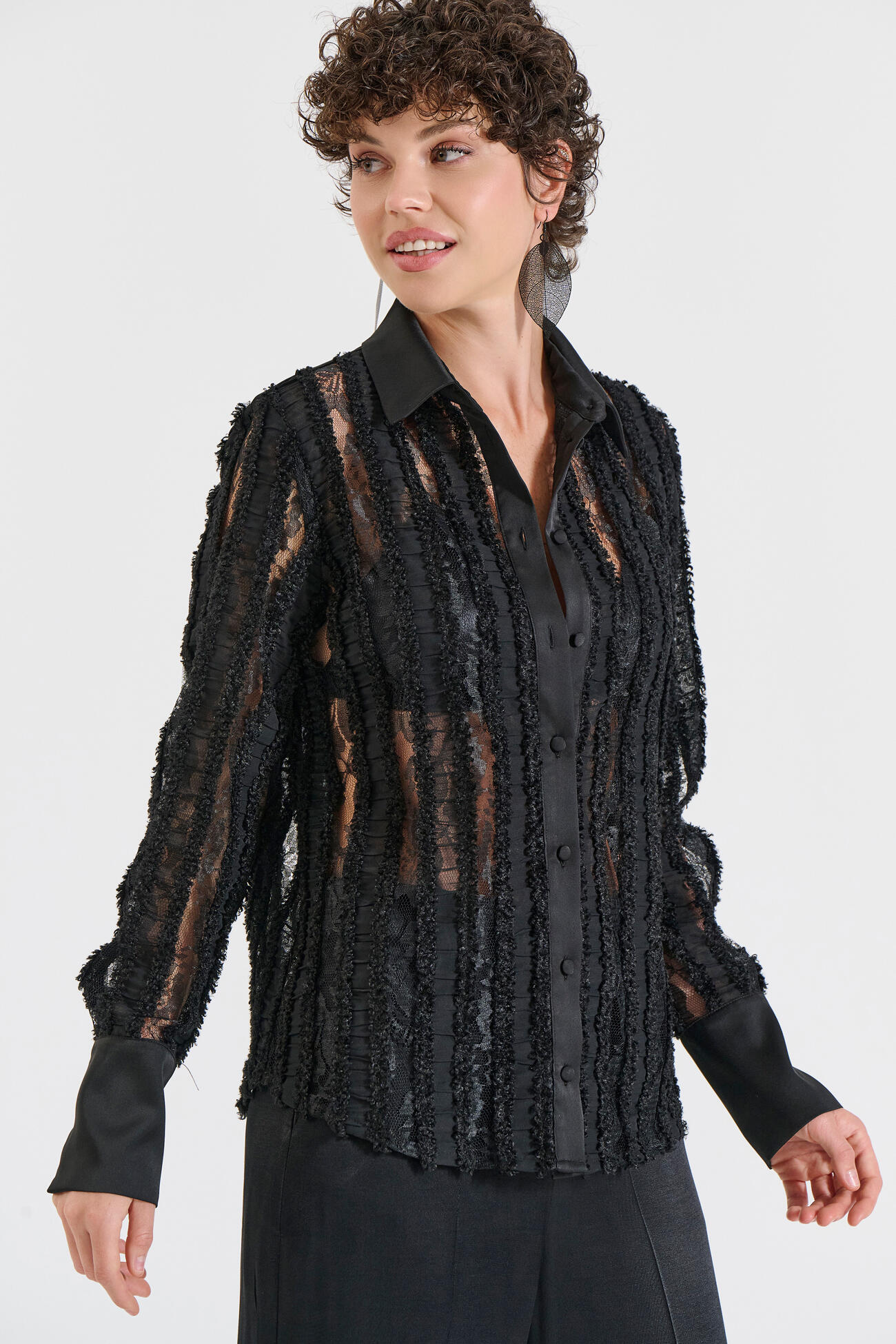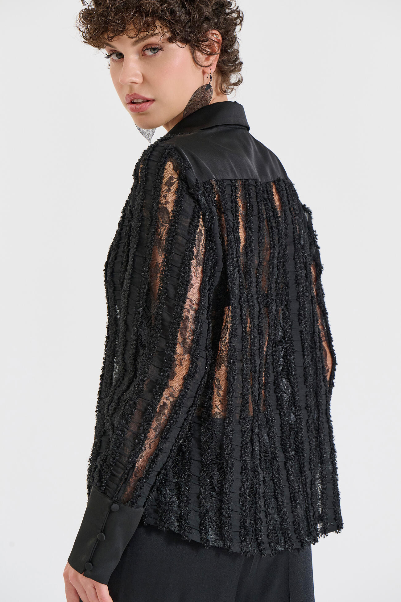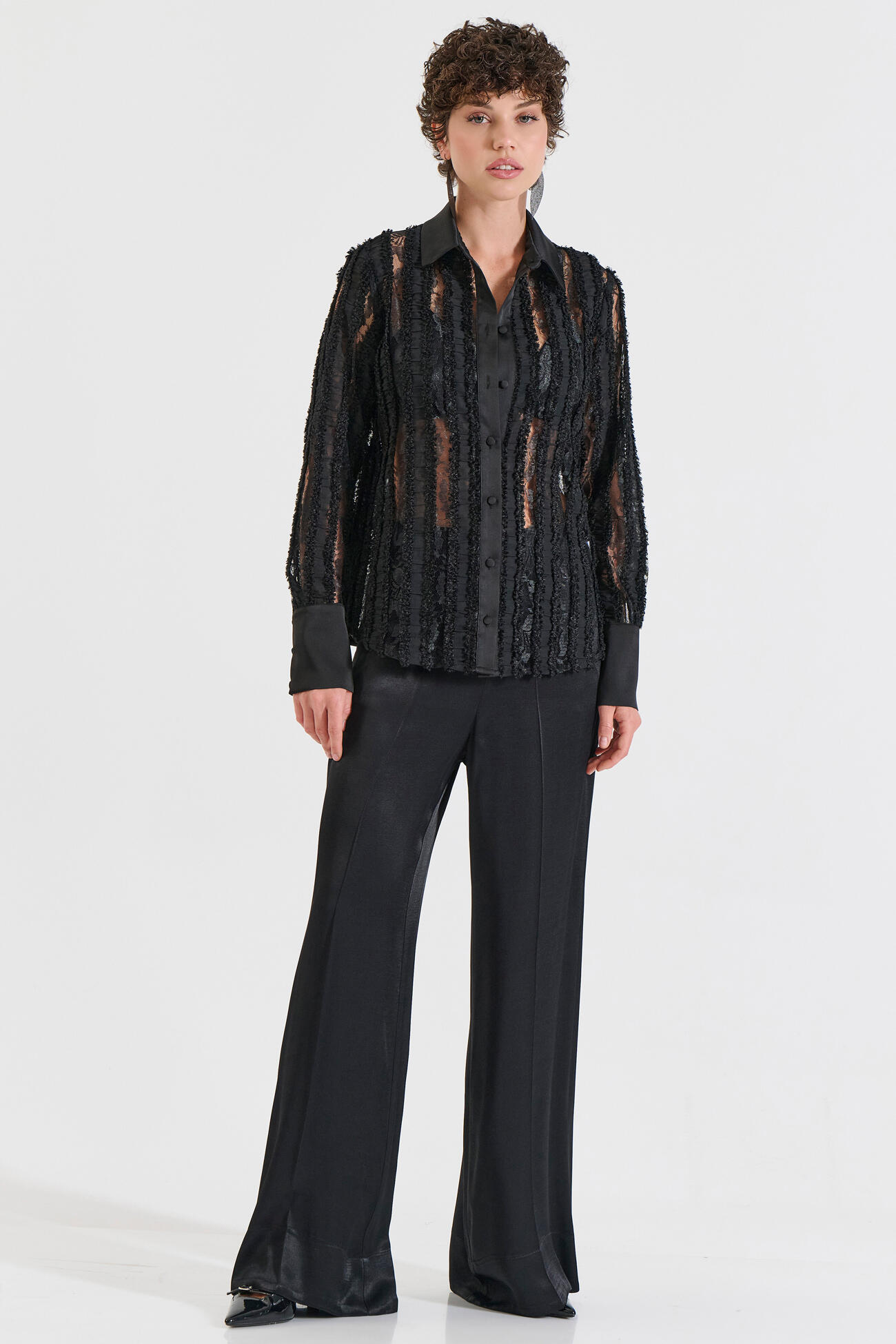 Εντυπωσιακό πουκάμισο με ανάγλυφη ριγέ υφή που δημιουργεί διακριτή διαφάνεια και προσθέτει statement χαρακτήρα. Διαθέτει κλασικό γιακά,κουμπιά στο μπροστινό μέρος και μανσέτες από απαλή σατέν υφή για κομψό τελείωμα. Ένα ξεχωριστό κομμάτι που συνδυάζει πολυτέλεια και σύγχρονη αισθητική, ιδανικό για βραδινές εμφανίσεις ή ιδιαίτερες περιστάσεις.