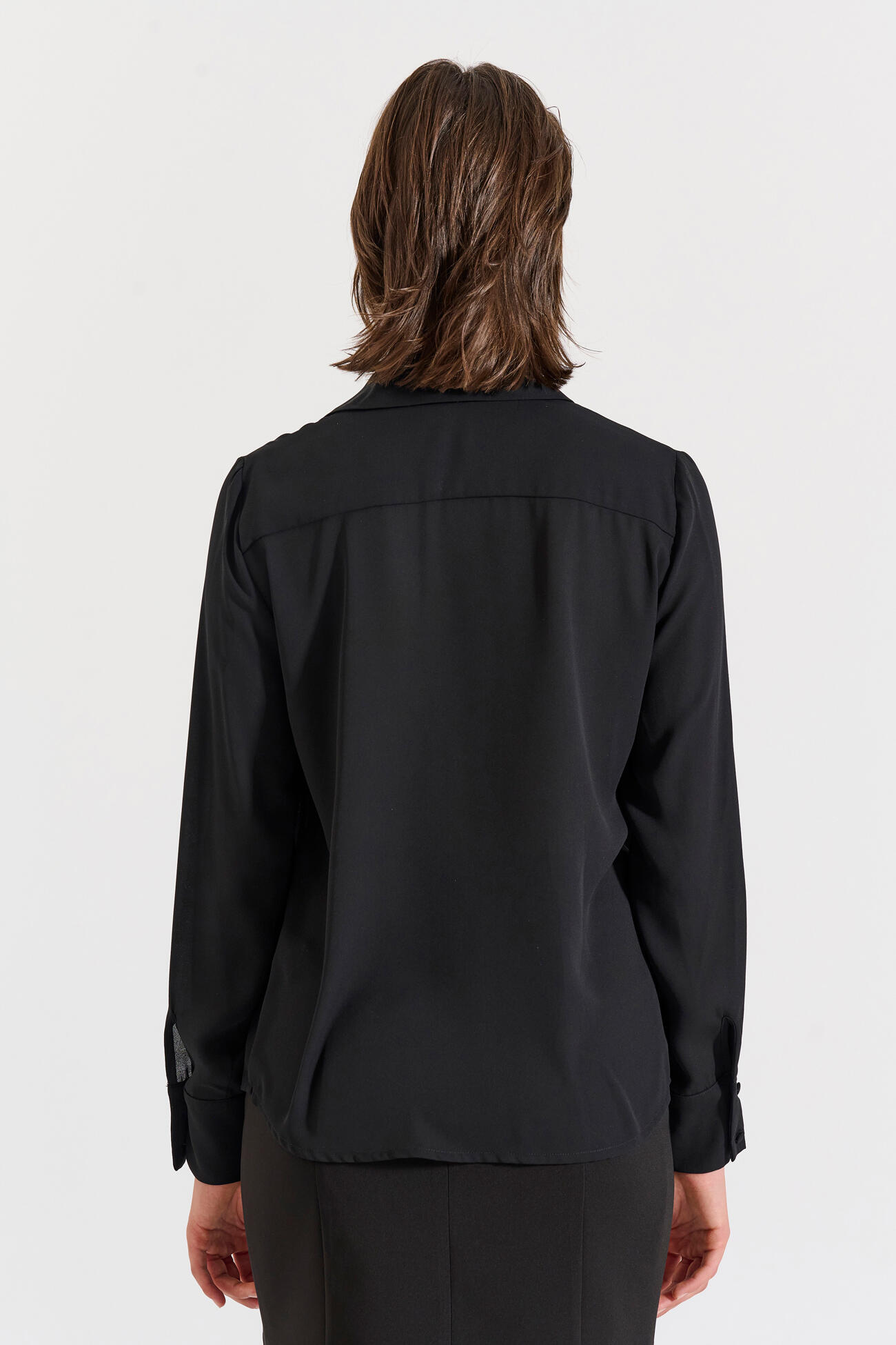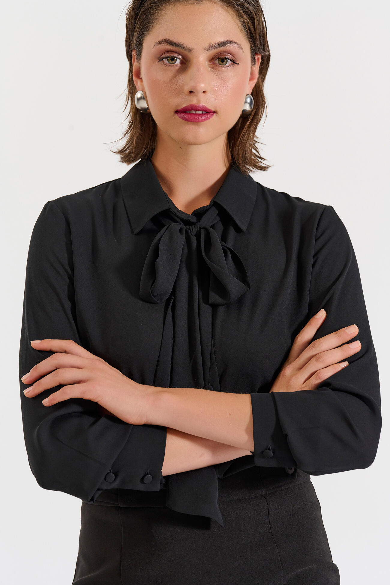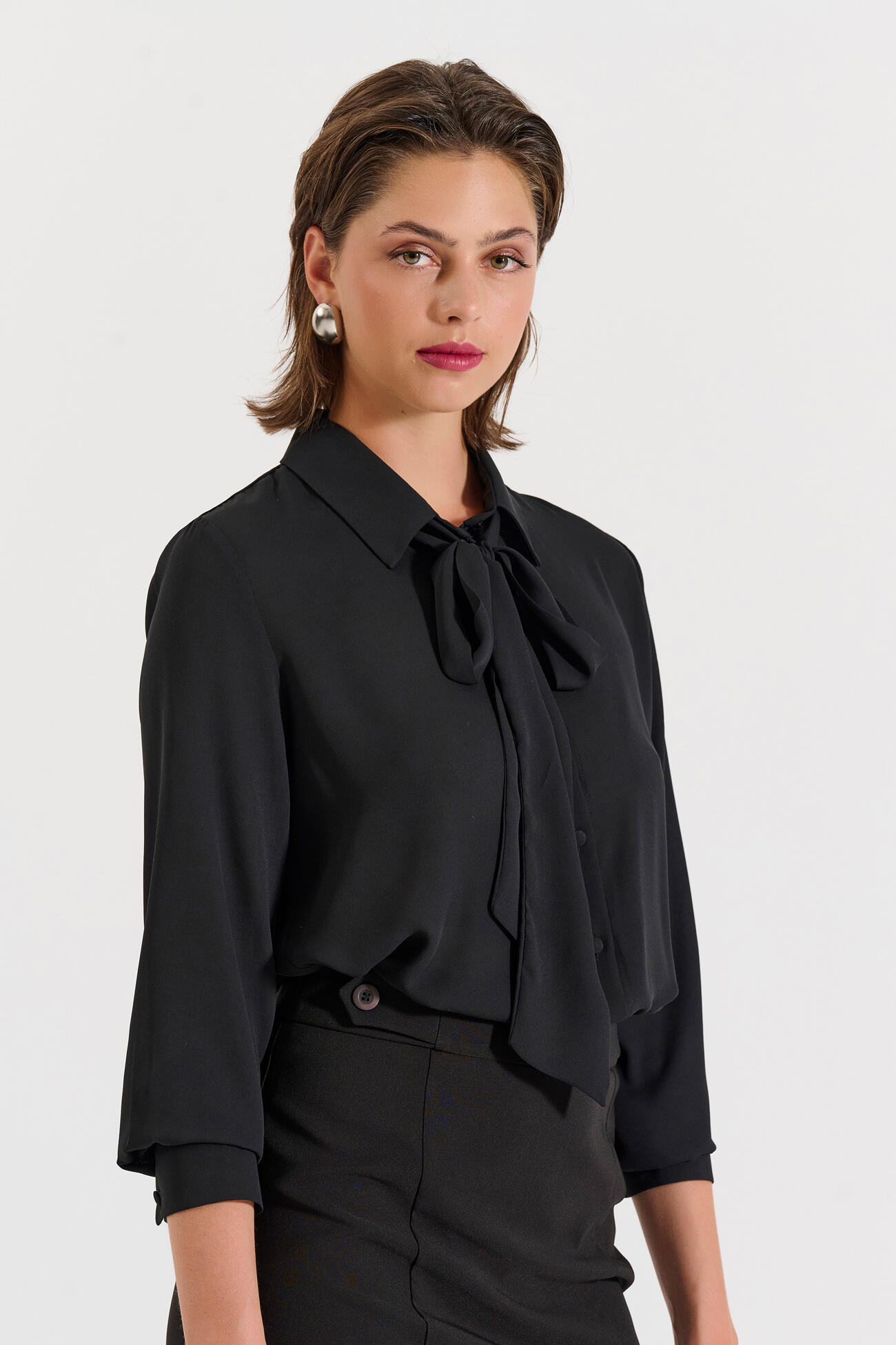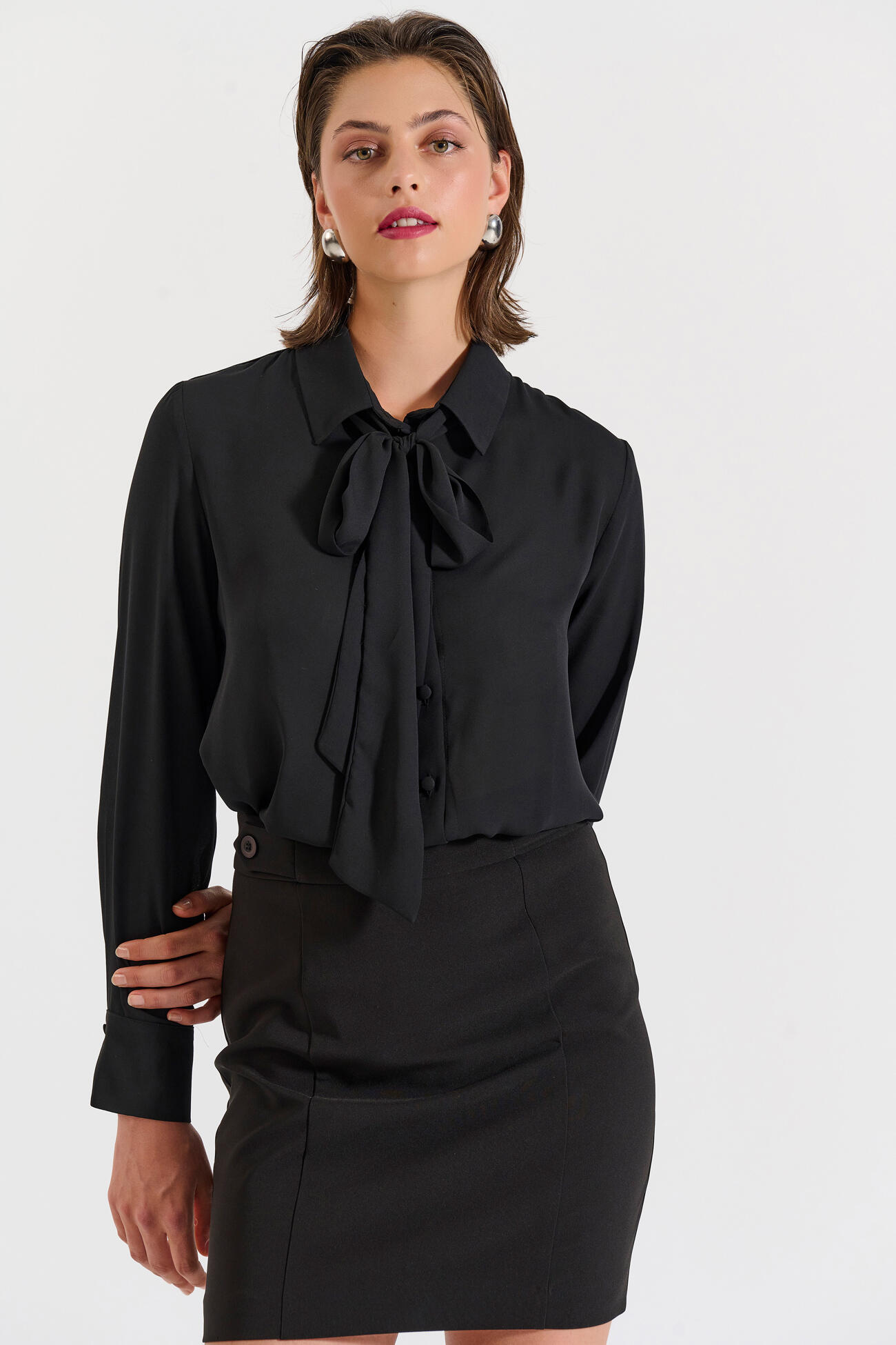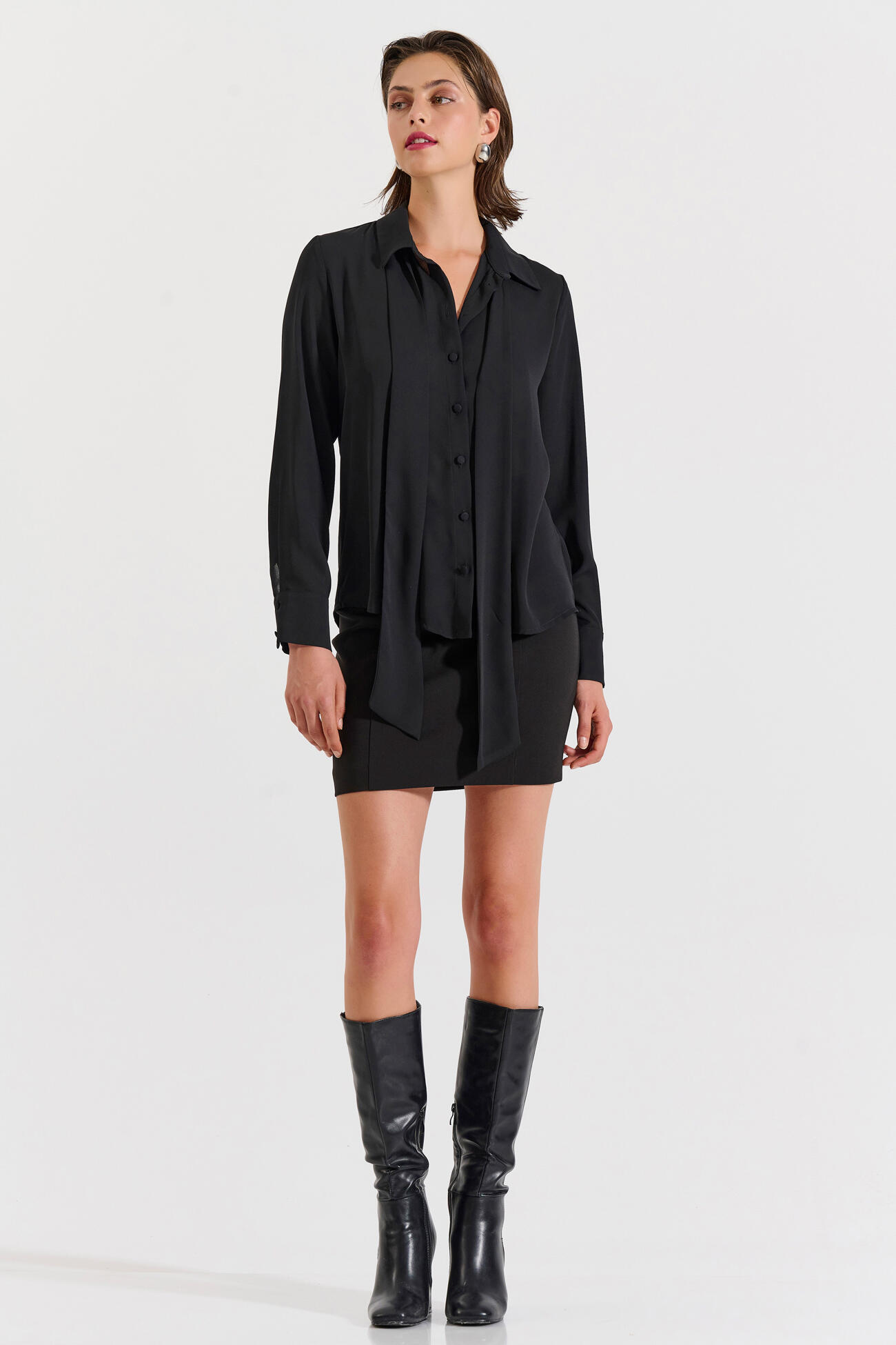 Πουκάμισο σε χαλαρή γραμμή με διακριτικό δέσιμο στον λαιμό και κουμπιά μπροστά. Ένα κομμάτι που συνδυάζει κομψότητα για κάθε περίσταση.