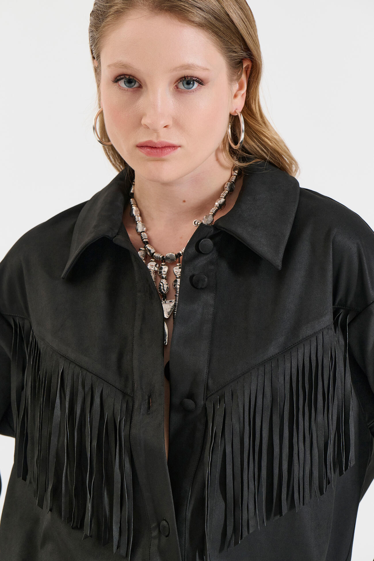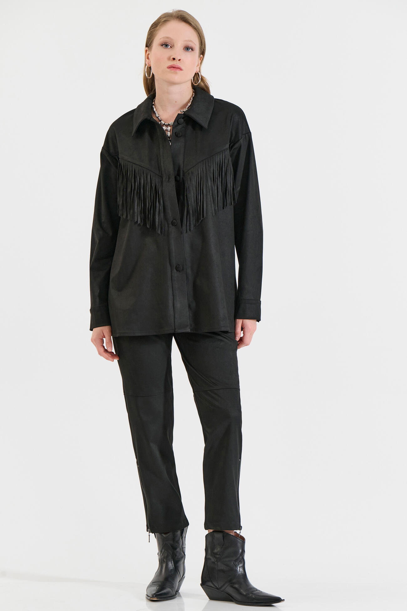 Μοντέρνο πουκάμισο σε απαλή υφή σουέτ με διακοσμητικά κρόσια στο μπροστινό μέρος που χαρίζουν κίνηση. Ένα statement κομμάτι που συνδυάζει άνεση και στυλ.