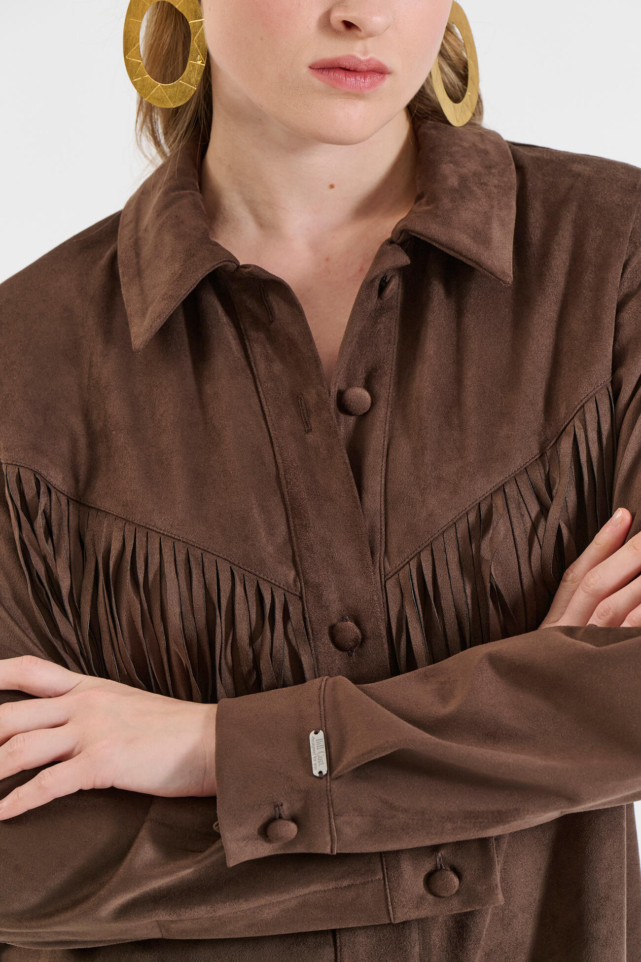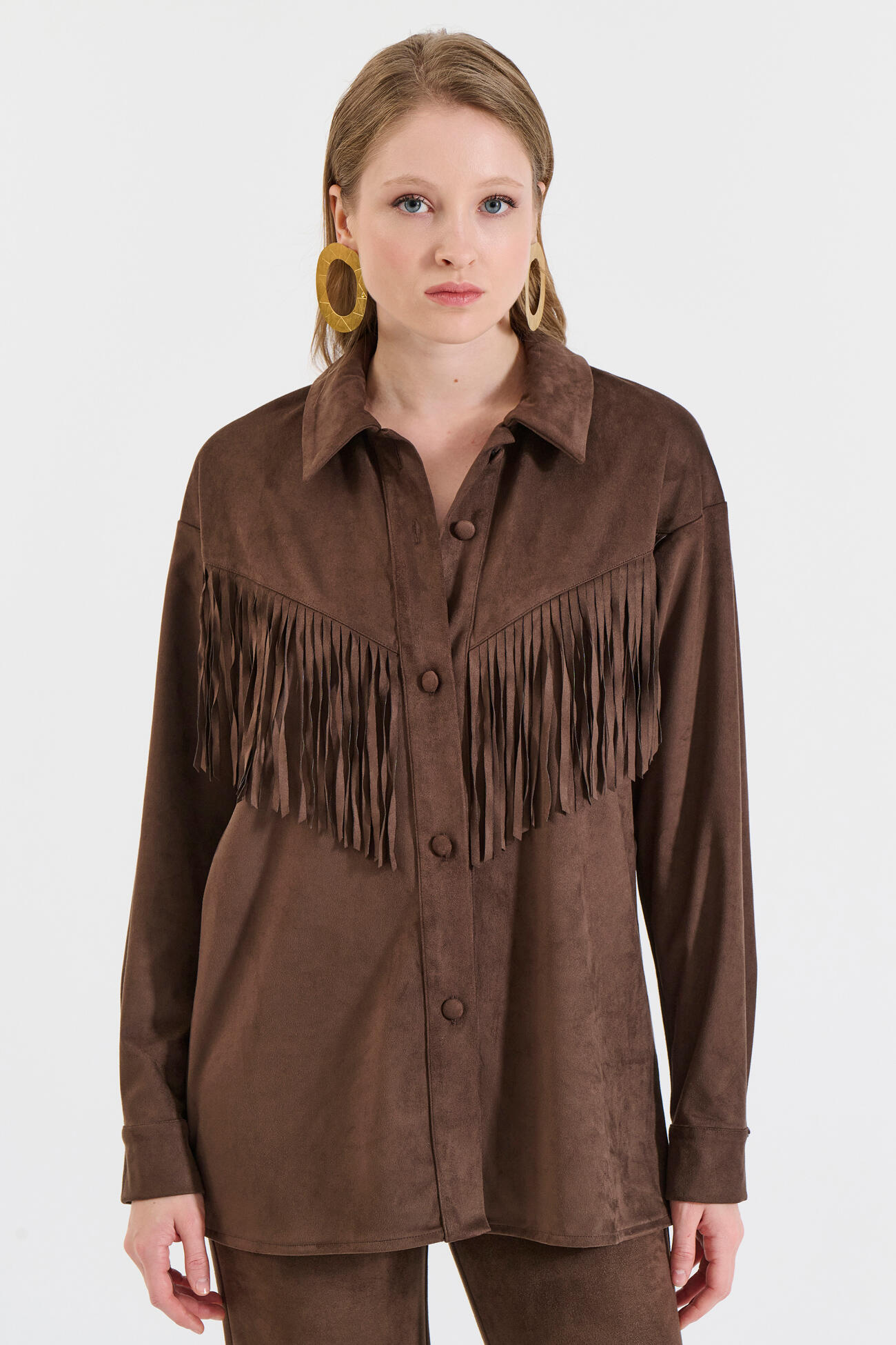 Μοντέρνο πουκάμισο σε απαλή υφή σουέτ με διακοσμητικά κρόσια που χαρίζουν κίνηση. Ένα statement κομμάτι που συνδυάζει άνεση και στυλ.