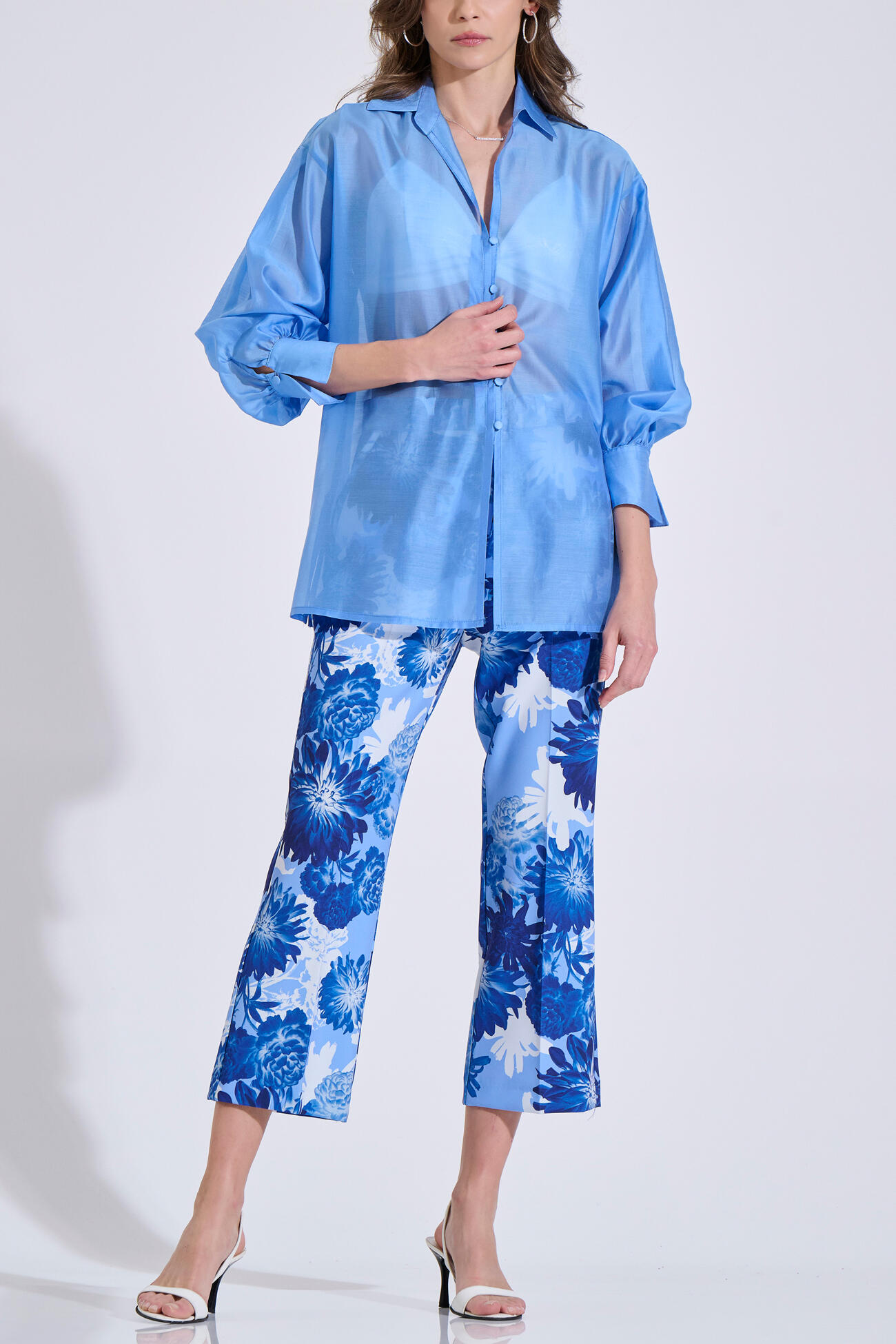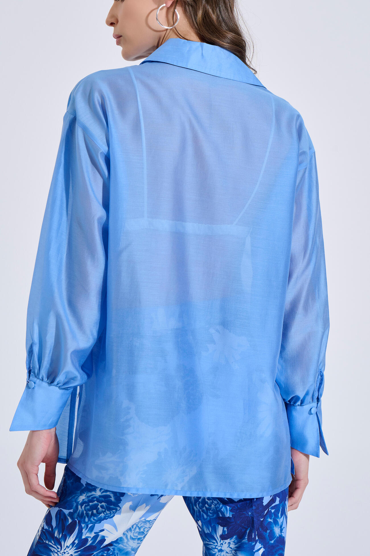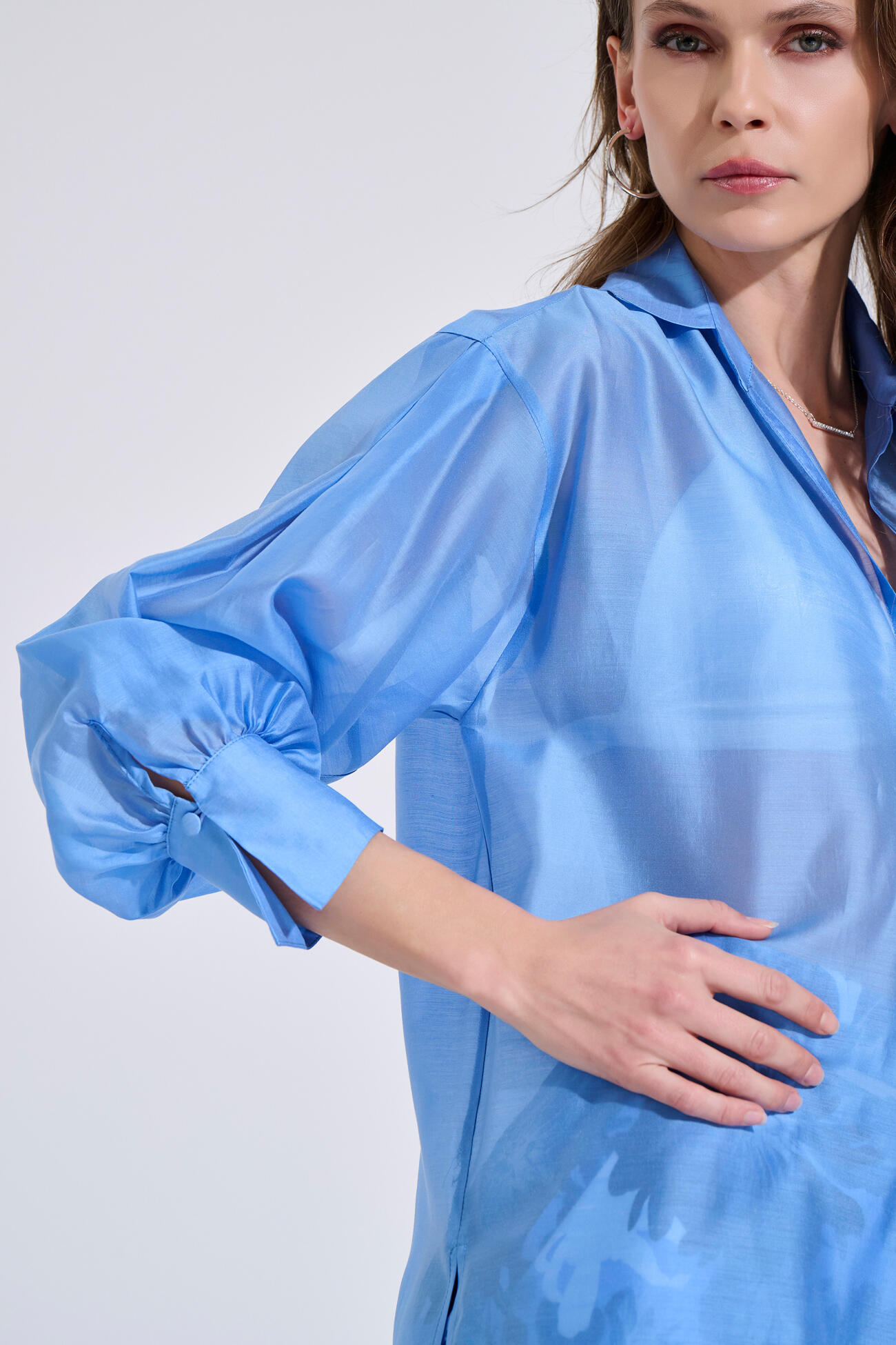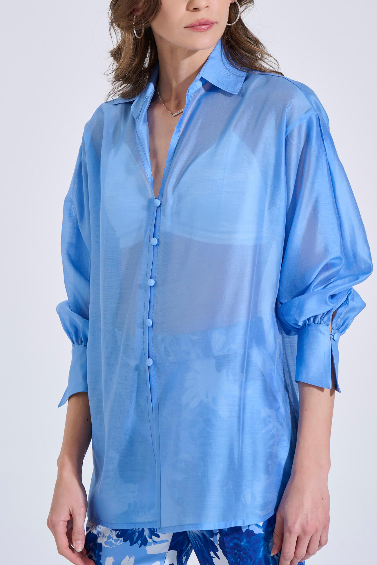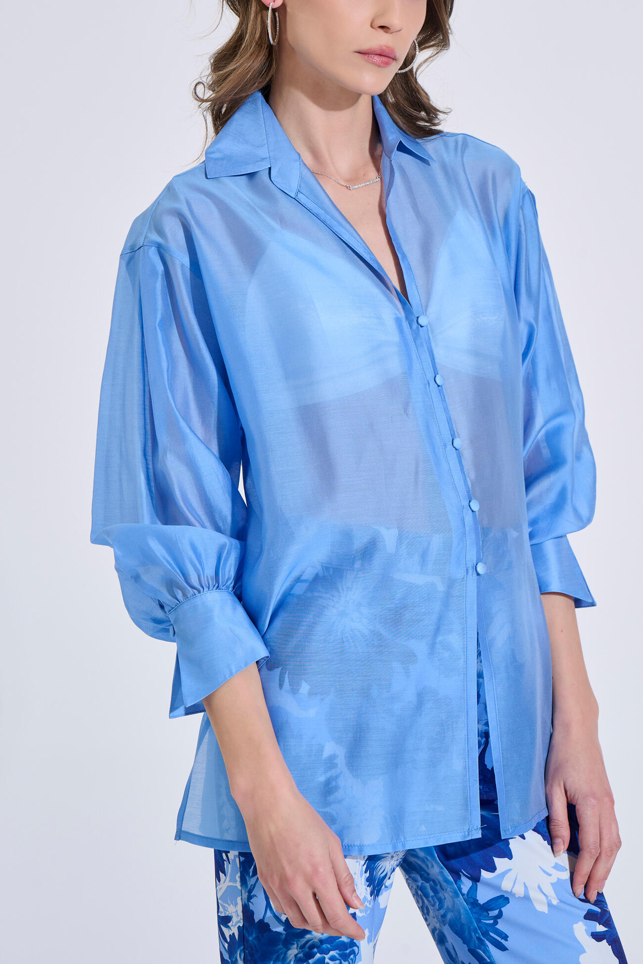 Πουκάμισο σε αέρινο ύφασμα με lyocell, γιακά και μπροστινό κλείσιμο με κουμπιά. Διαθέτει μακριά μανίκια με μανσέτα και ανοίγματα στο πλάι.