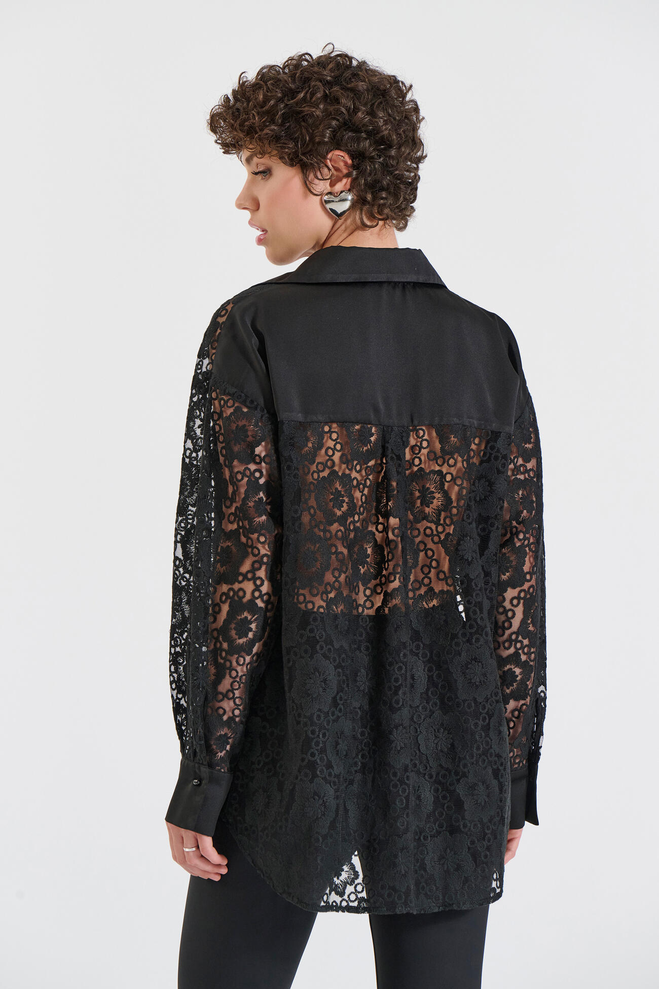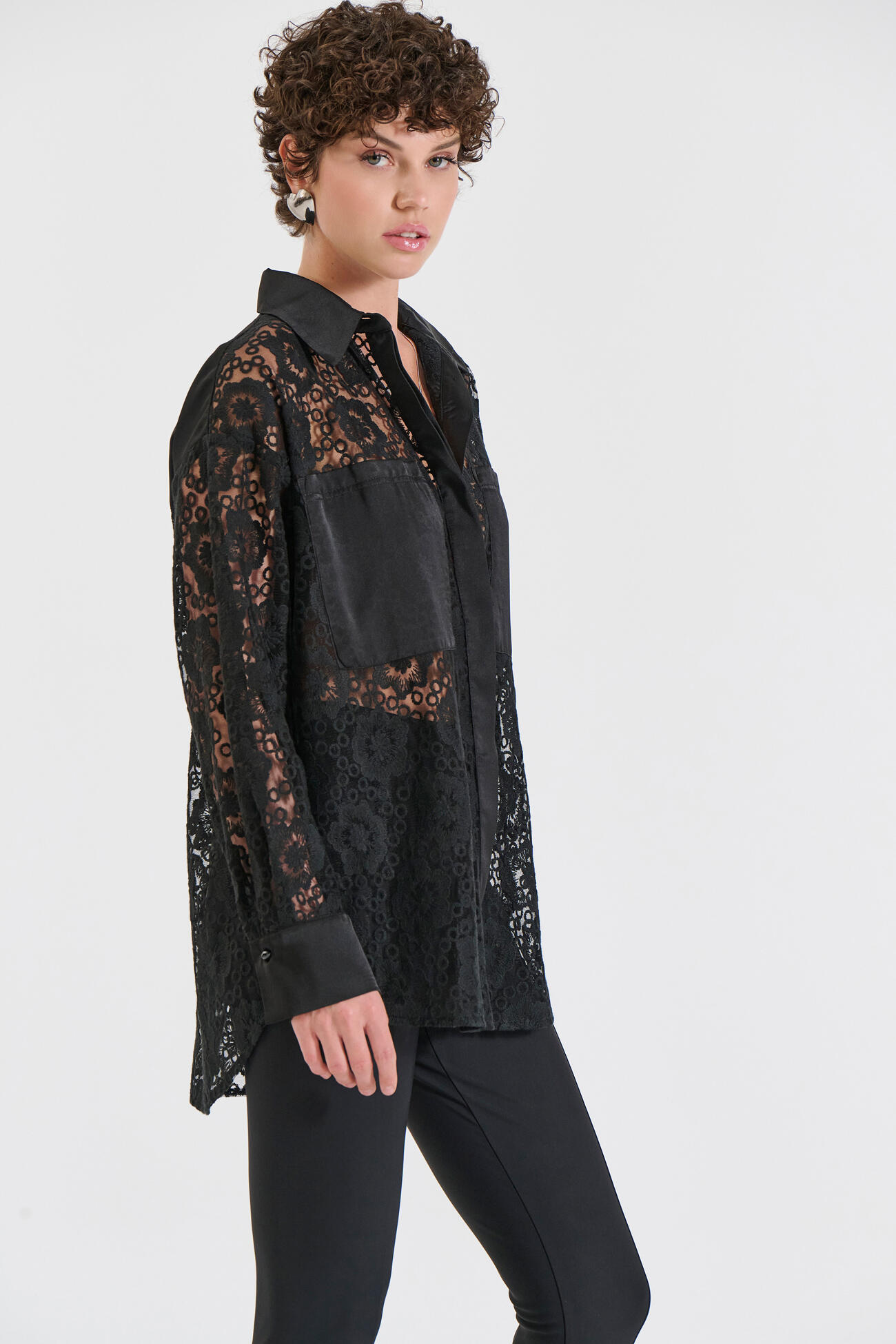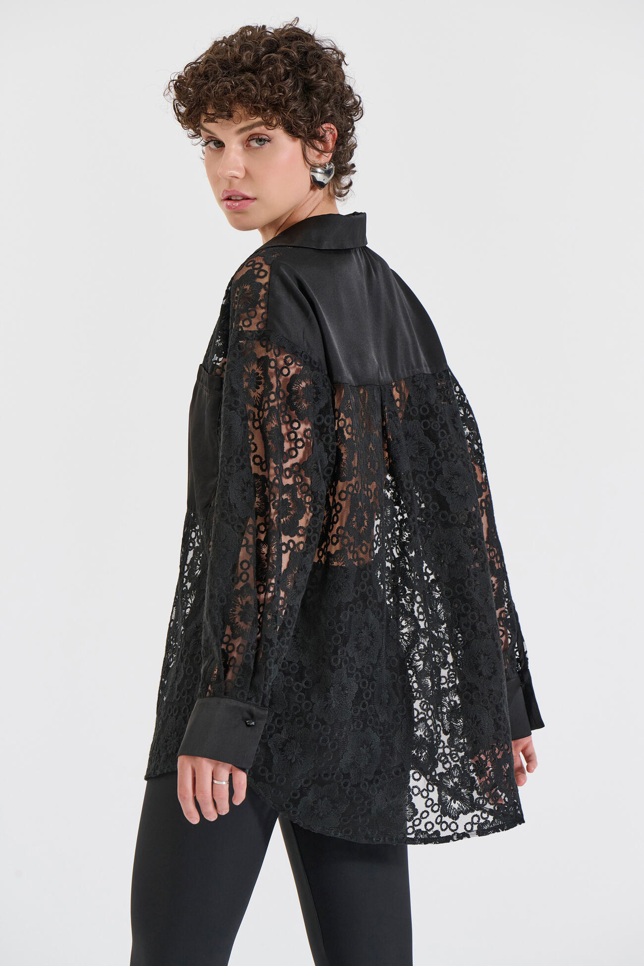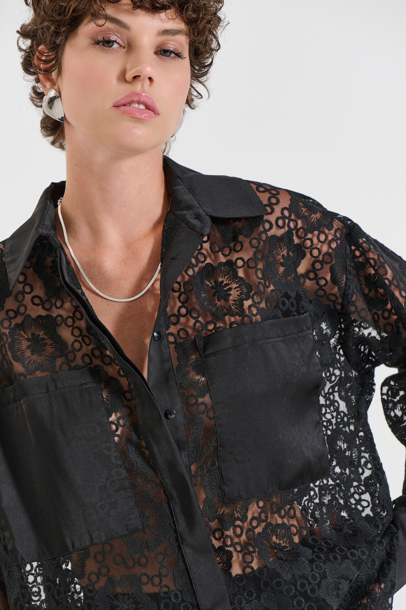 Κομψό βαμβακερό πουκάμισο με ανάγλυφη δαντέλα σε floral μοτίβο που δημιουργεί διακριτική διαφάνεια και elegant αισθητική. Διαθέτει satin λεπτομέρειες προσφέροντας refined αντίθεση υφών.