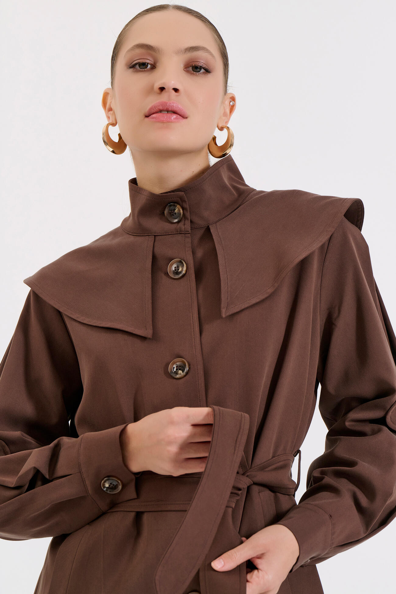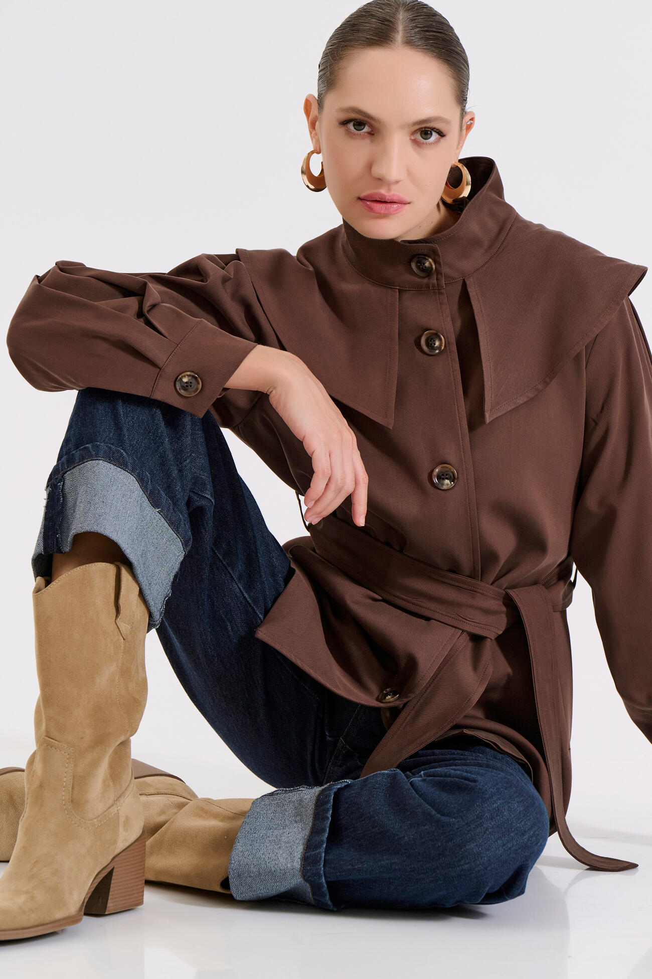 Κλασική καμπαρντίνα σε μοντέρνα γραμμή, με εντυπωσιακό μεγάλο γιακά και κουμπιά στο μπροστινό μέρος. Διαθέτει ζώνη που τονίζει τη μέση και πρακτικές τσέπες στο πλάι. Ένα διαχρονικό κομμάτι που συνδυάζει κομψότητα και άνεση, ιδανικό για τις μεταβατικές εποχές.