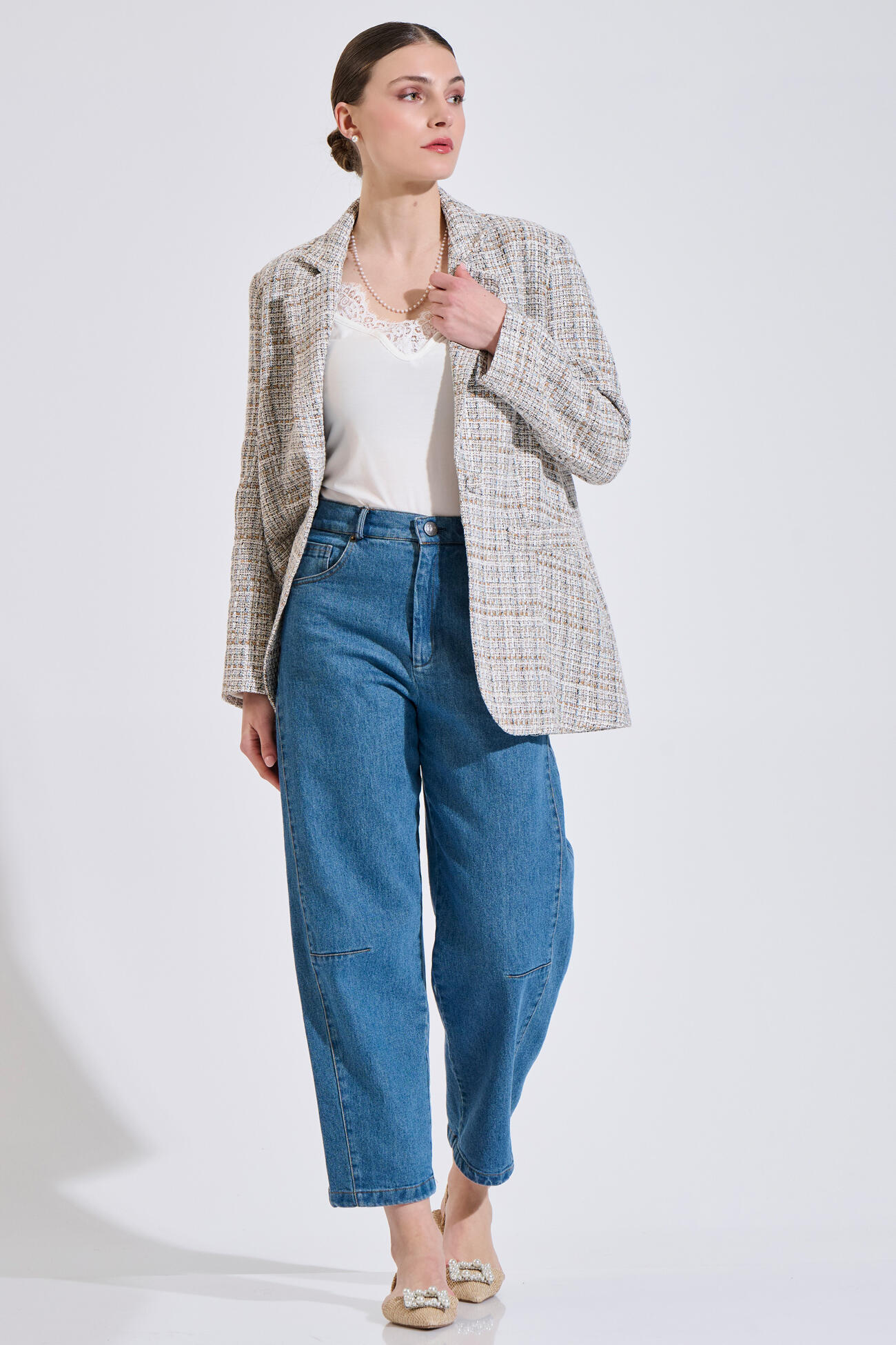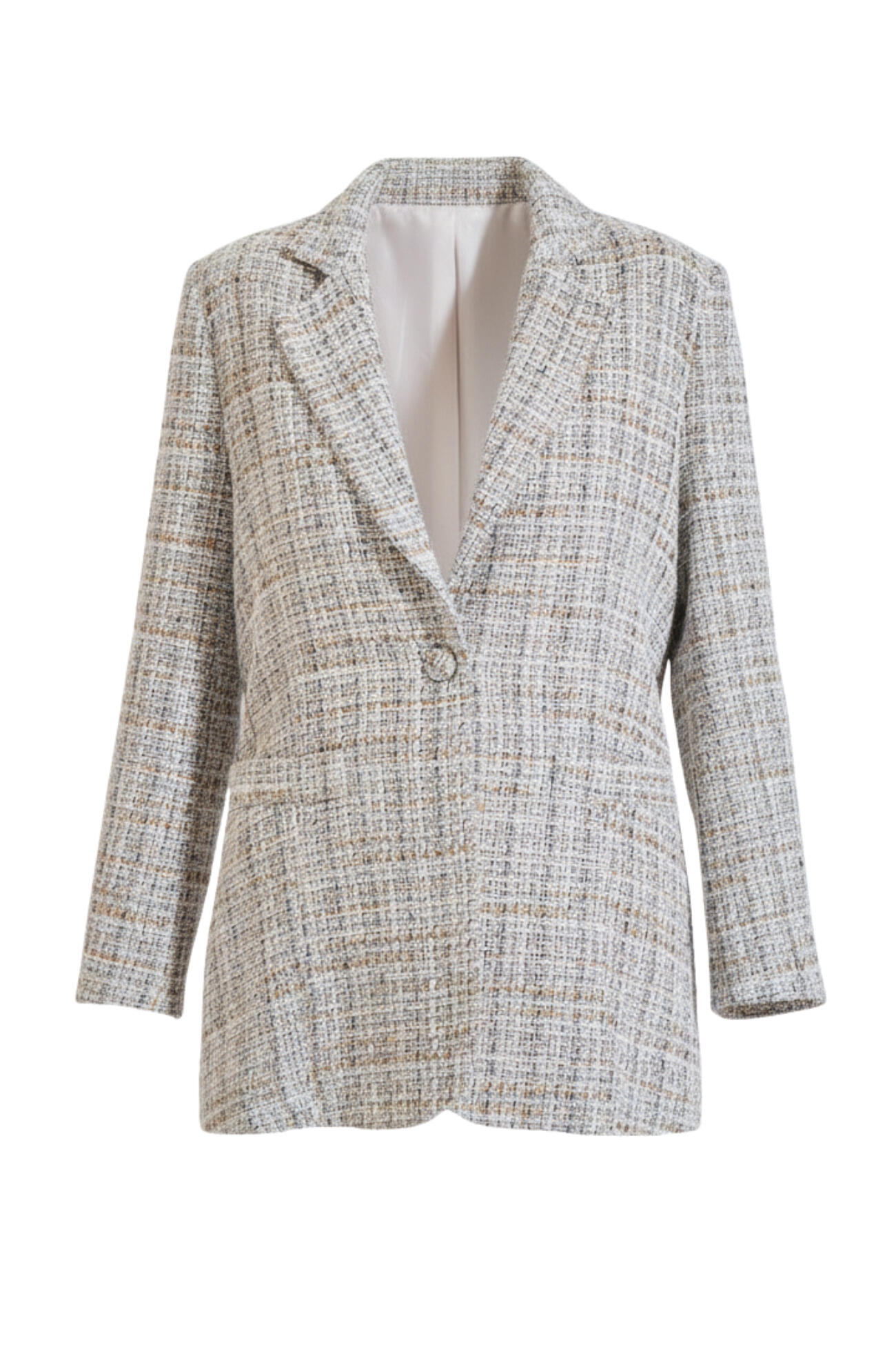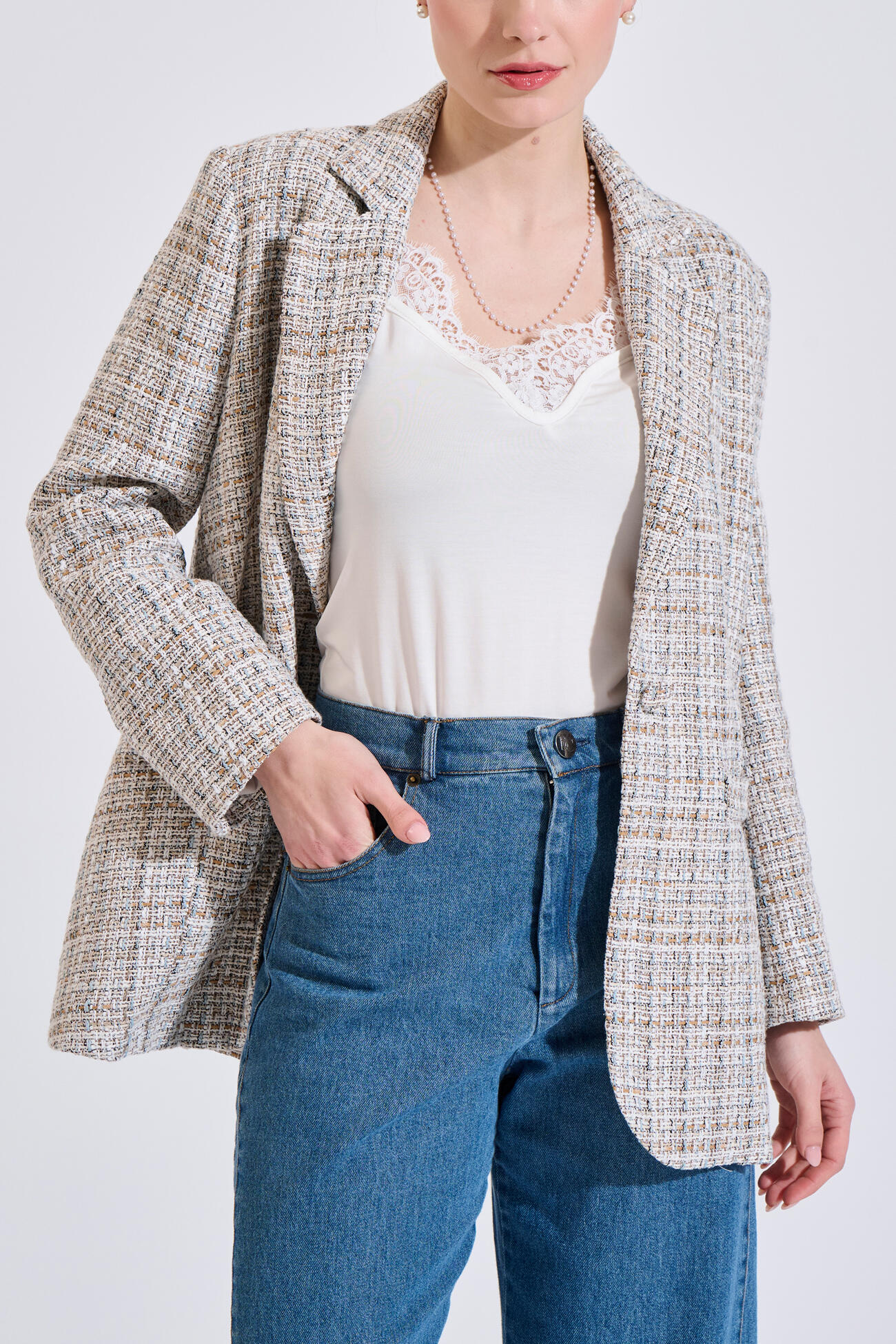 Σακάκι από tweed ύφασμα με πέτο γιακά και μακρύ μανίκι. Διαθέτει διακριτική λάμψη και ψεύτικες τσέπες μπροστά. Ίσια γραμμή, κατάλληλο για καθημερινές και πιο προσεγμένες εμφανίσεις.