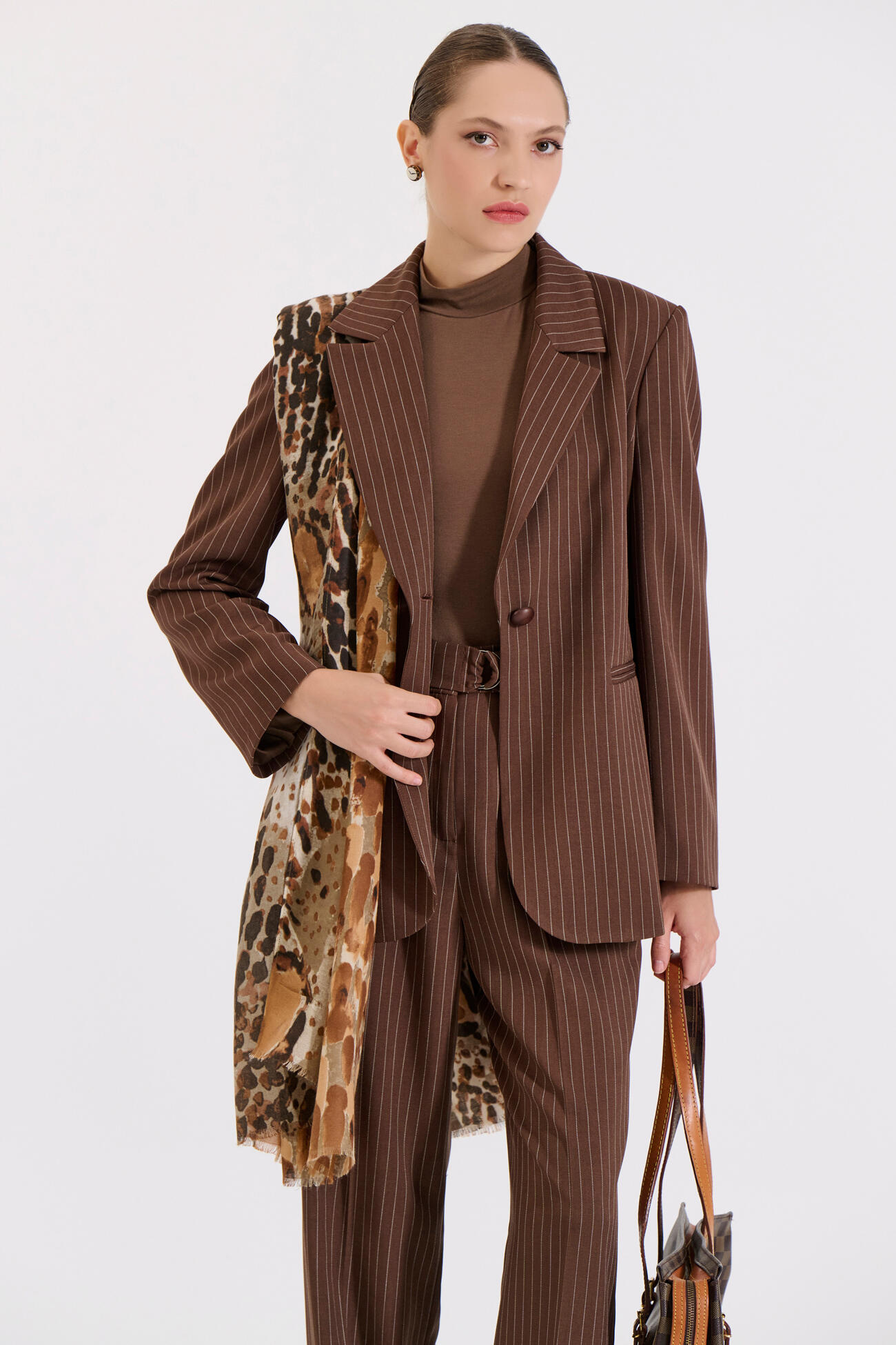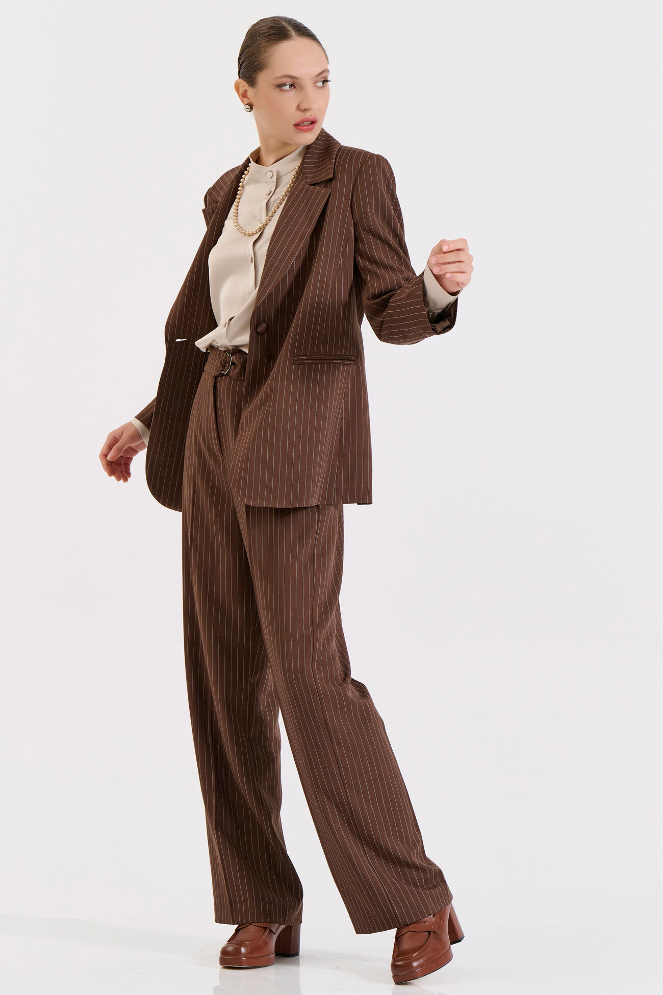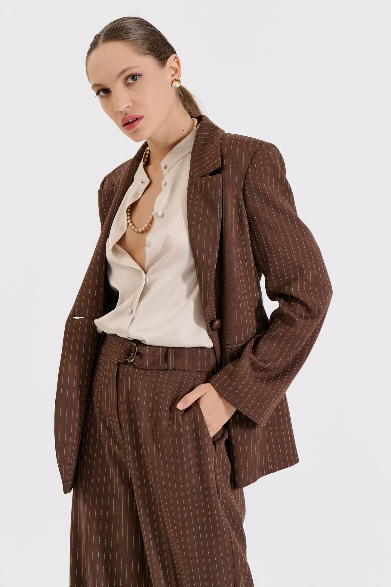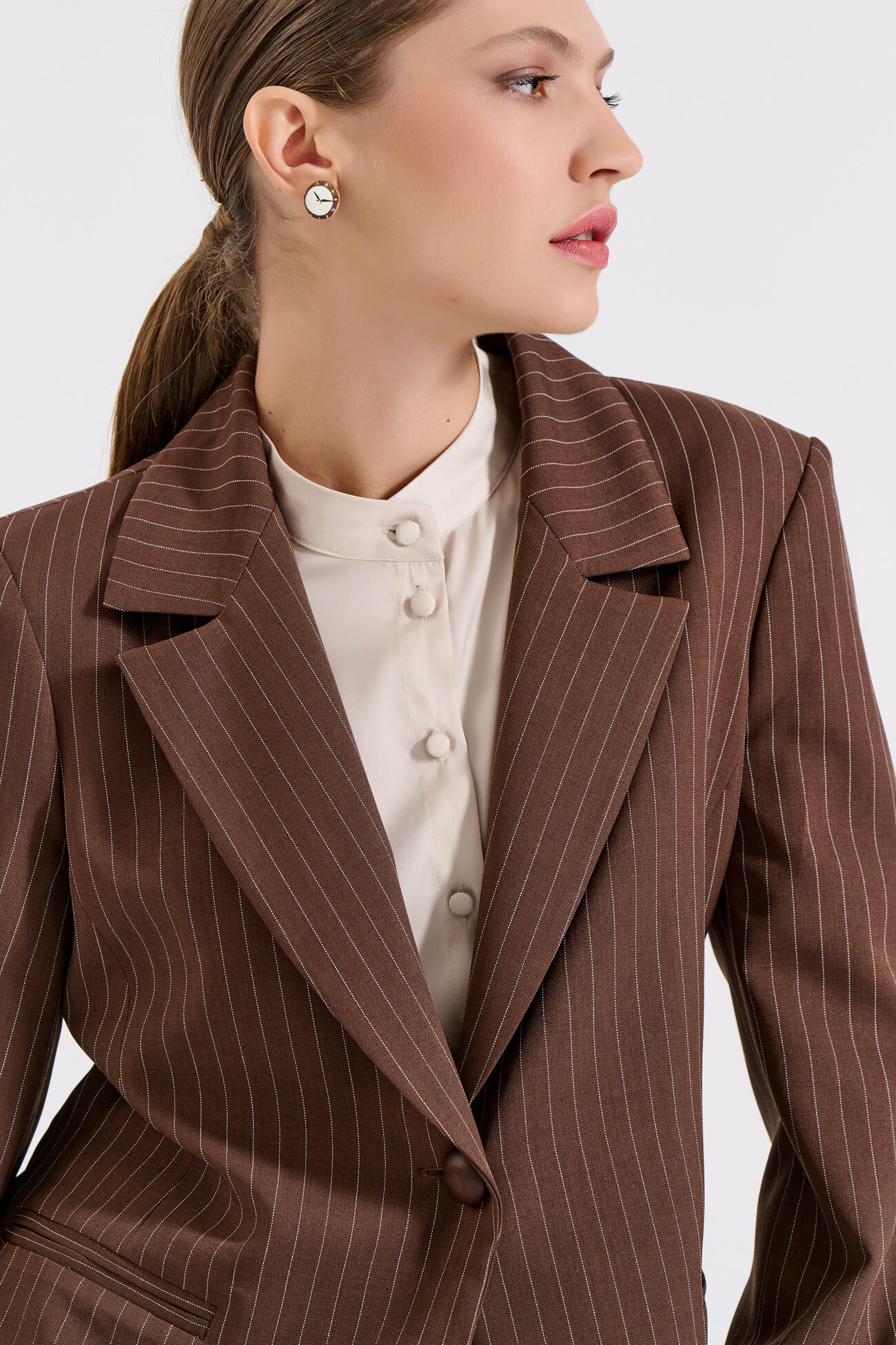 Κομψό γυναικείο σακάκι με κάθετες ρίγες που χαρίζουν μοντέρνα αισθητική. Διαθέτει πέτο γιακά, μπροστινό κλείσιμο με κουμπί και ζώνη στο πίσω μέρος που προσθέτει θηλυκή λεπτομέρεια και αναδεικνύει τη μέση.
