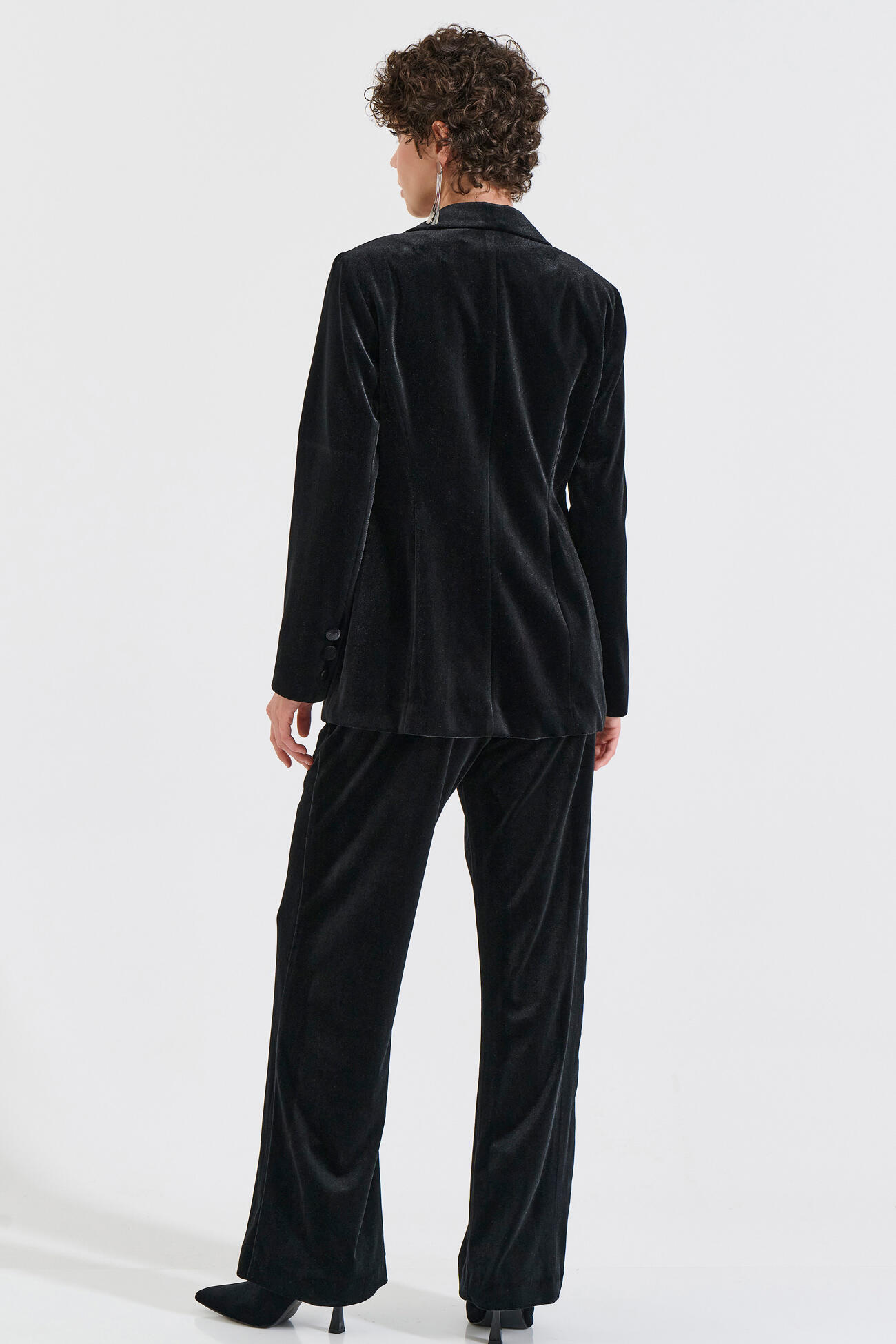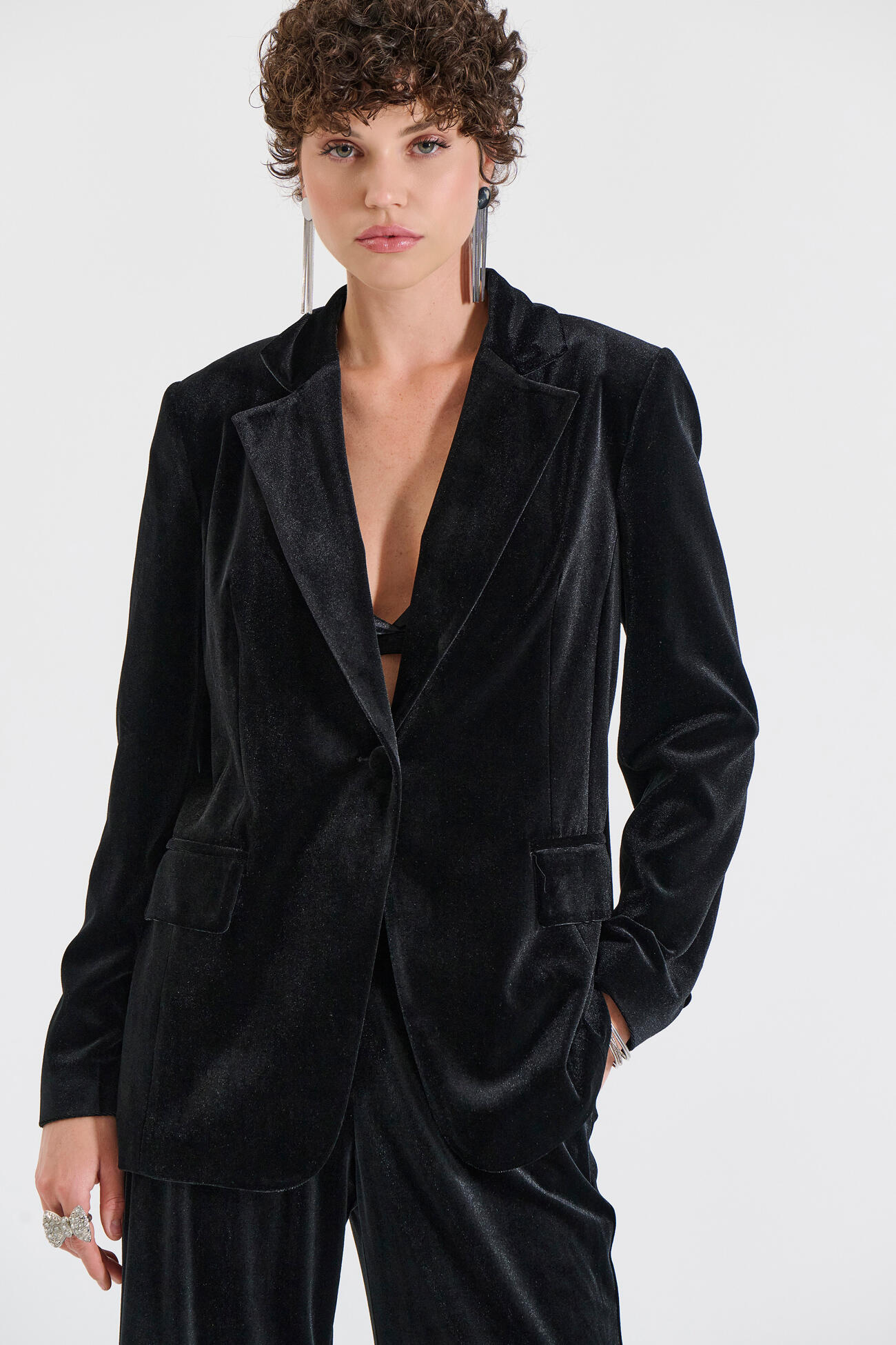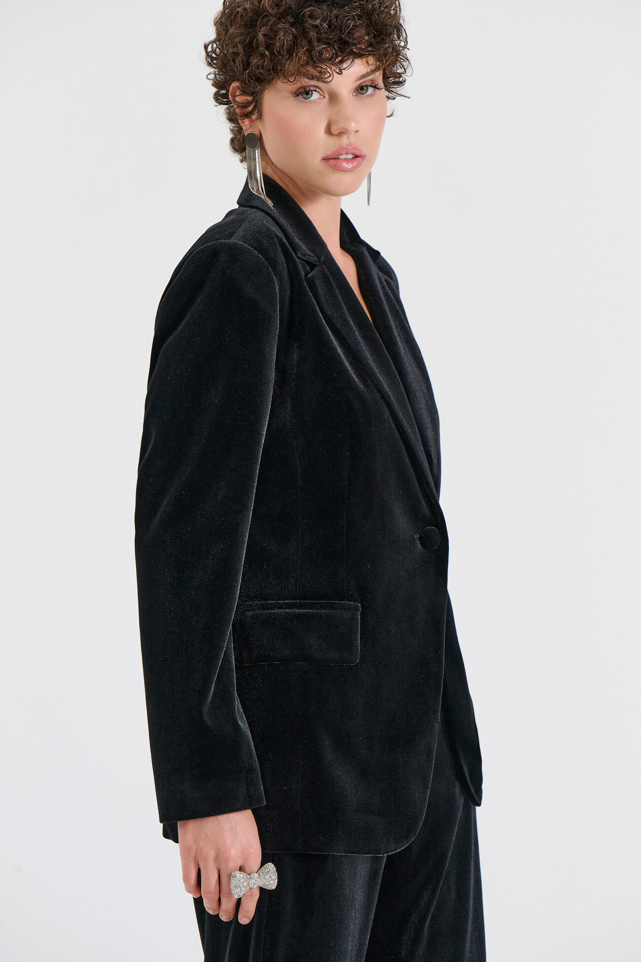Σακάκι από απαλό βελούδο με διαχρονικό πέτο και μονό κουμπί μπροστά. Η απαλή υφή του προσθέτει μια διακριτική λάμψη, ενώ η άνετη γραμμή του το καθιστά ιδανικό για elegant εμφανίσεις από το πρωί έως το βράδυ. Διαθέτει τσέπες με καπάκι που ολοκληρώνουν το refined look. Συνδυάζεται υπέροχα με τα αντίστοιχα βελούδινα παντελόνια της συλλογής 10-210164-0 και 10-210167-0 για ένα ολοκληρωμένο, premium σύνολο.