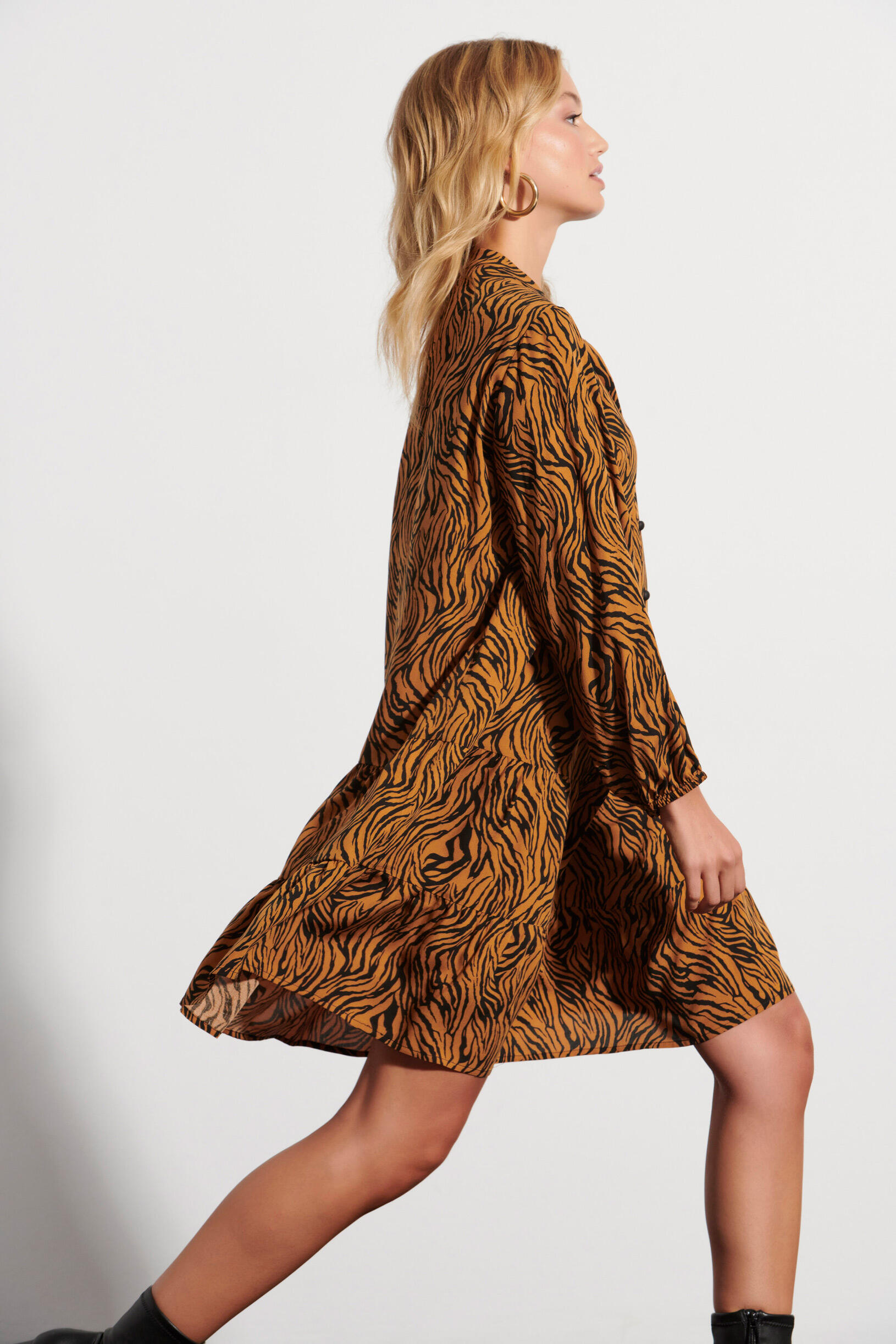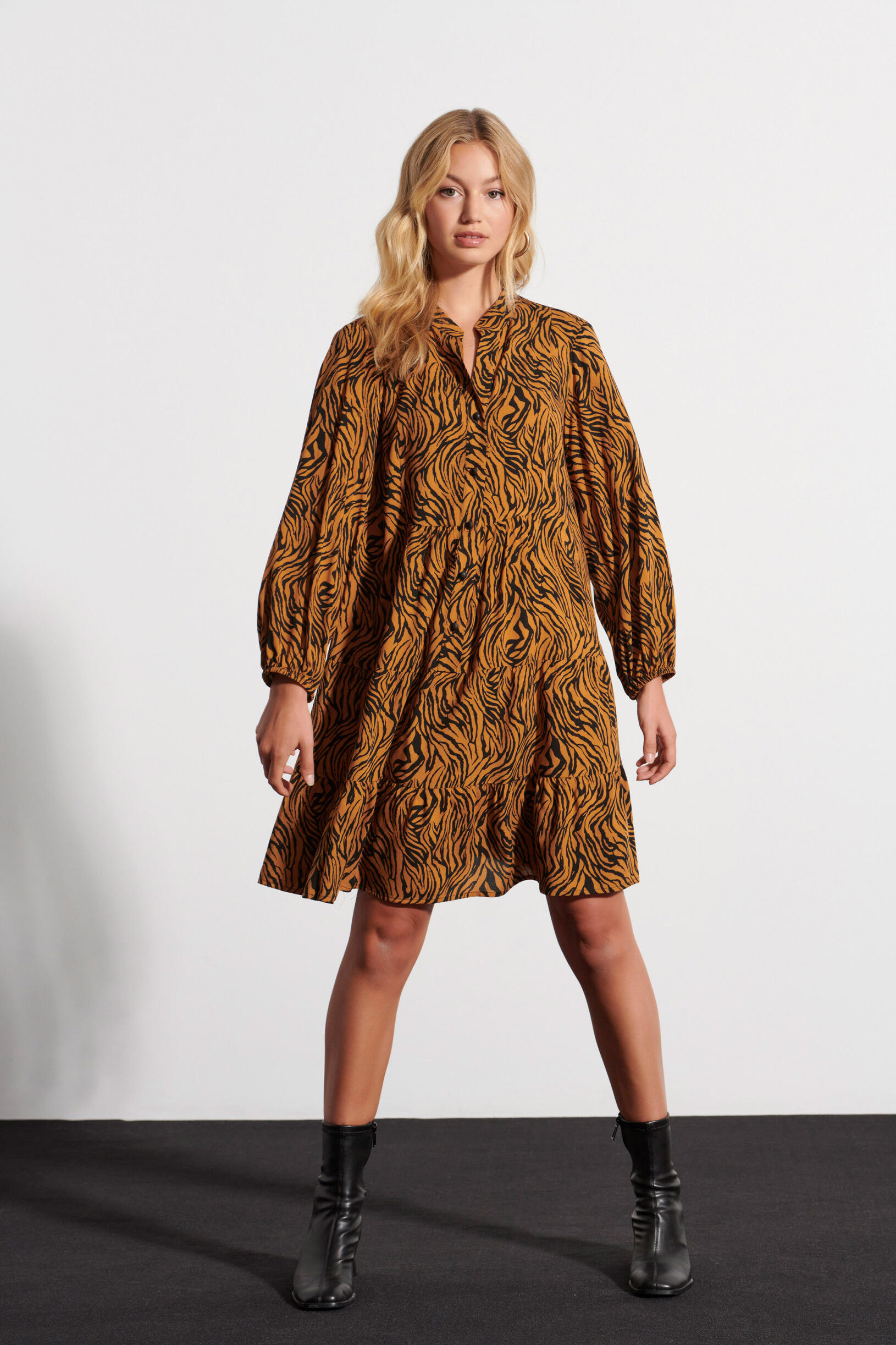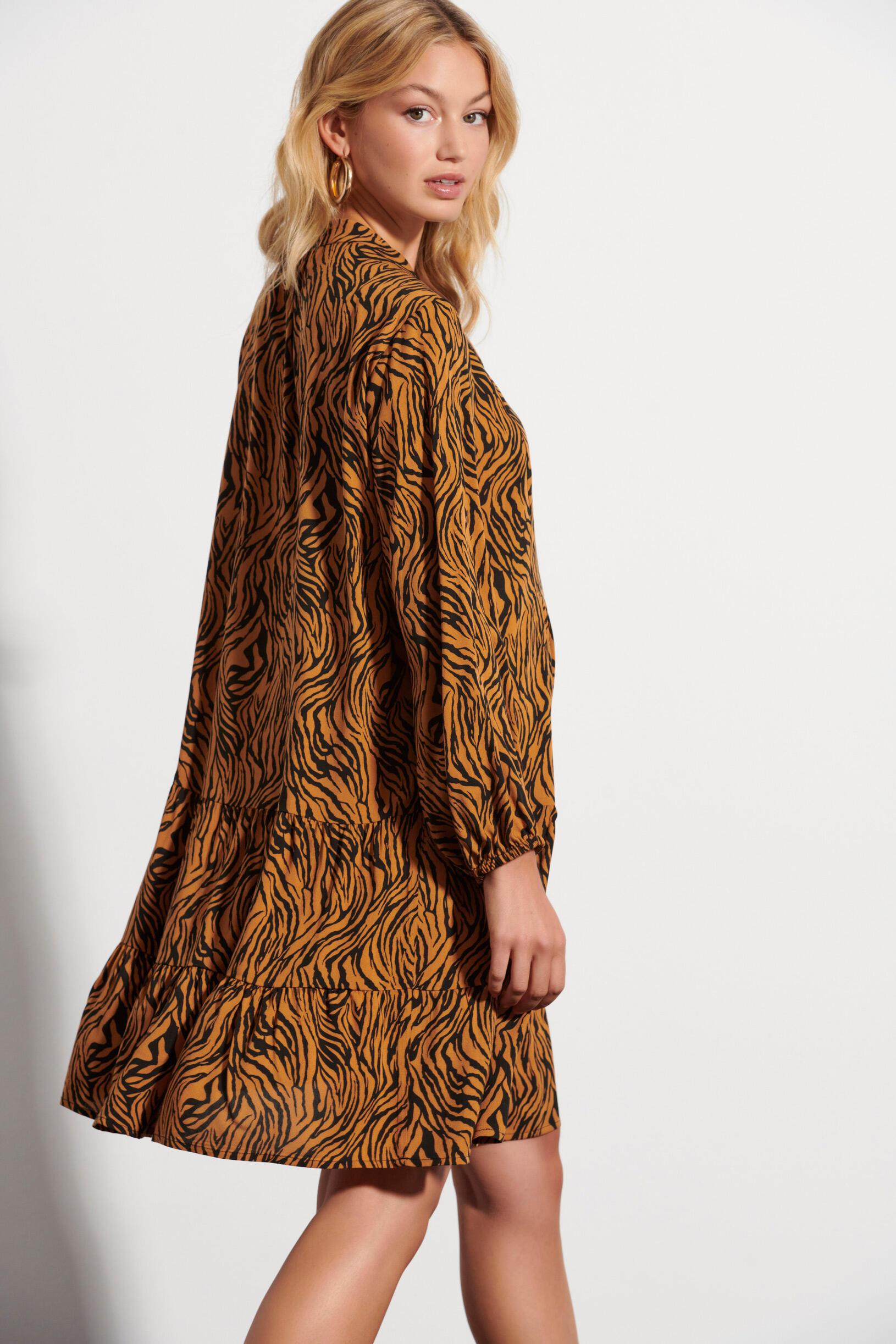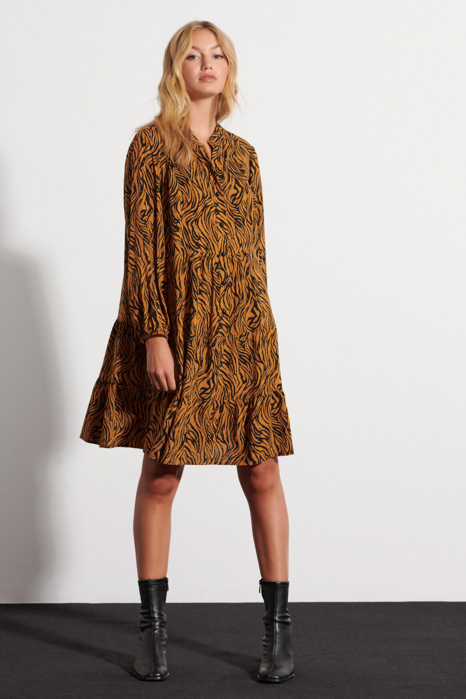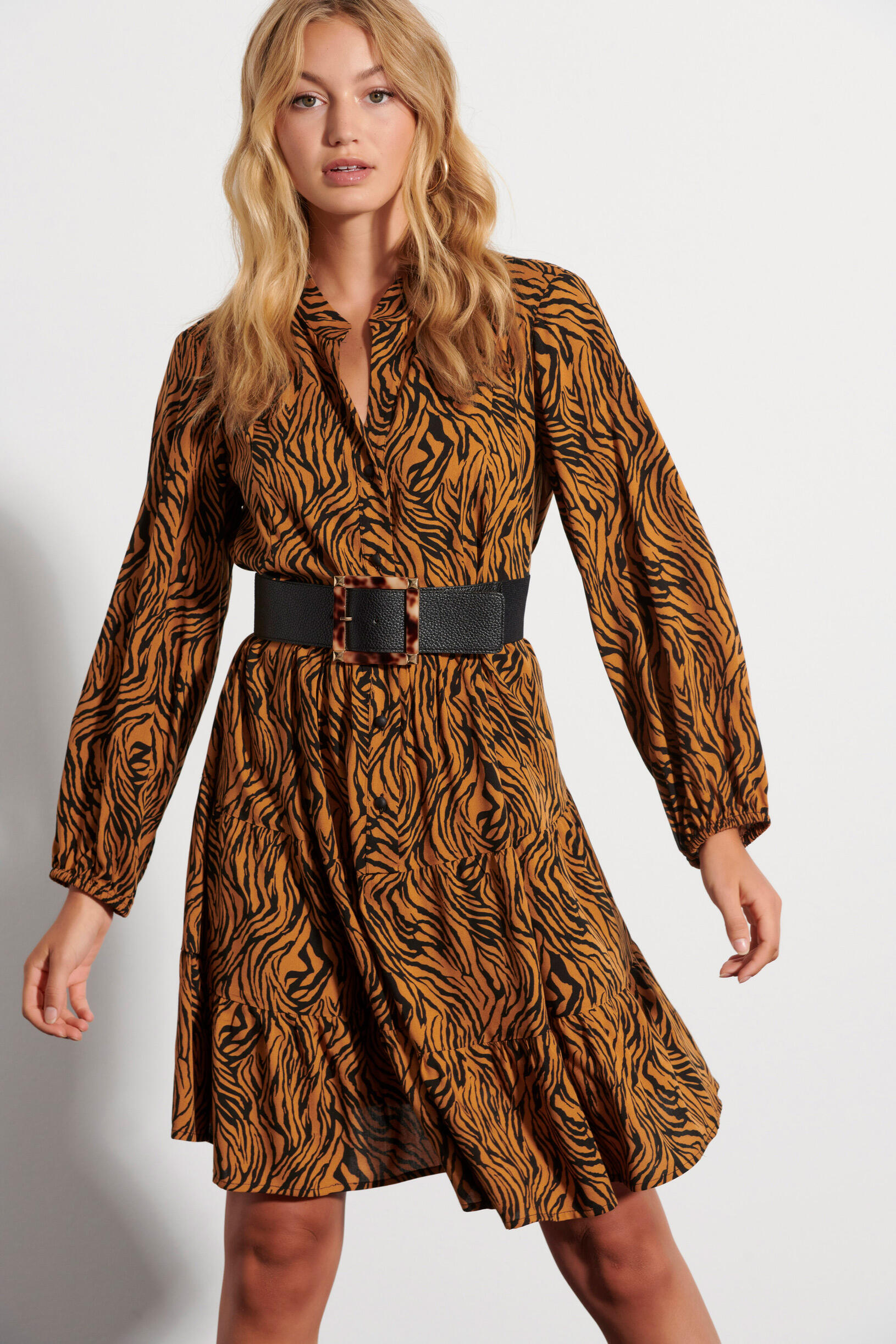 Φόρεμα animal print Κωδικός 10-341887-0 Περιγραφή Mini animal print φόρεμα σε Α ανοιχτή γραμμή. Κλείσιμο μπροστά με κουμπιά και μακριά μανίκια που κλείνουν με λάστιχο στο κάτω μέρος. Σύνθεση 100% viscose