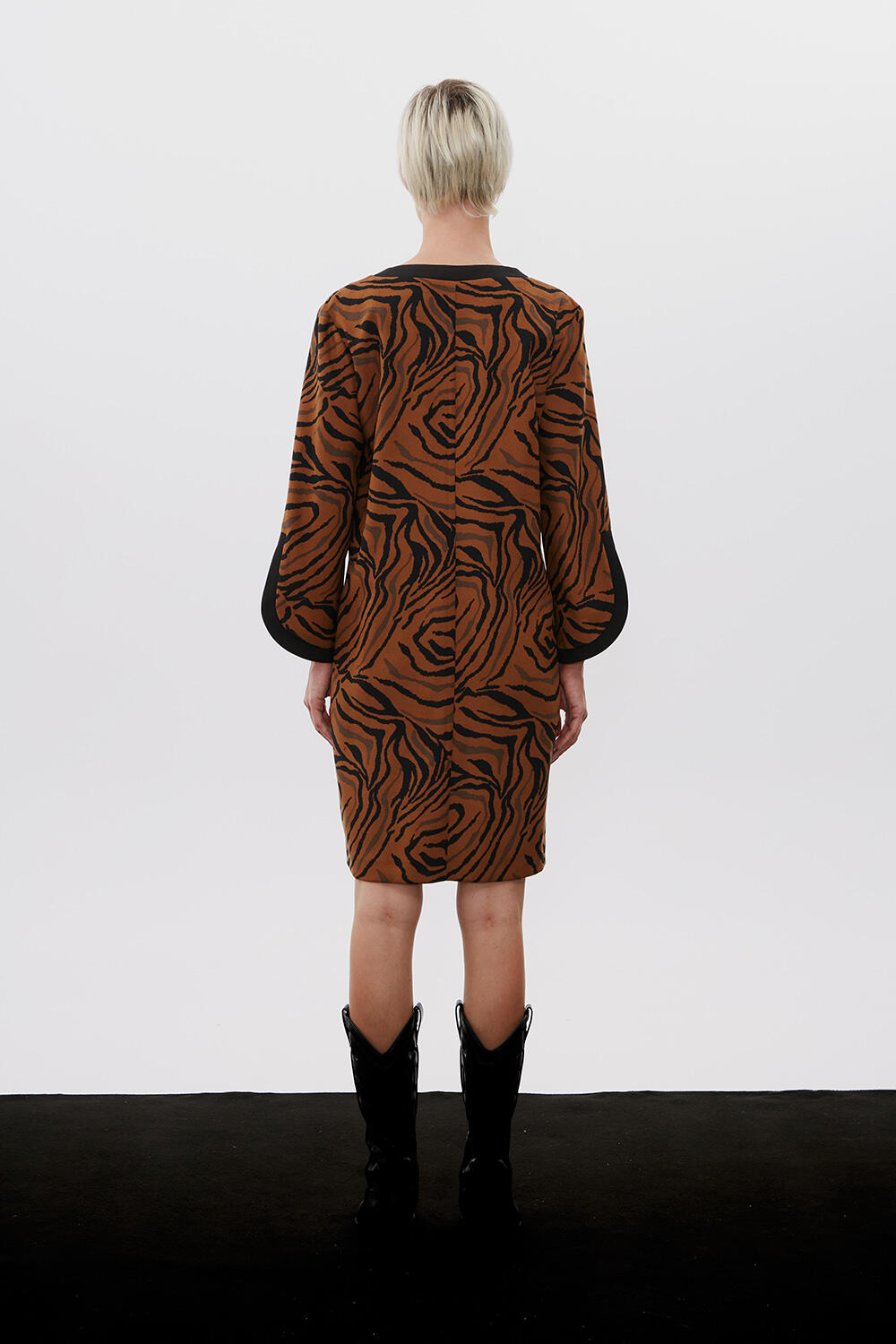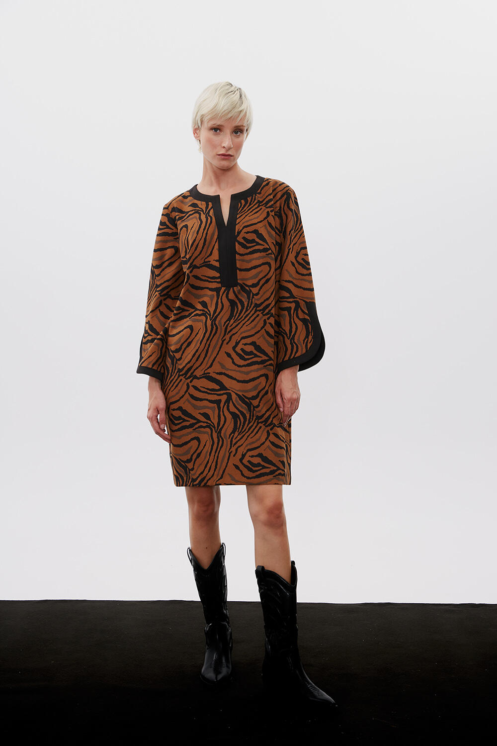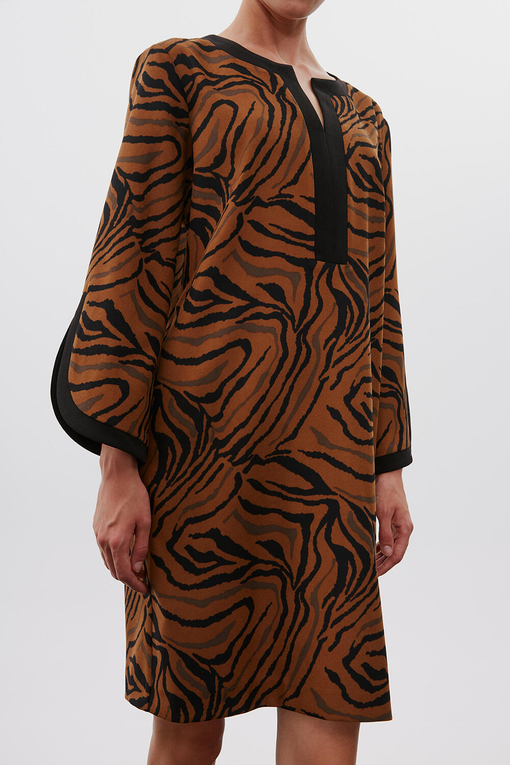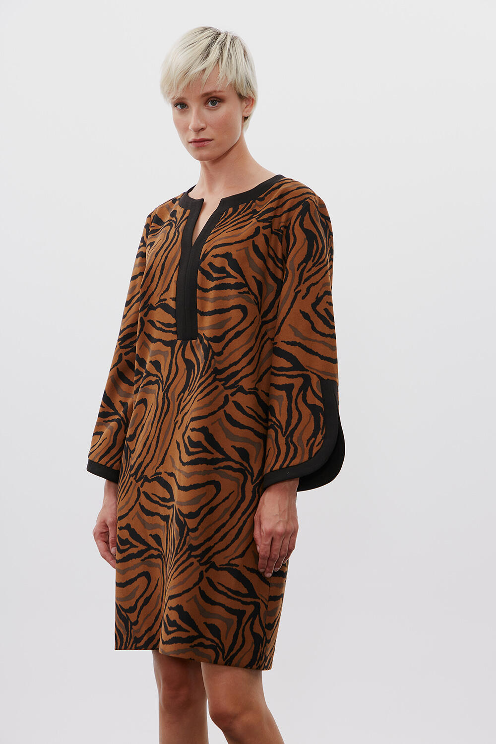 Φόρεμα animal print Κωδικός 10-342080-0 Περιγραφή Φόρεμα με animal print τύπωμα, μεσαίου μήκους σε ίσια γραμμή. Μάο γιακάς και συνδυασμός υφάσματων. Σύνθεση 85% polyester 15% viscose
