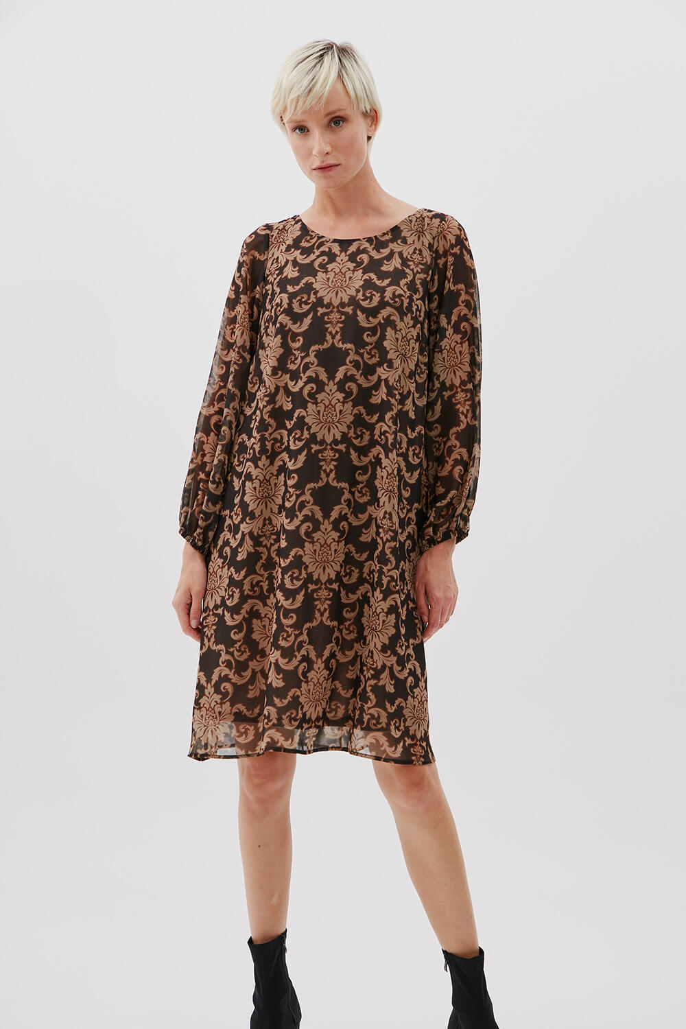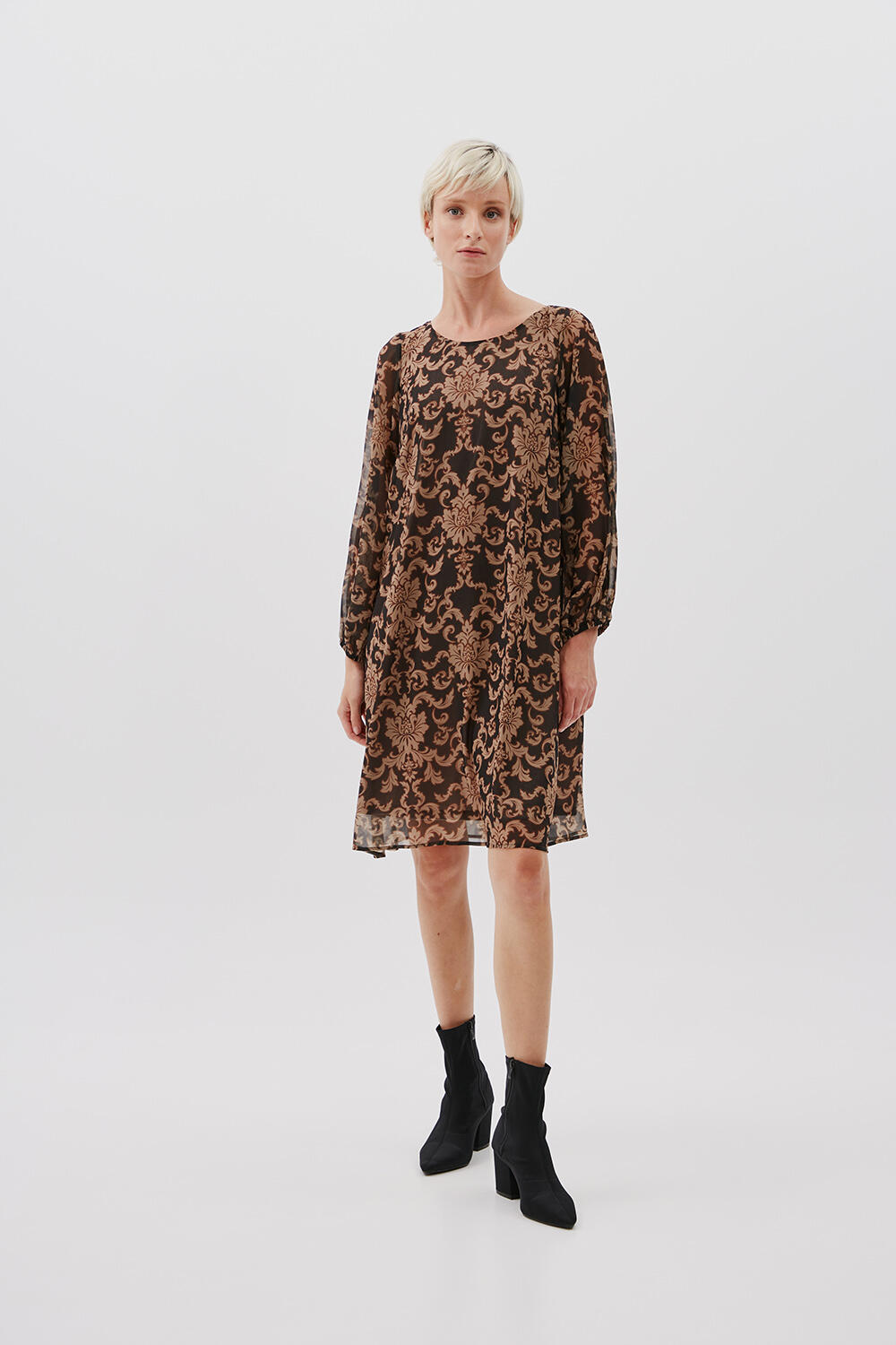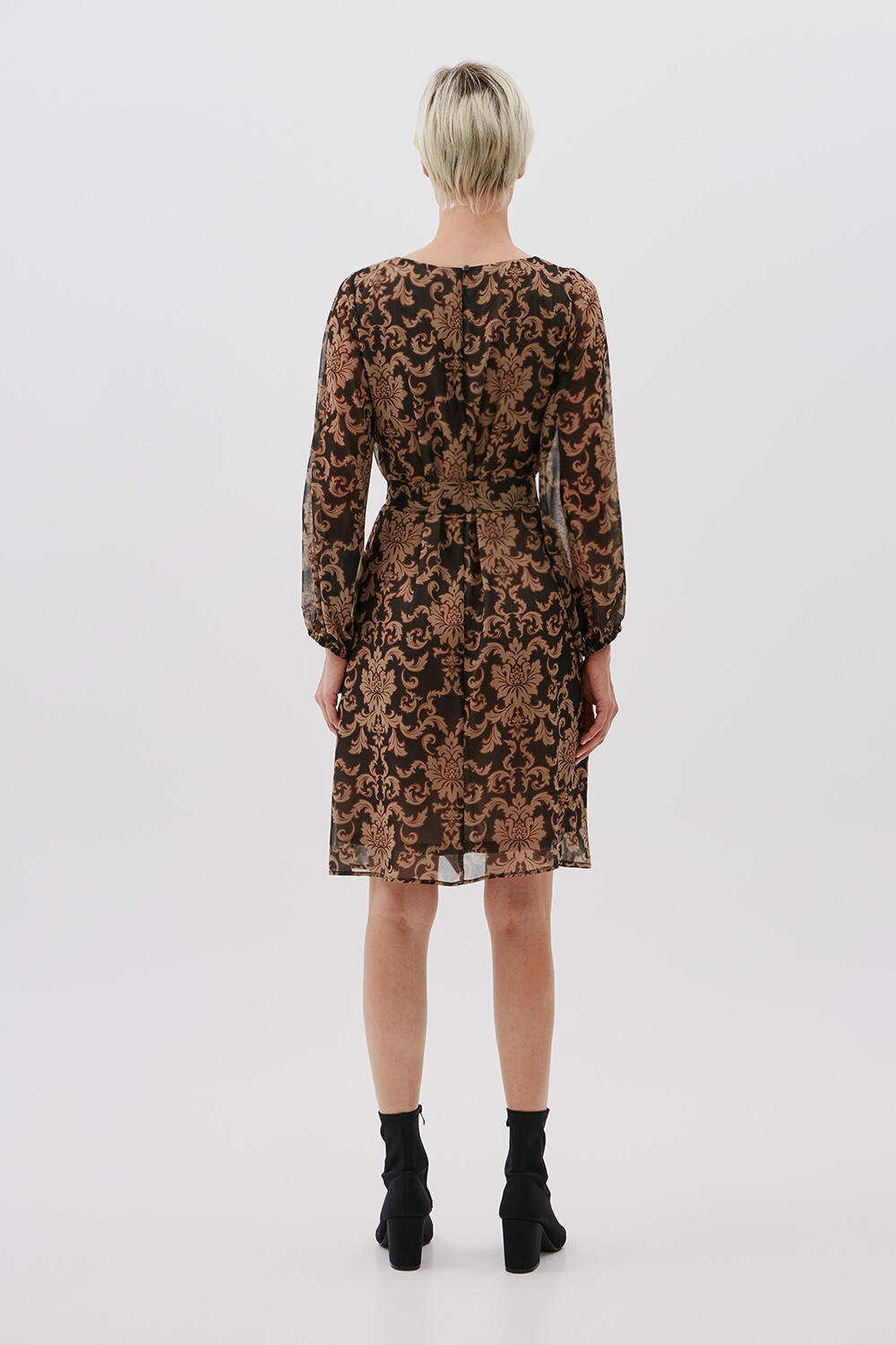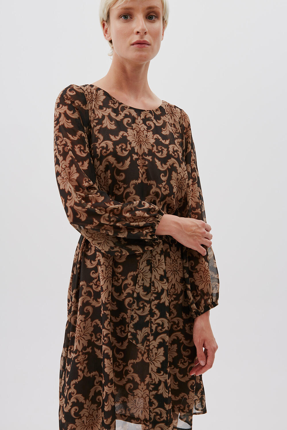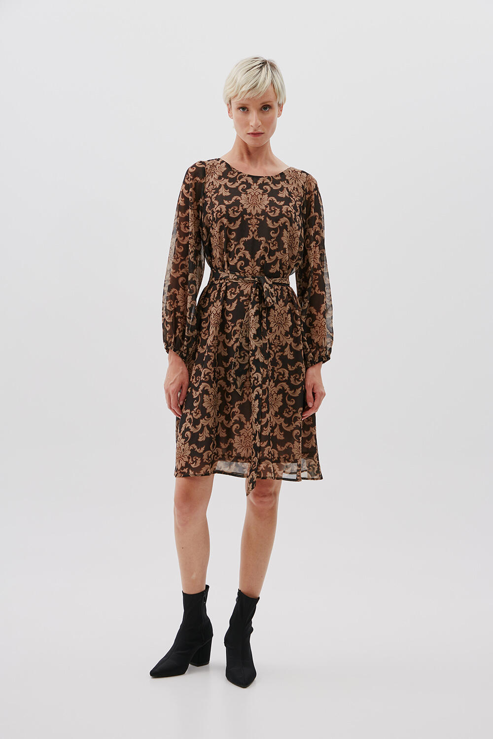Φόρεμα εμπριμέ με αποσπώμενη ζώνη. Διαθέτει διαφάνεια στα μανίκια και λάστιχο στο τελείωμα. Κλείσιμο με κουμπί στο πίσω μέρος του λαιμού.
