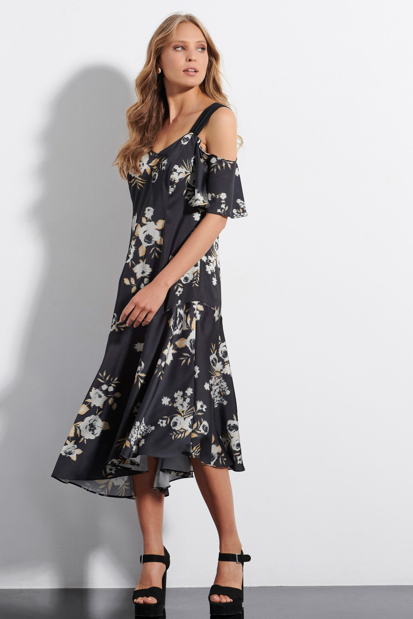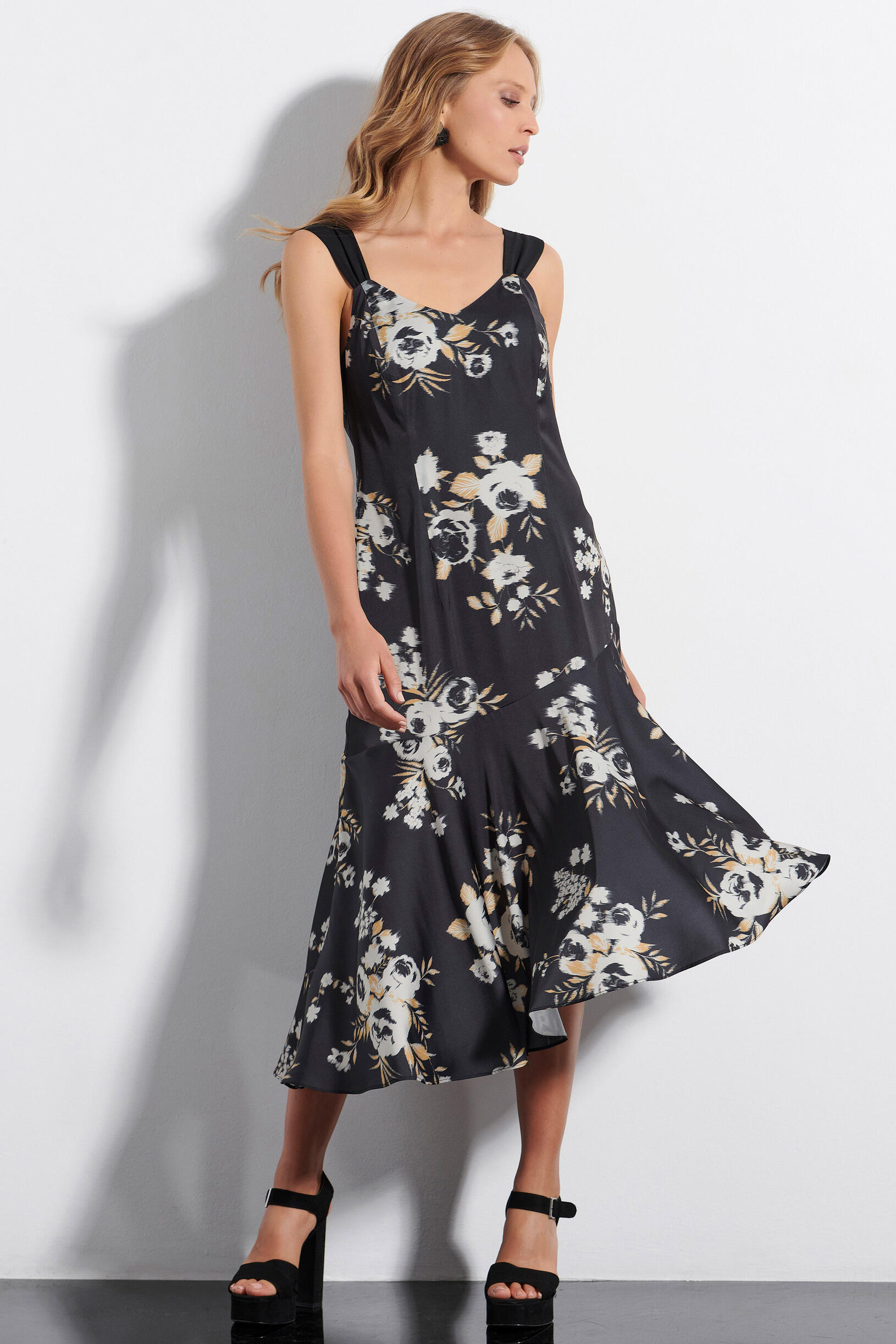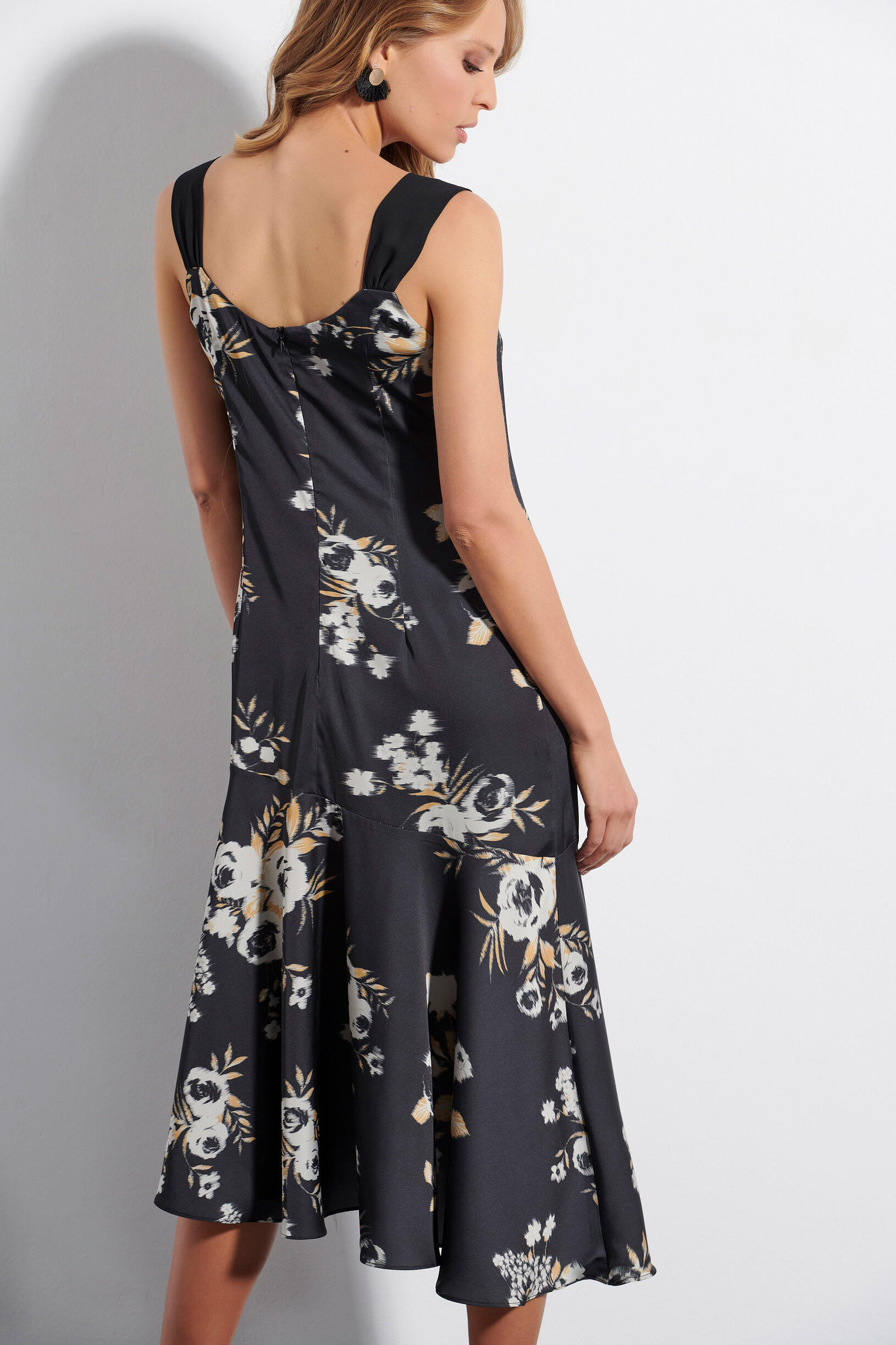Φόρεμα σατινέ με floral τύπωμα. Έχει φαρδιά τιράντα και σχέδιο με βολάν μανίκι, το οποίο κλείνει με κρυφό clip για να αφαιρείται από το φόρεμα όταν εσεις το επιθυμείτε.