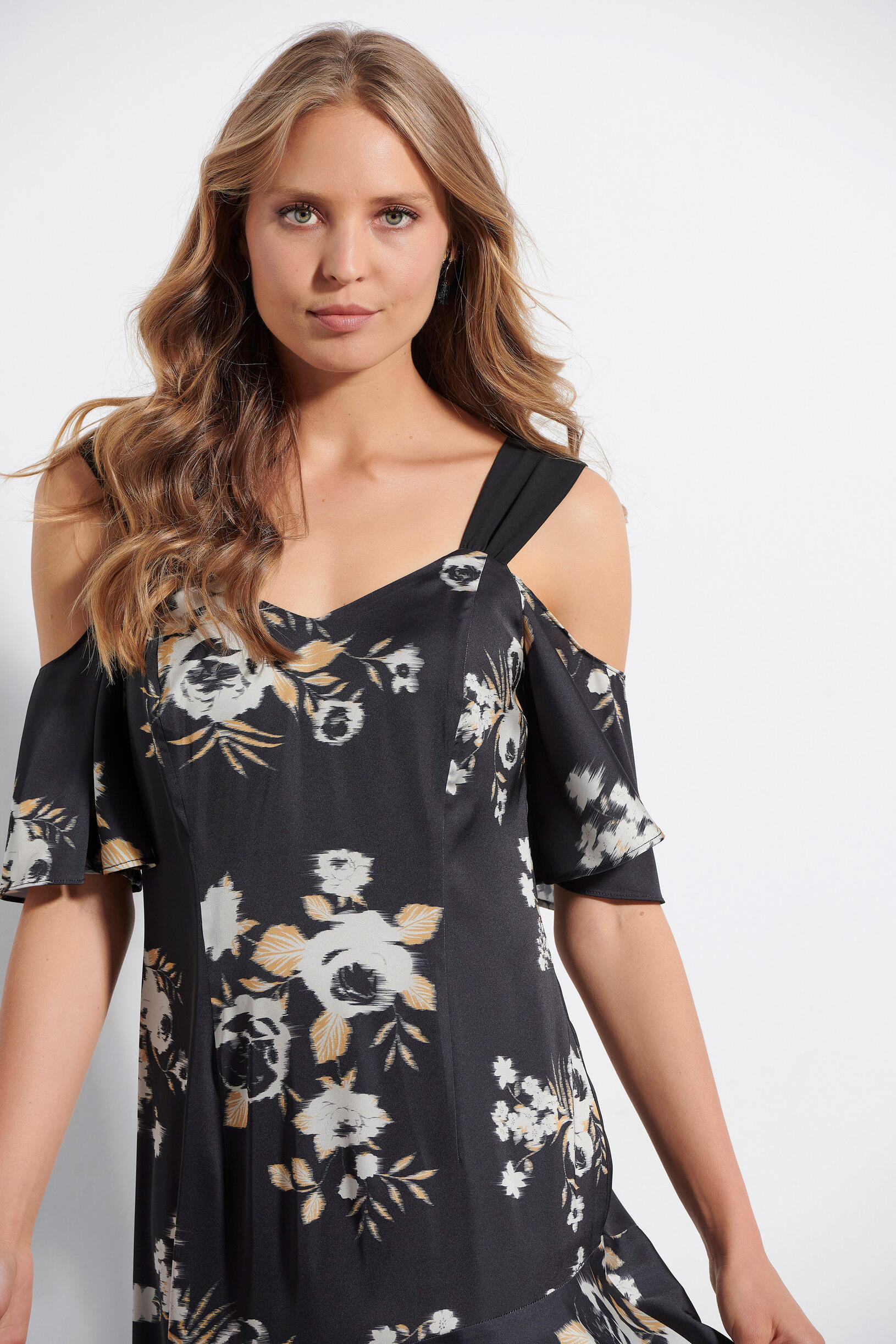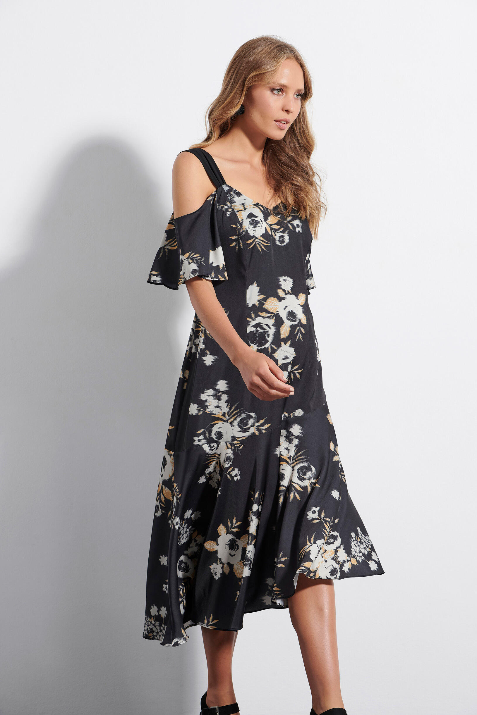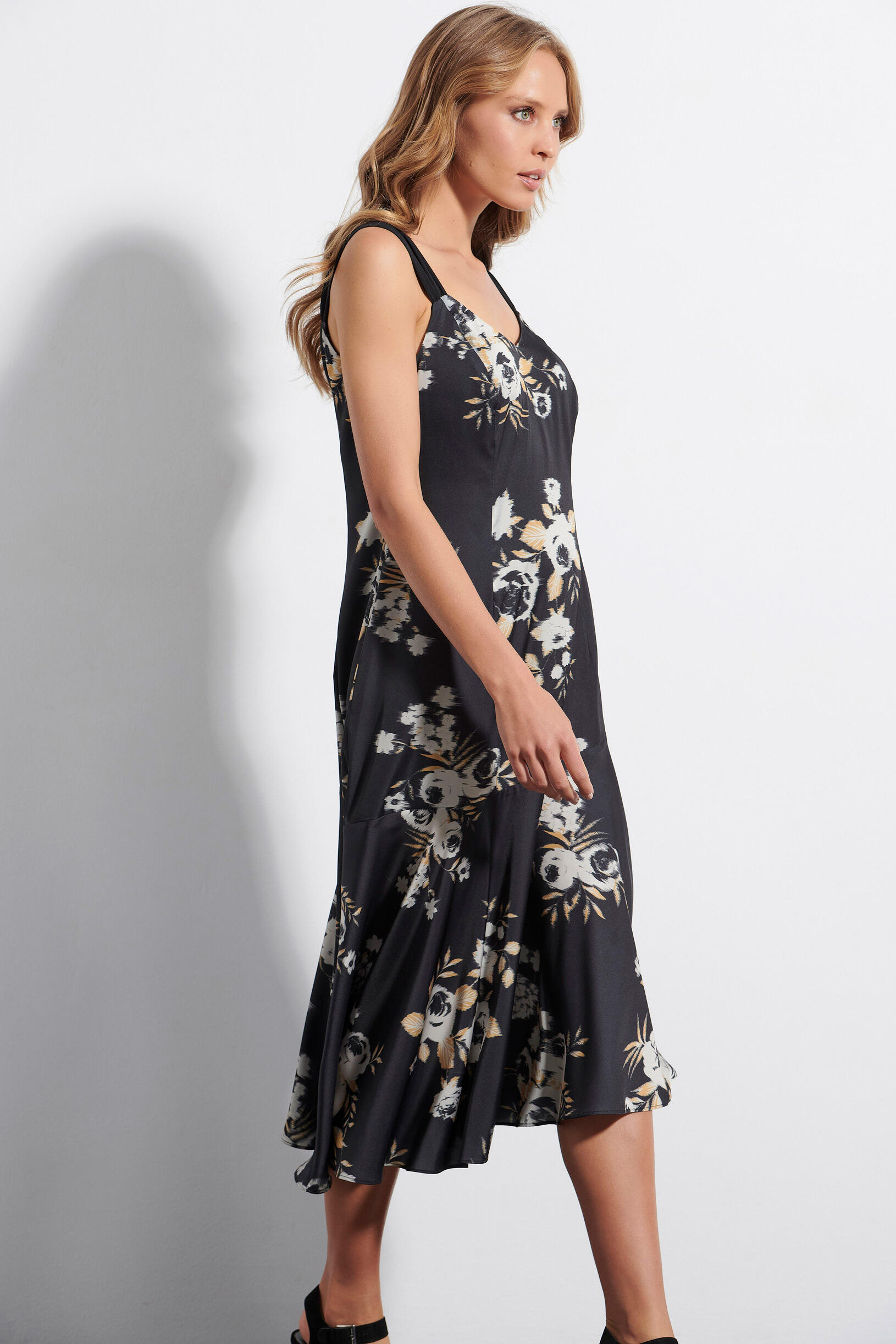 Φόρεμα σατινέ με floral τύπωμα. Έχει φαρδιά τιράντα και σχέδιο με βολάν μανίκι, το οποίο κλείνει με κρυφό clip για να αφαιρείται από το φόρεμα όταν εσεις το επιθυμείτε.